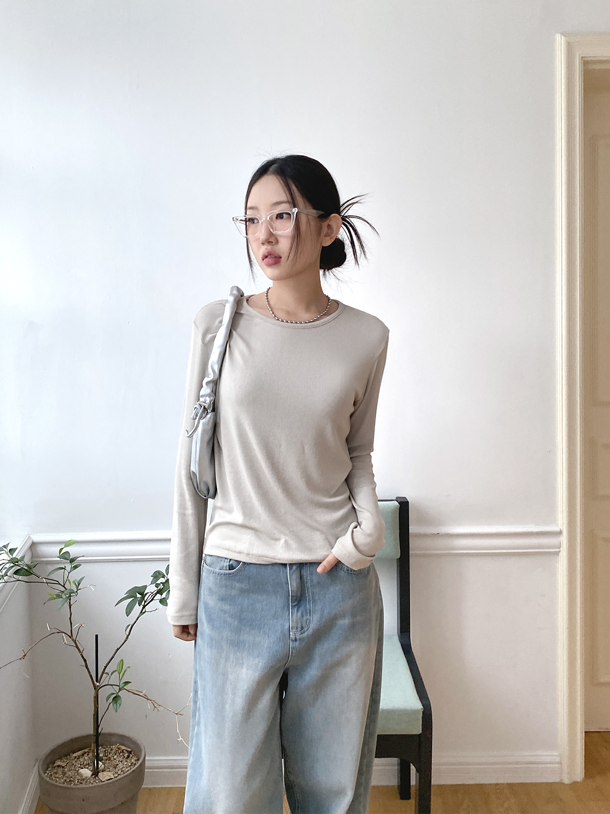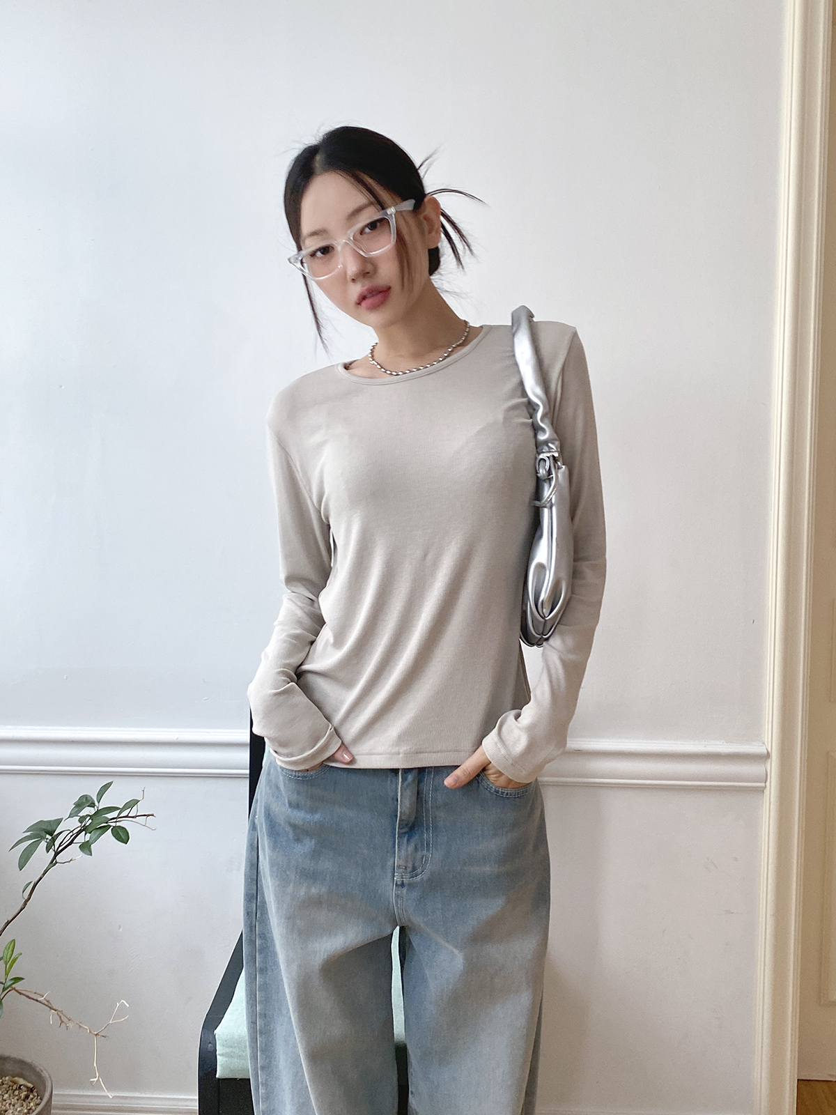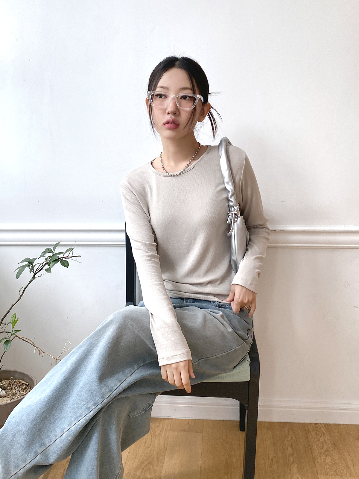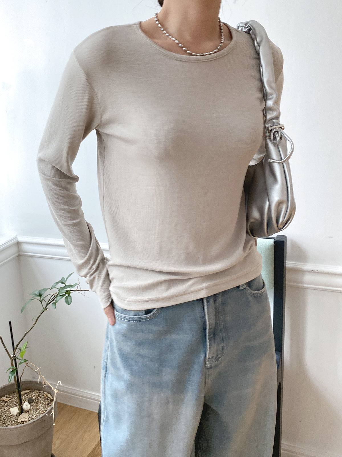 스탠다드한 디자인으로 깔끔하게 떨어지는 실루엣이 매력적인 골지 긴팔티에요!