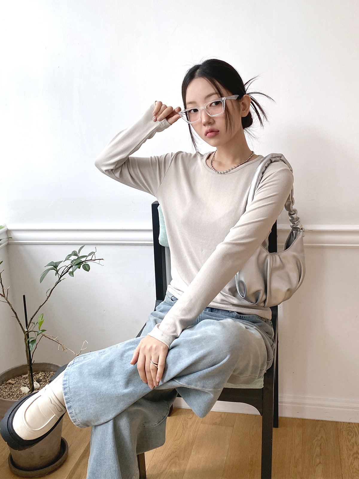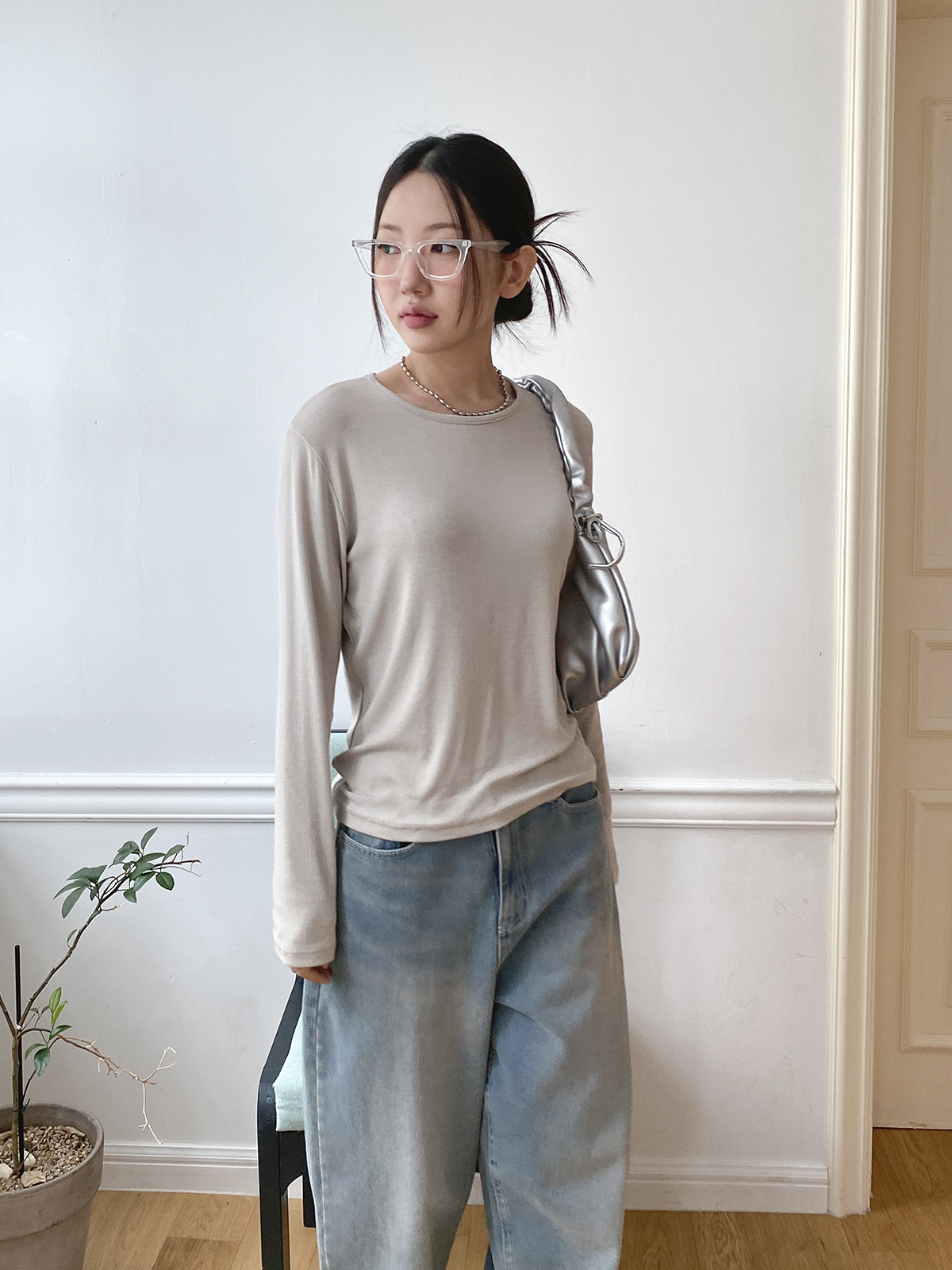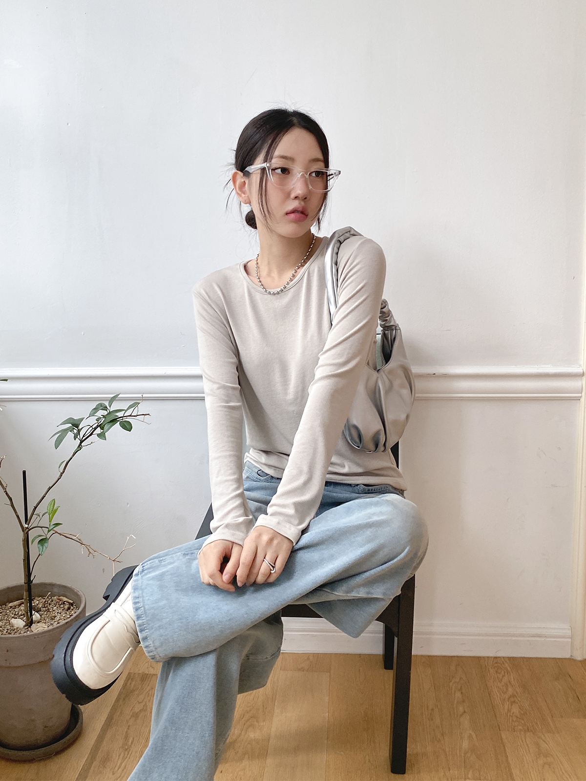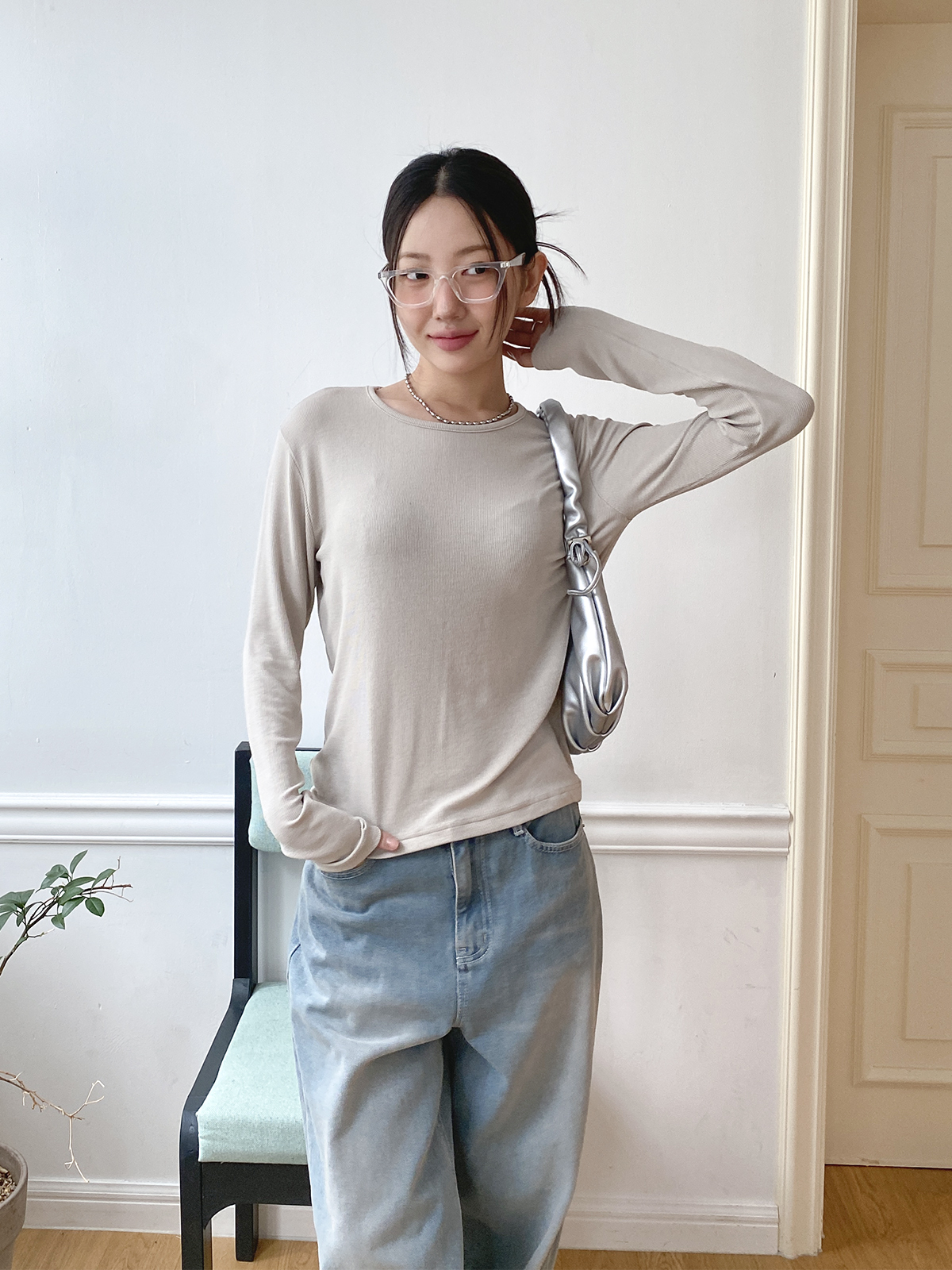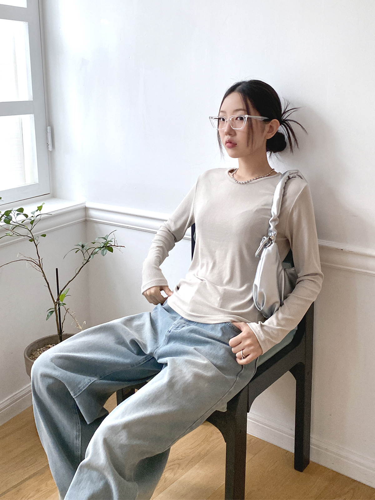 스탠다드한 디자인으로 깔끔하게 떨어지는 실루엣이 매력적인 골지 긴팔티에요!