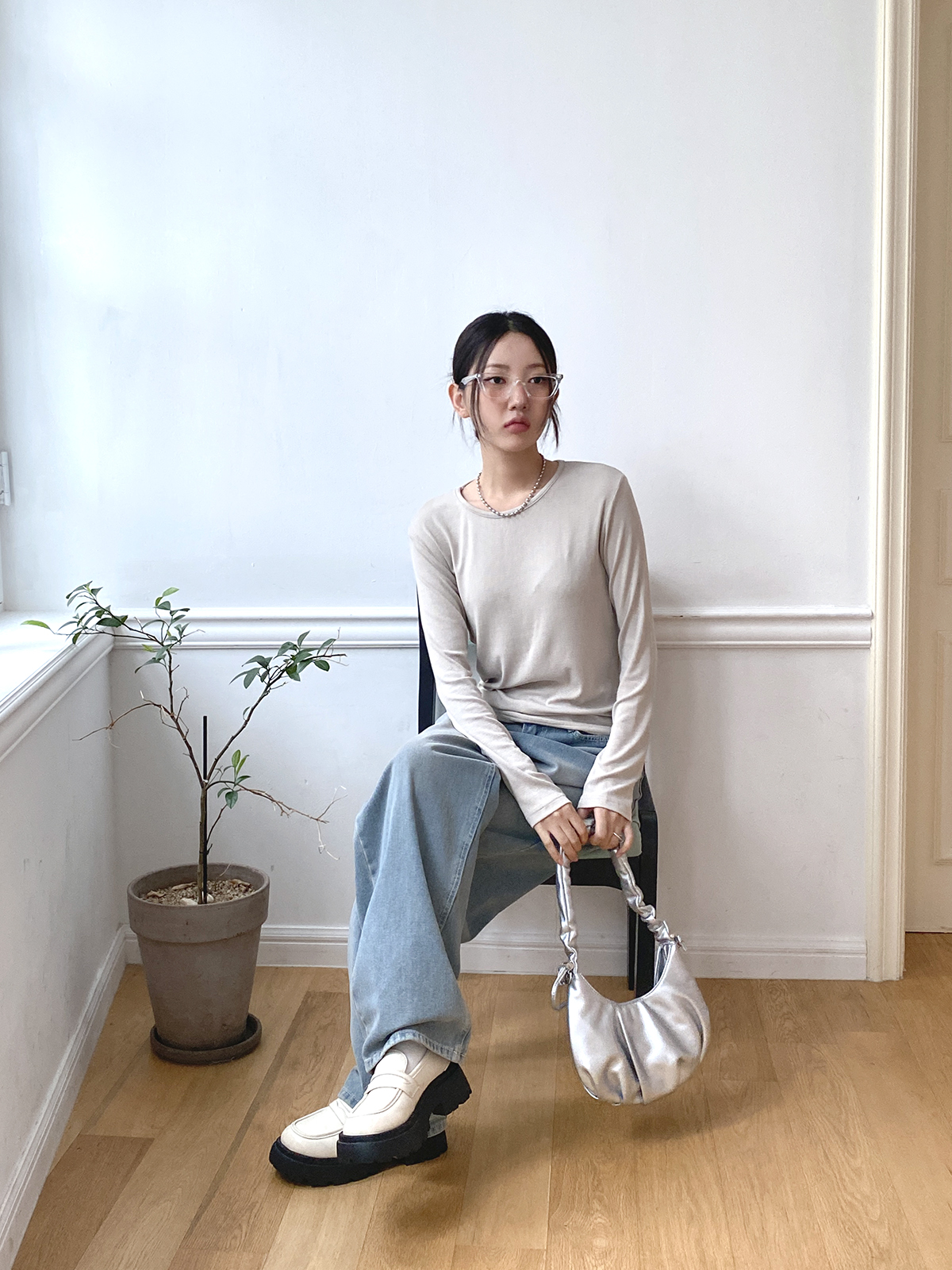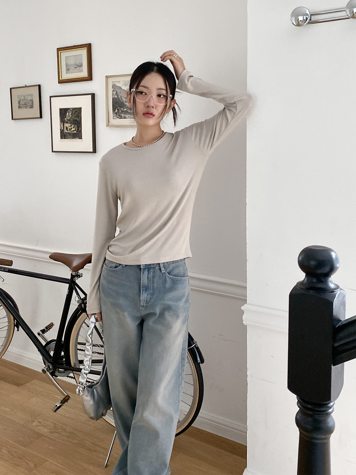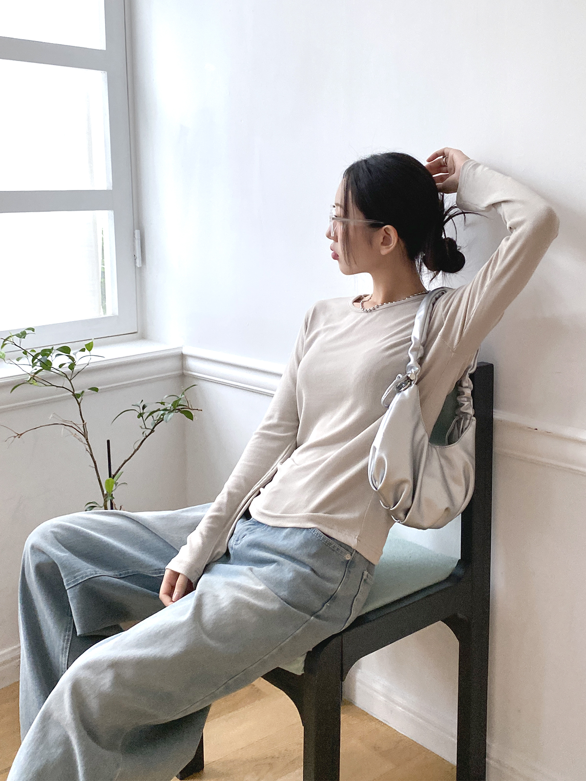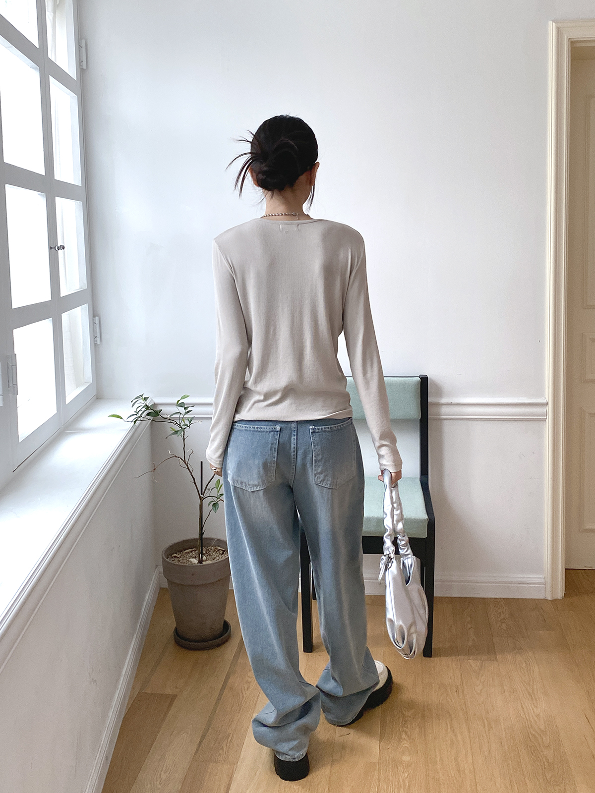 스탠다드한 디자인으로 깔끔하게 떨어지는 실루엣이 매력적인 골지 긴팔티에요!