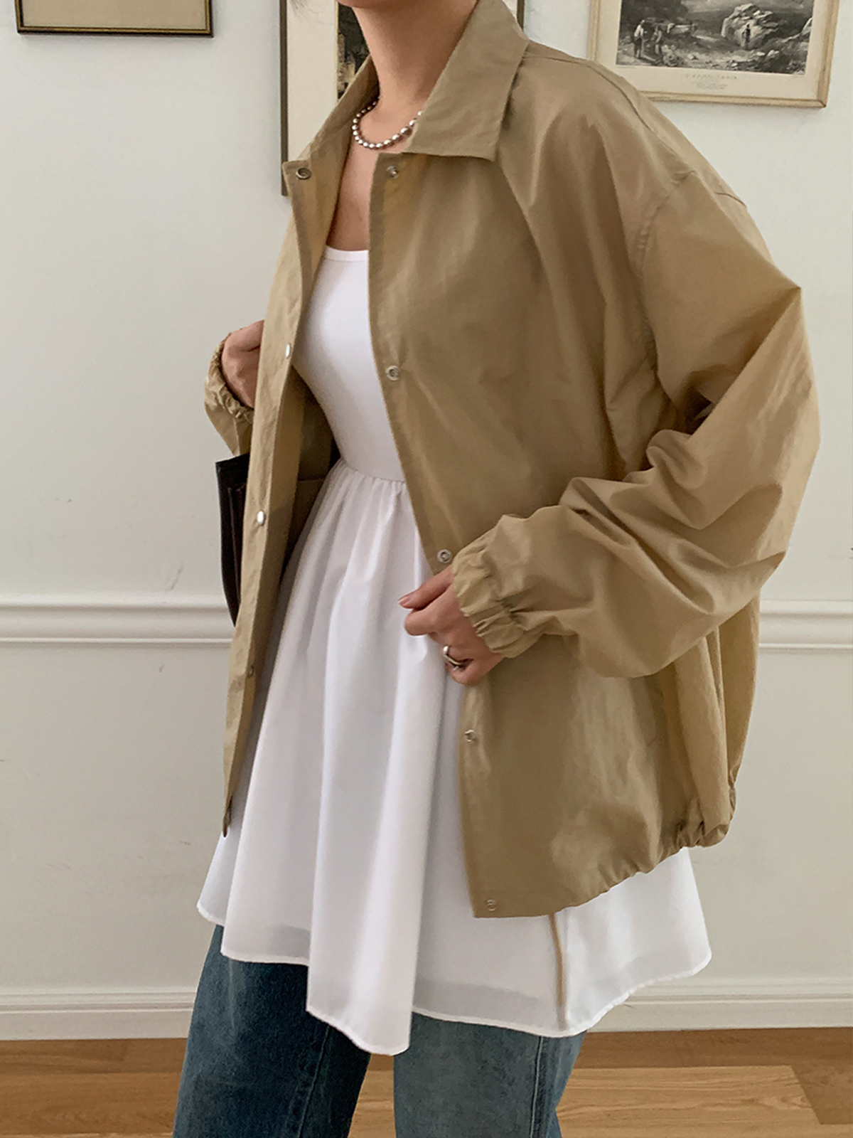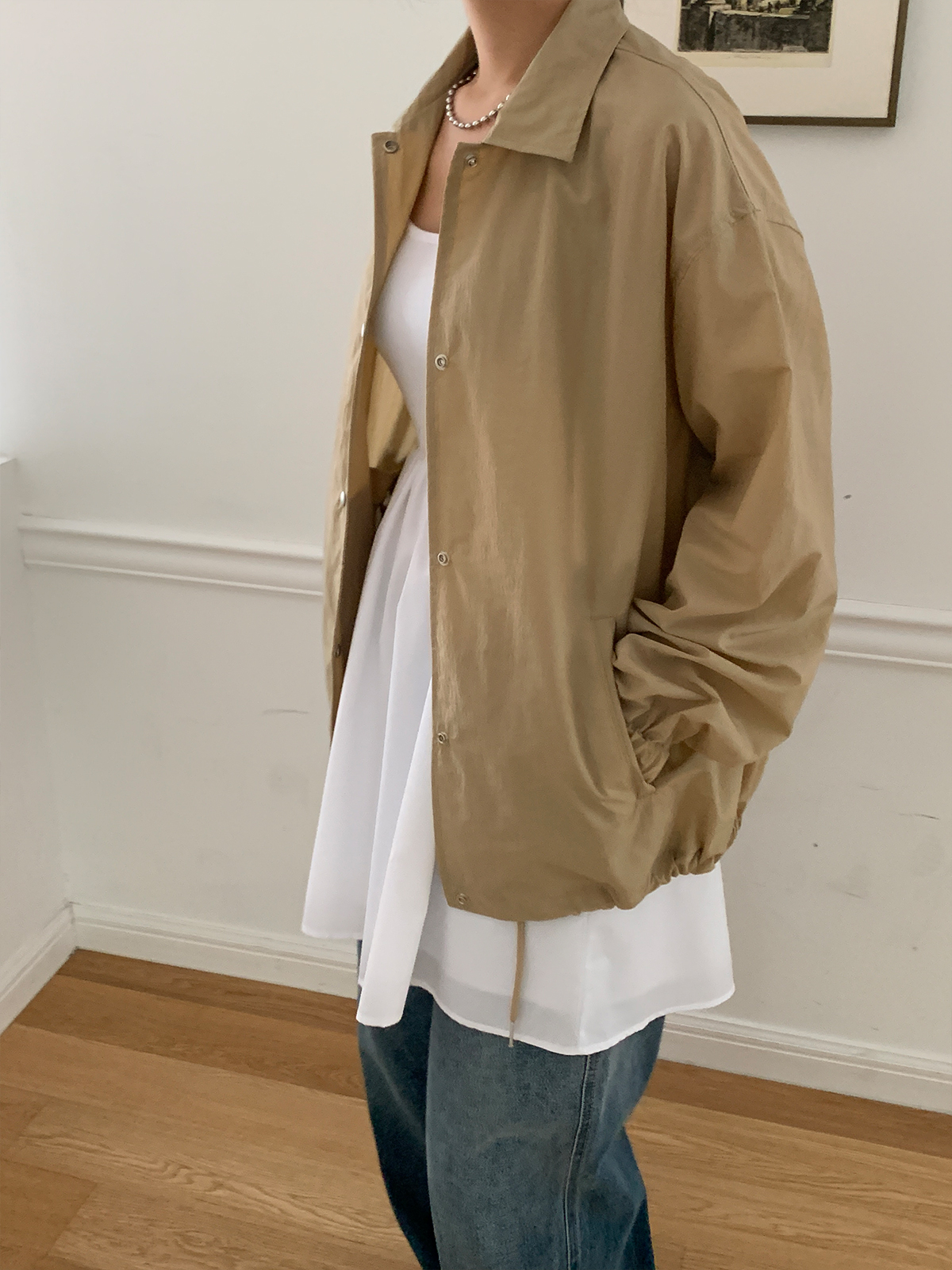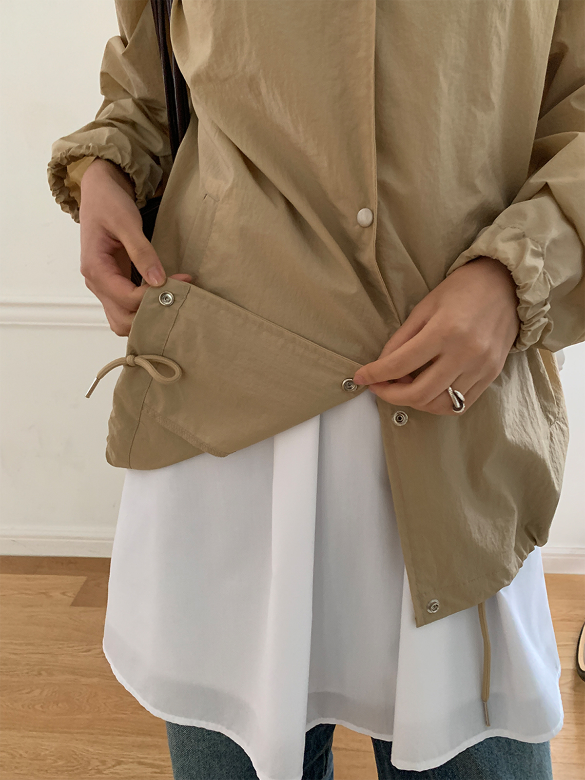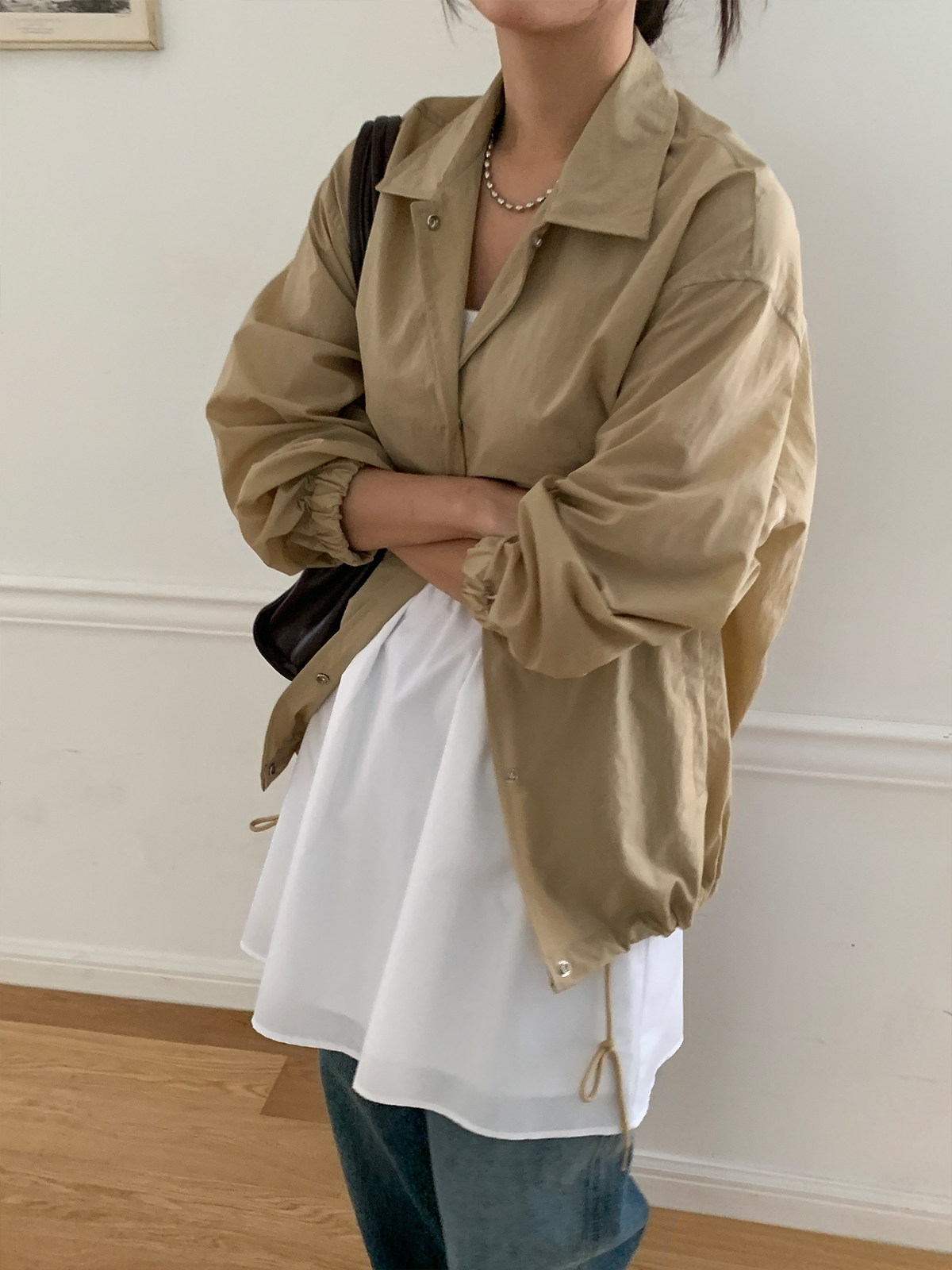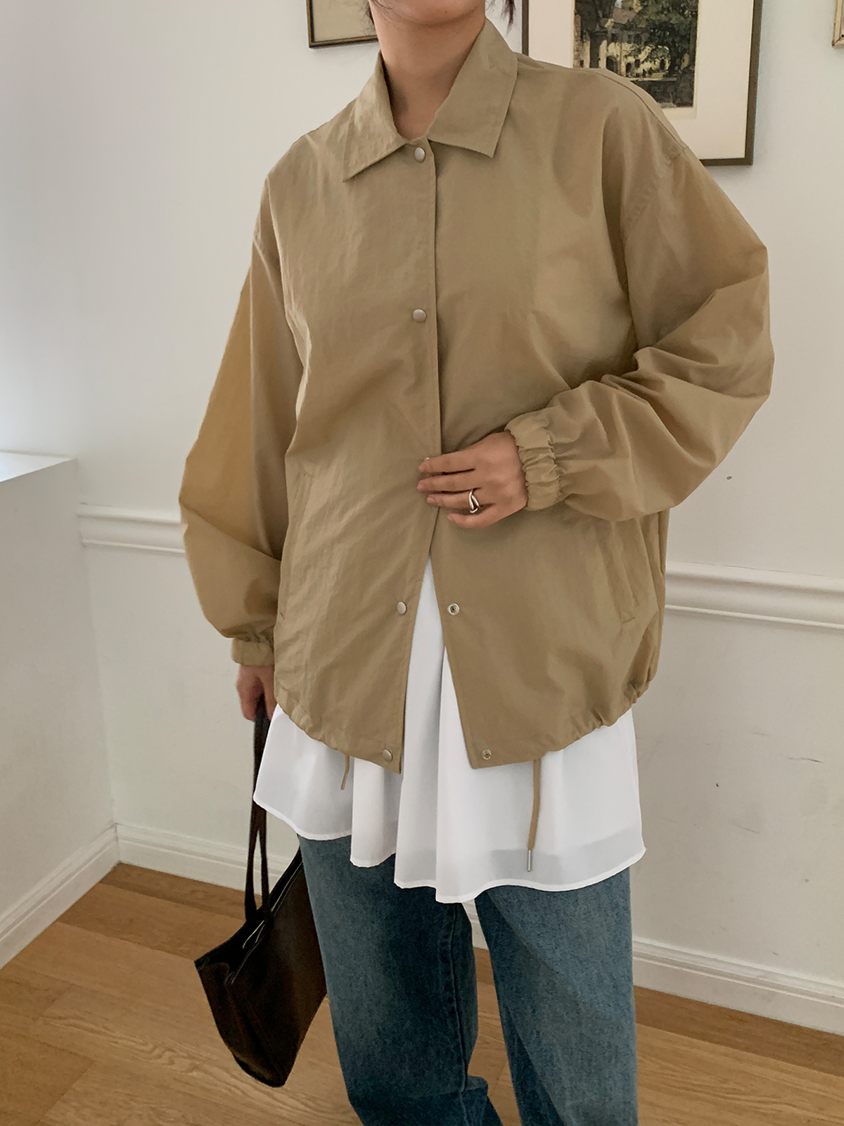밑단 뒷면 밴딩과 앞면 스트링으로 다양한 핏을 연출할 수 있는 오버핏 윈드브레이커 점퍼