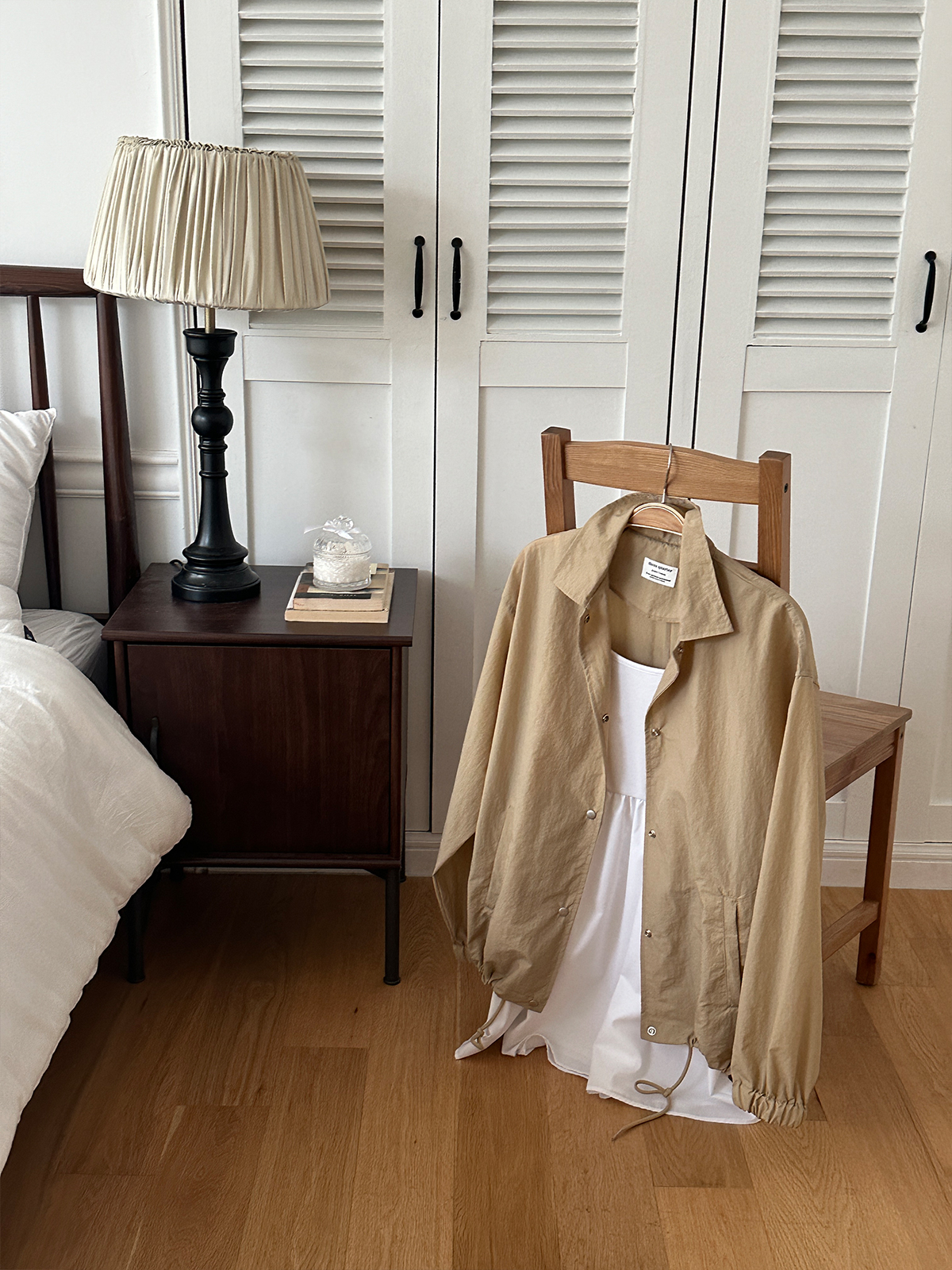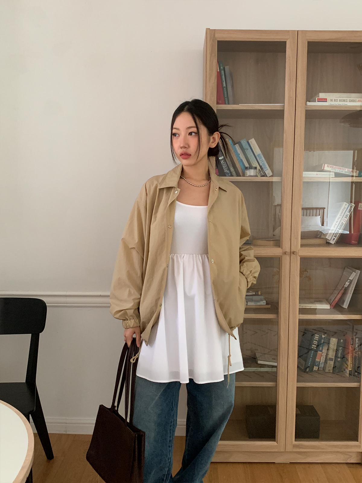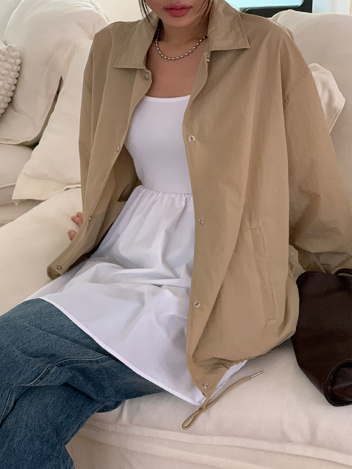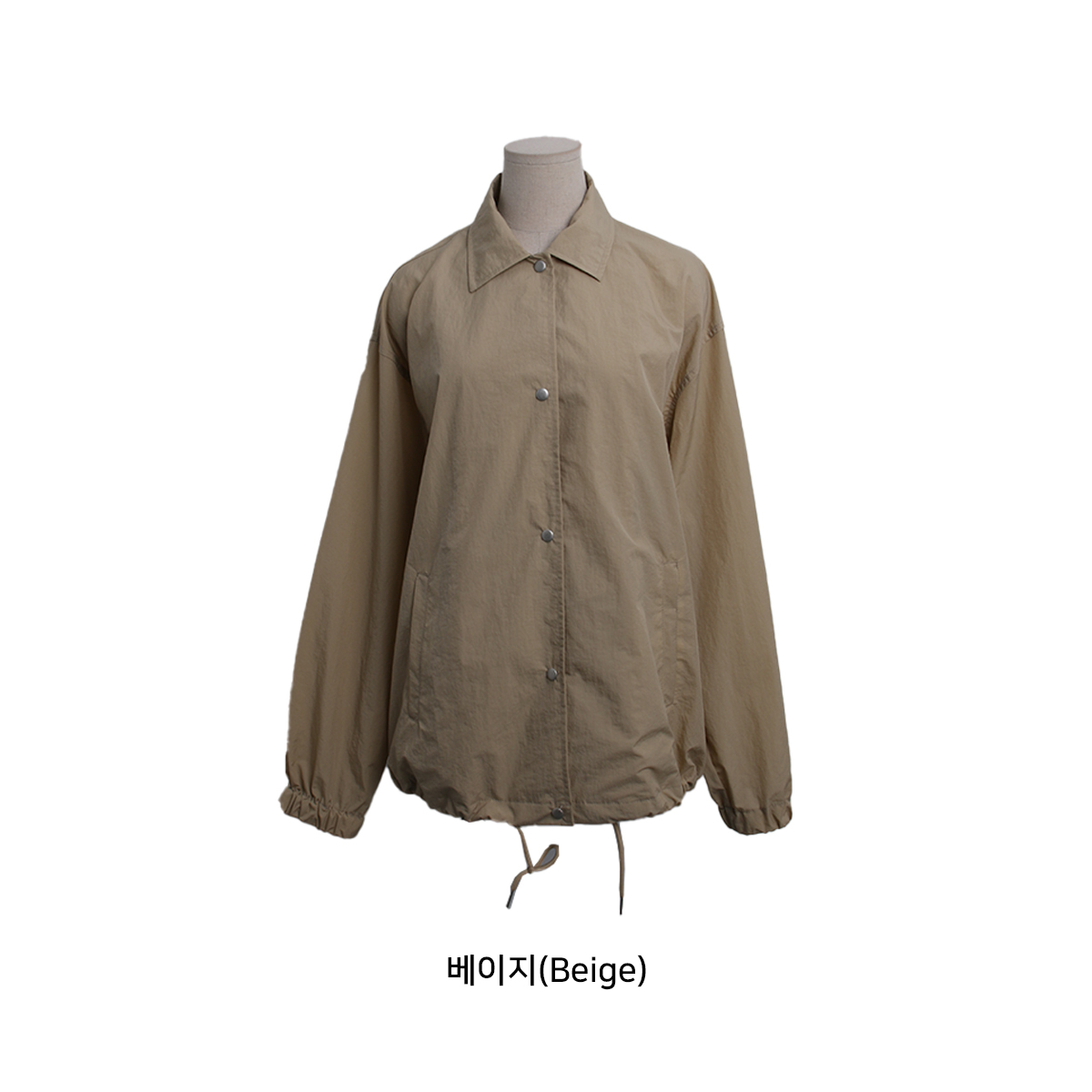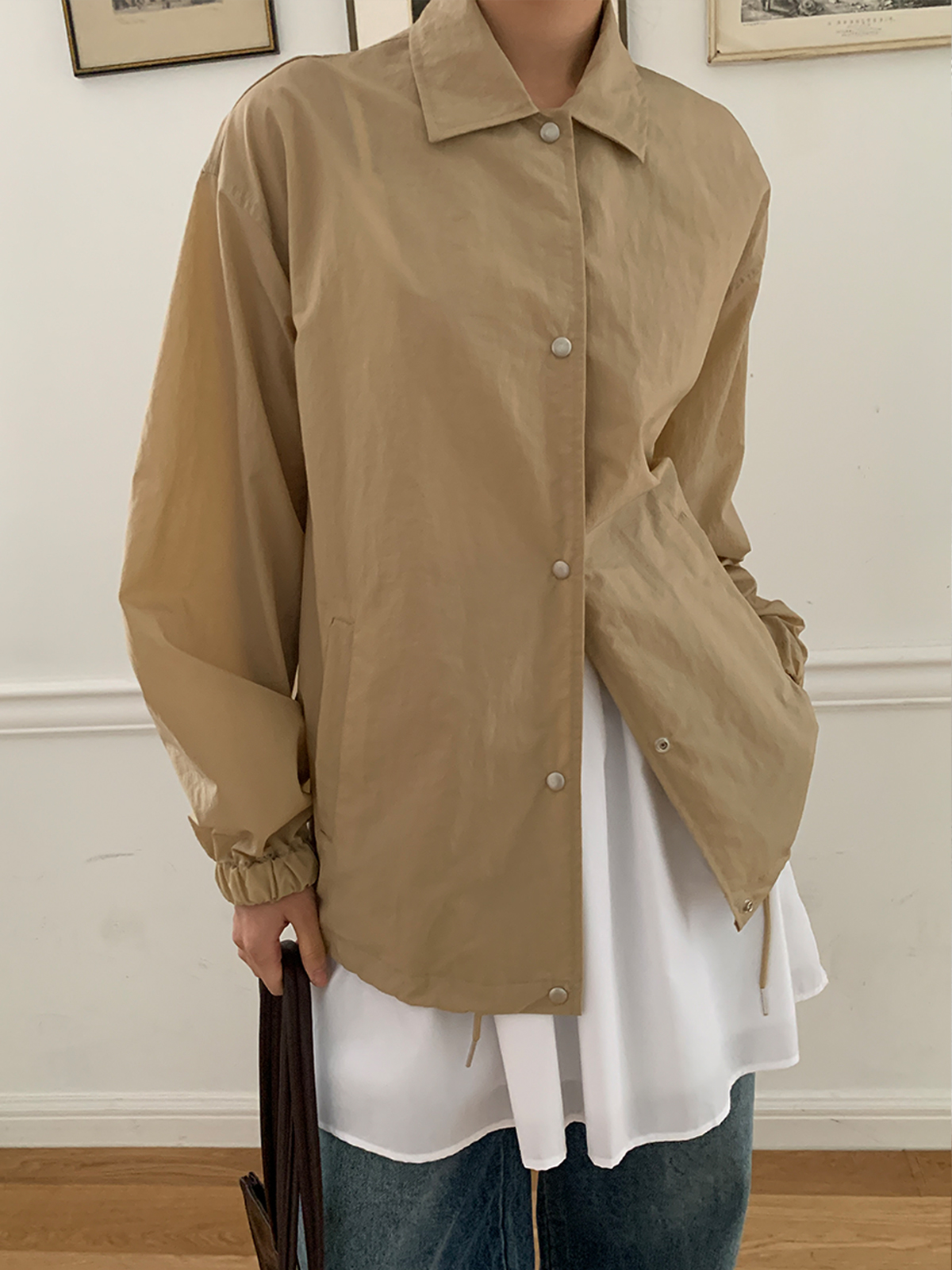 밑단 뒷면 밴딩과 앞면 스트링으로 다양한 핏을 연출할 수 있는 오버핏 윈드브레이커 점퍼
