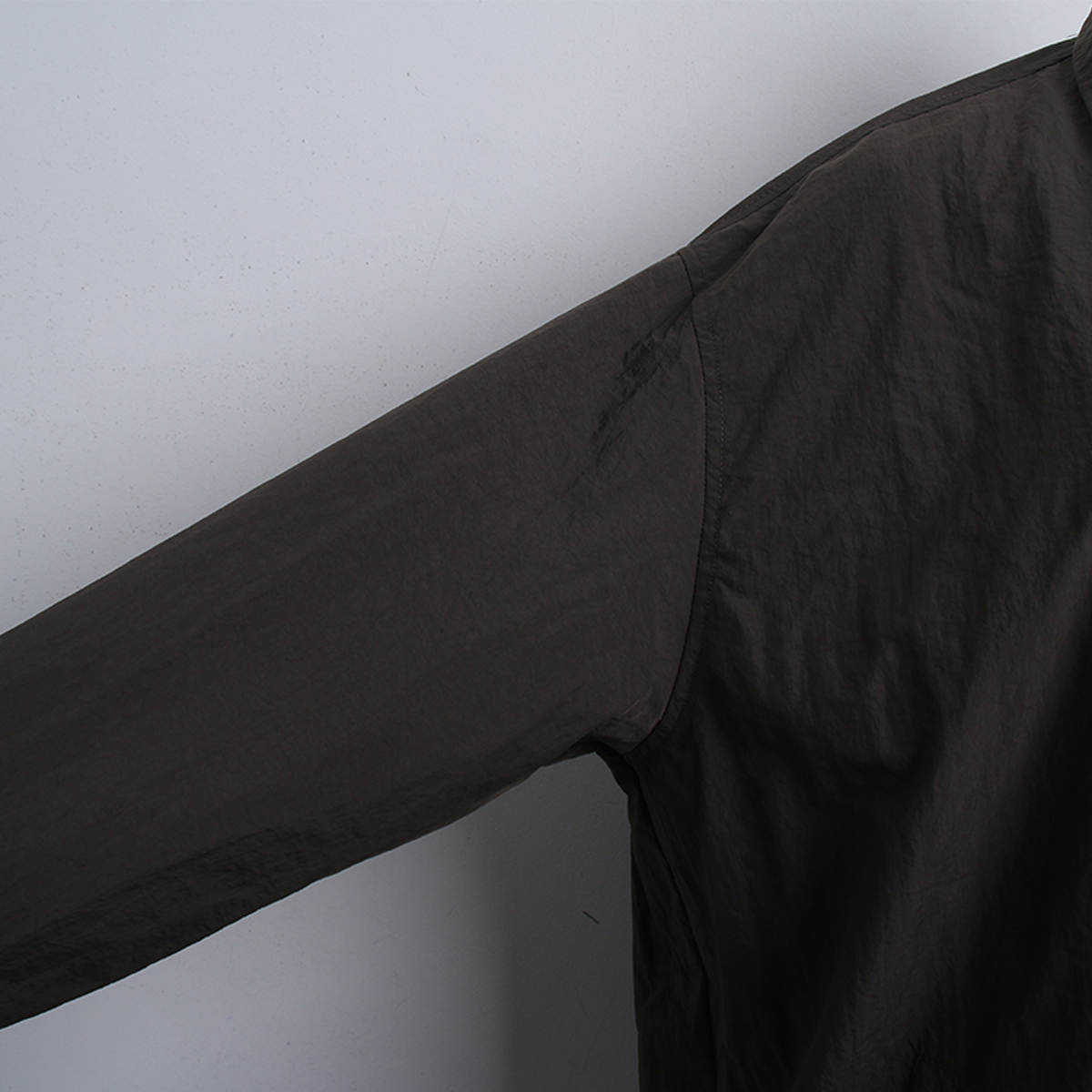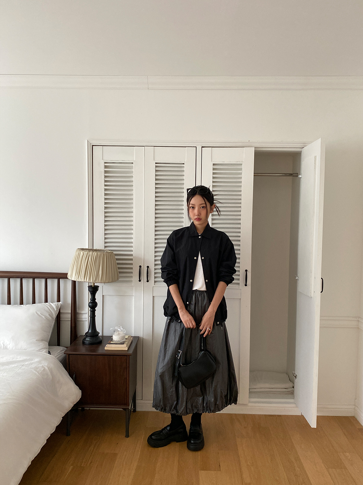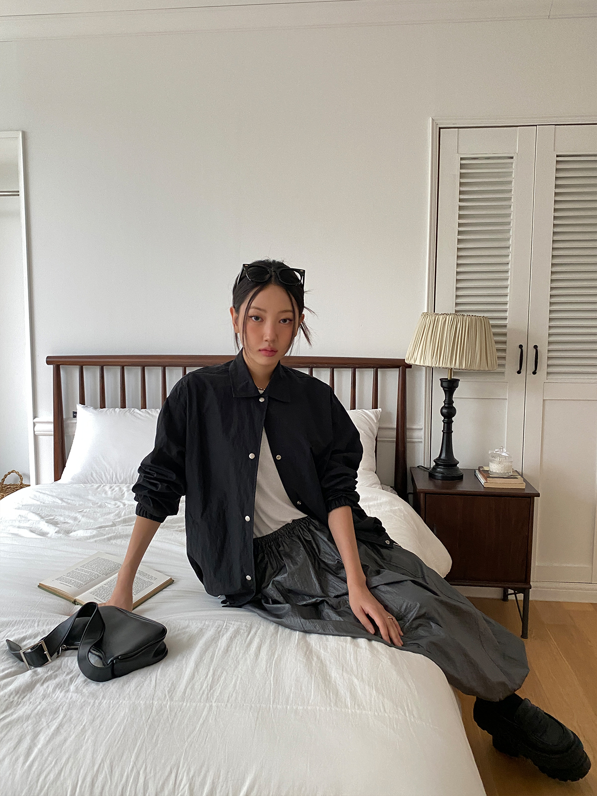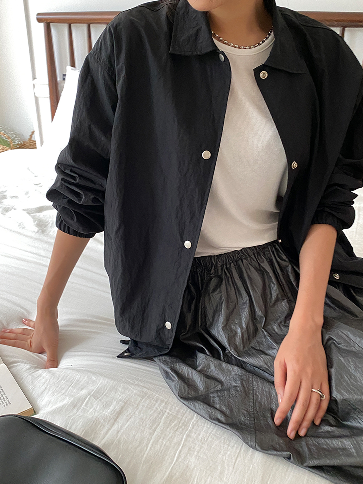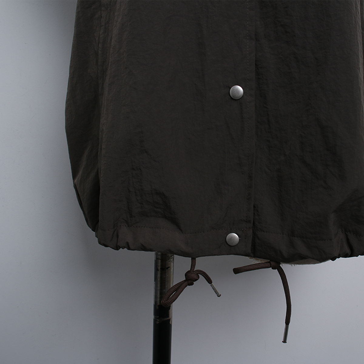 밑단 뒷면 밴딩과 앞면 스트링으로 다양한 핏을 연출할 수 있는 오버핏 윈드브레이커 점퍼