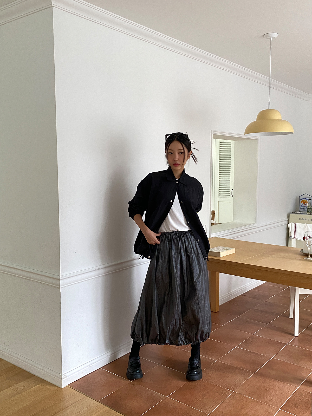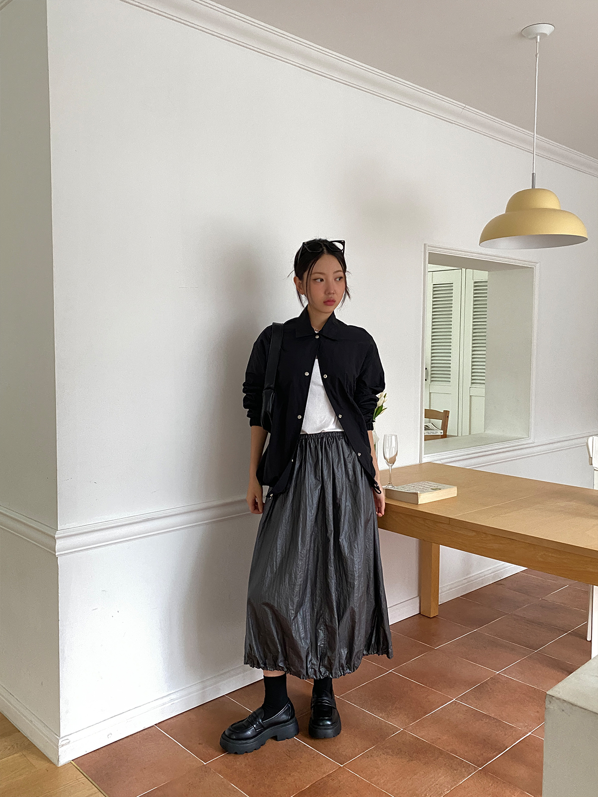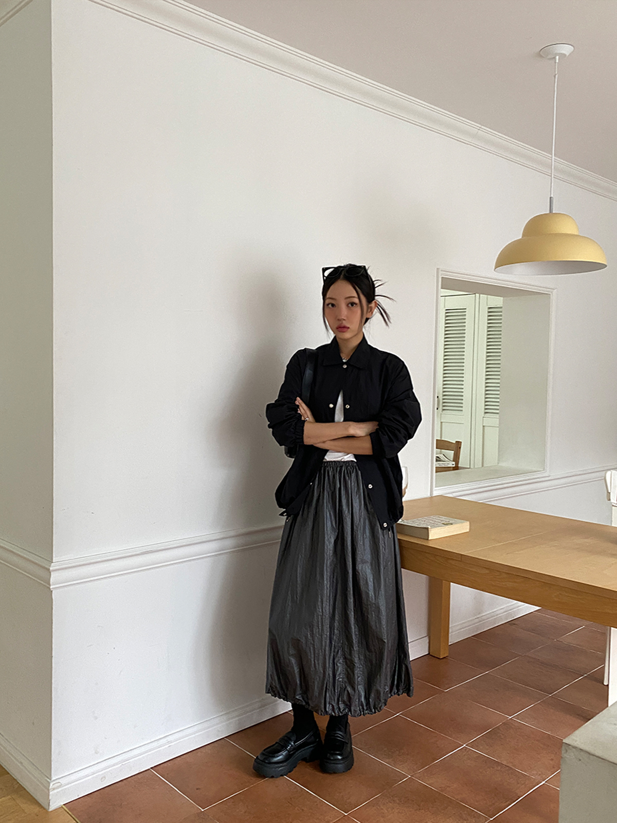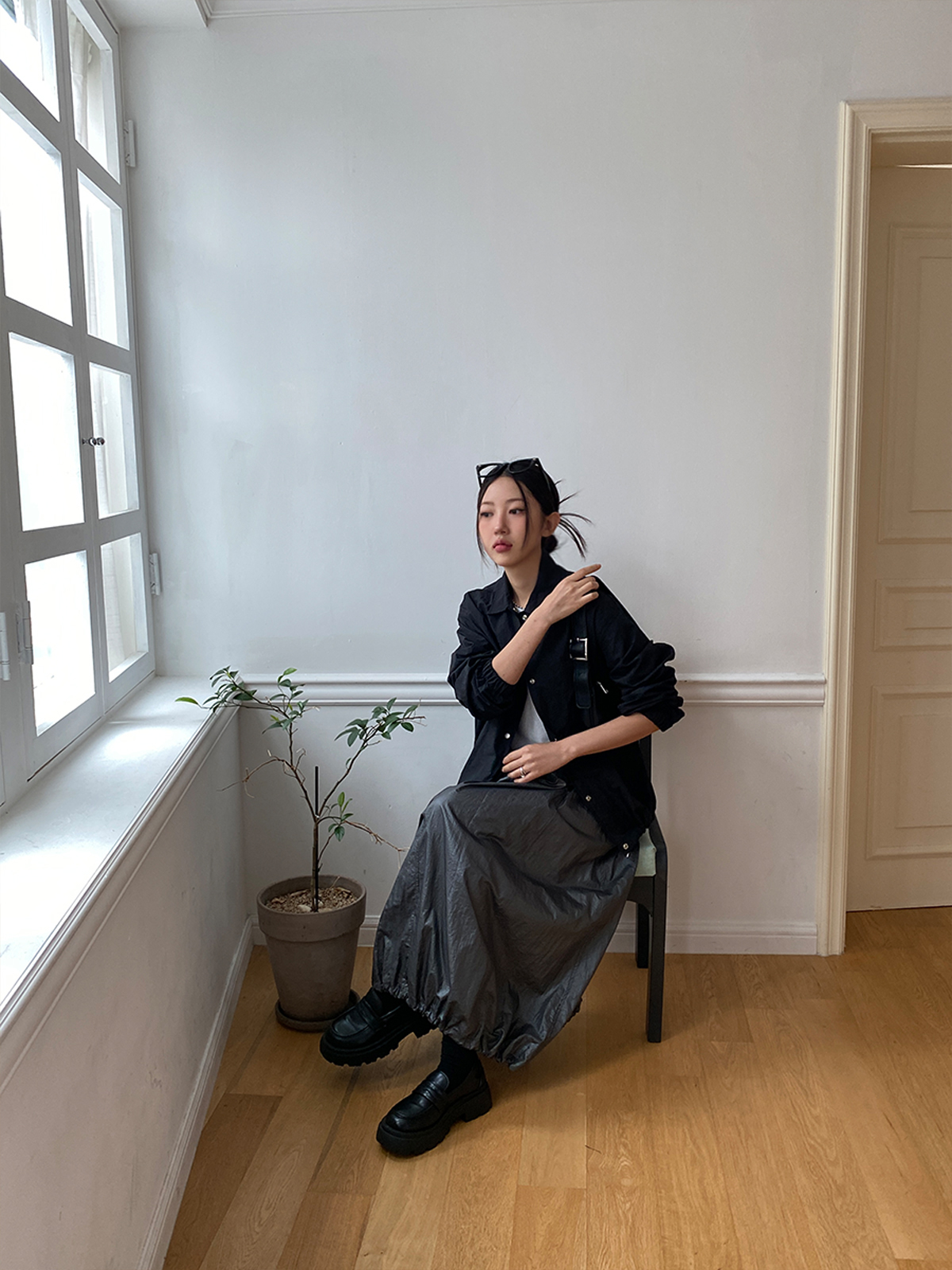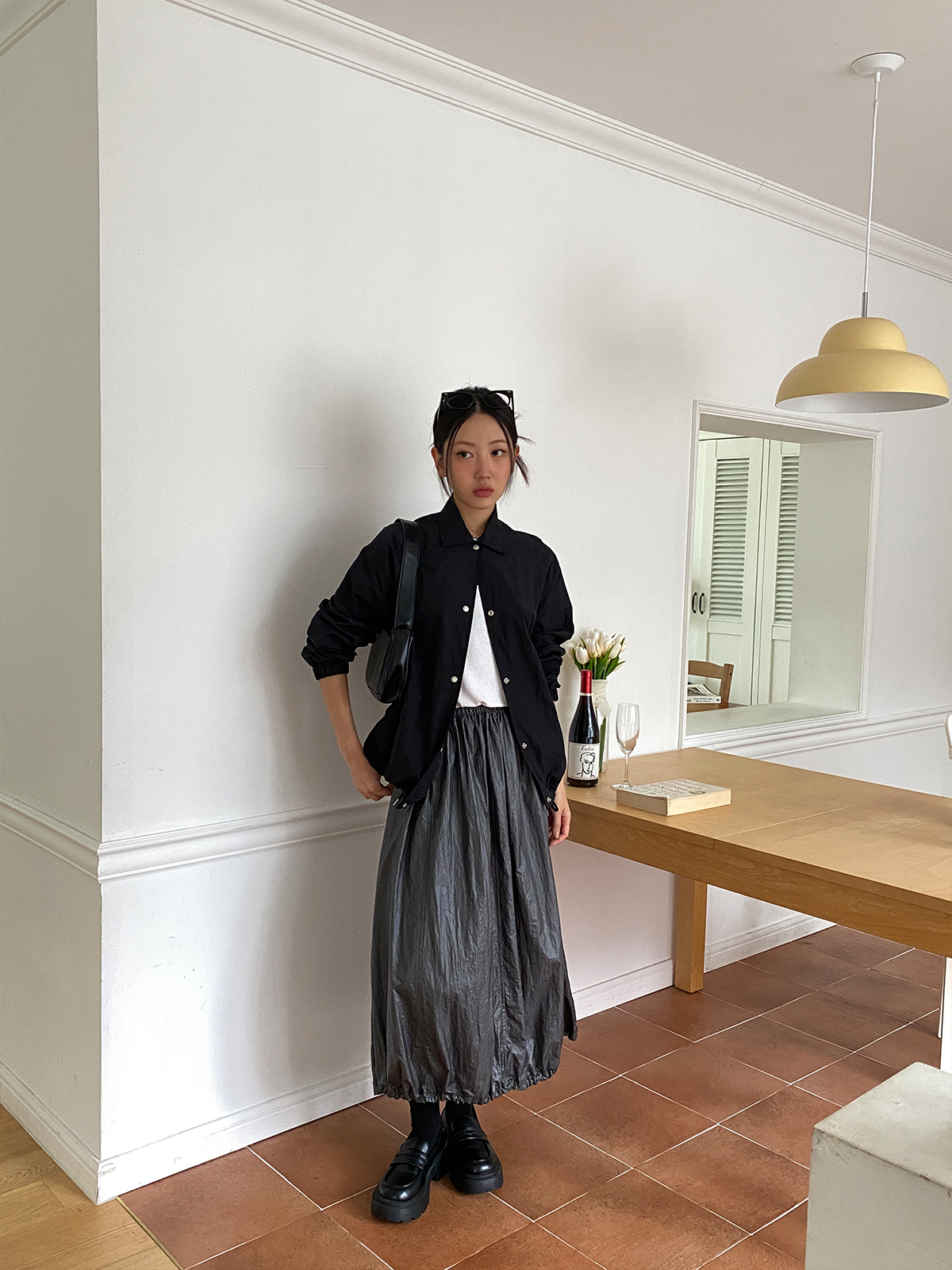 밑단 뒷면 밴딩과 앞면 스트링으로 다양한 핏을 연출할 수 있는 오버핏 윈드브레이커 점퍼