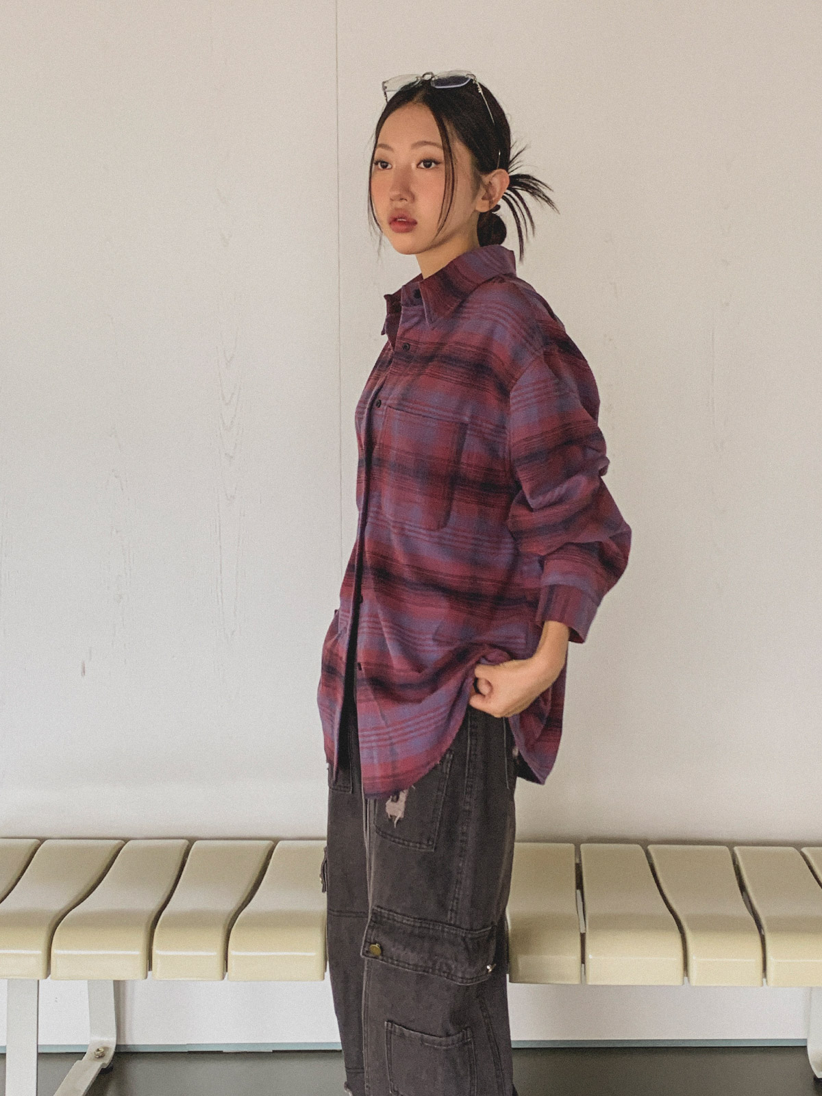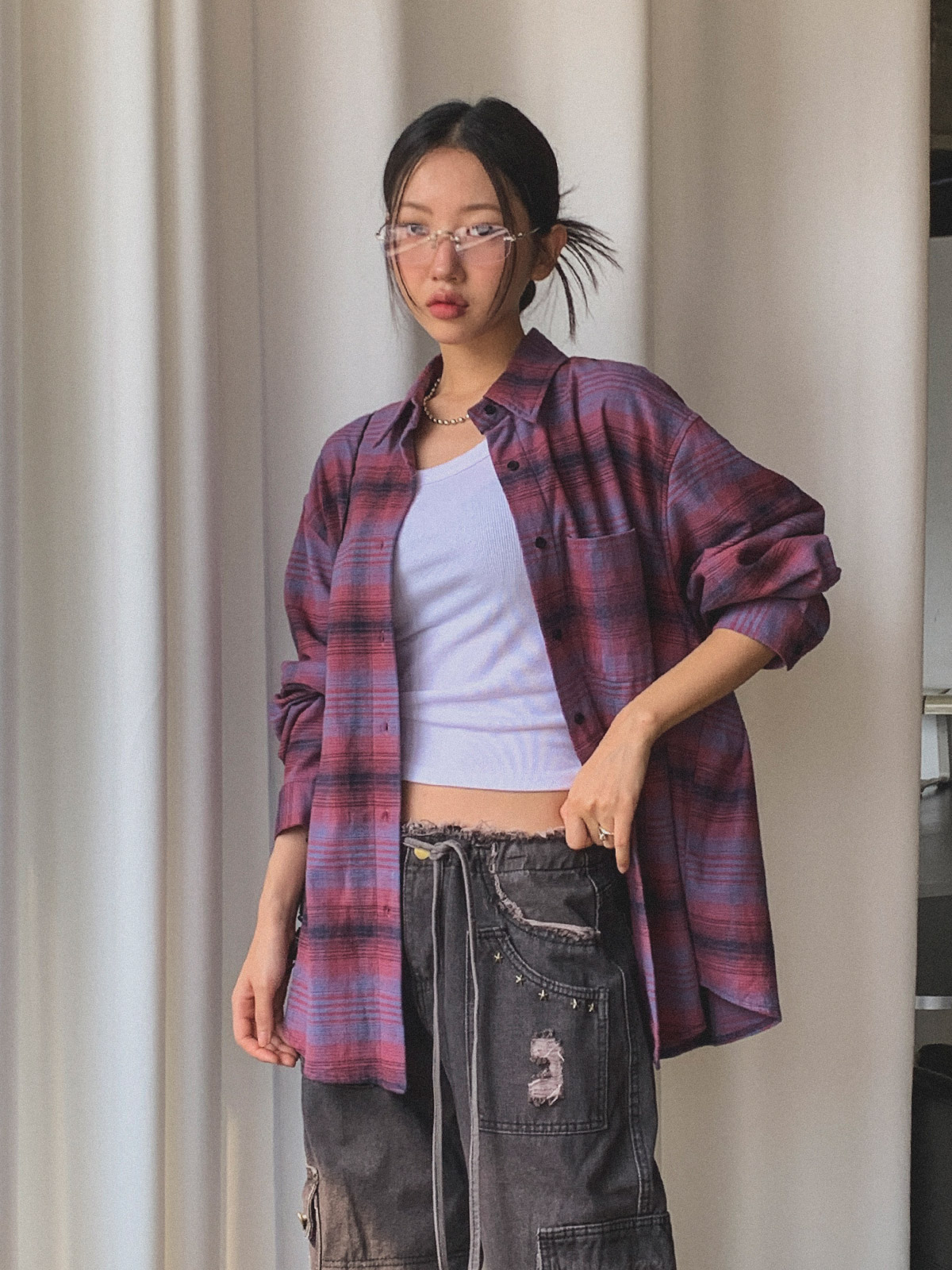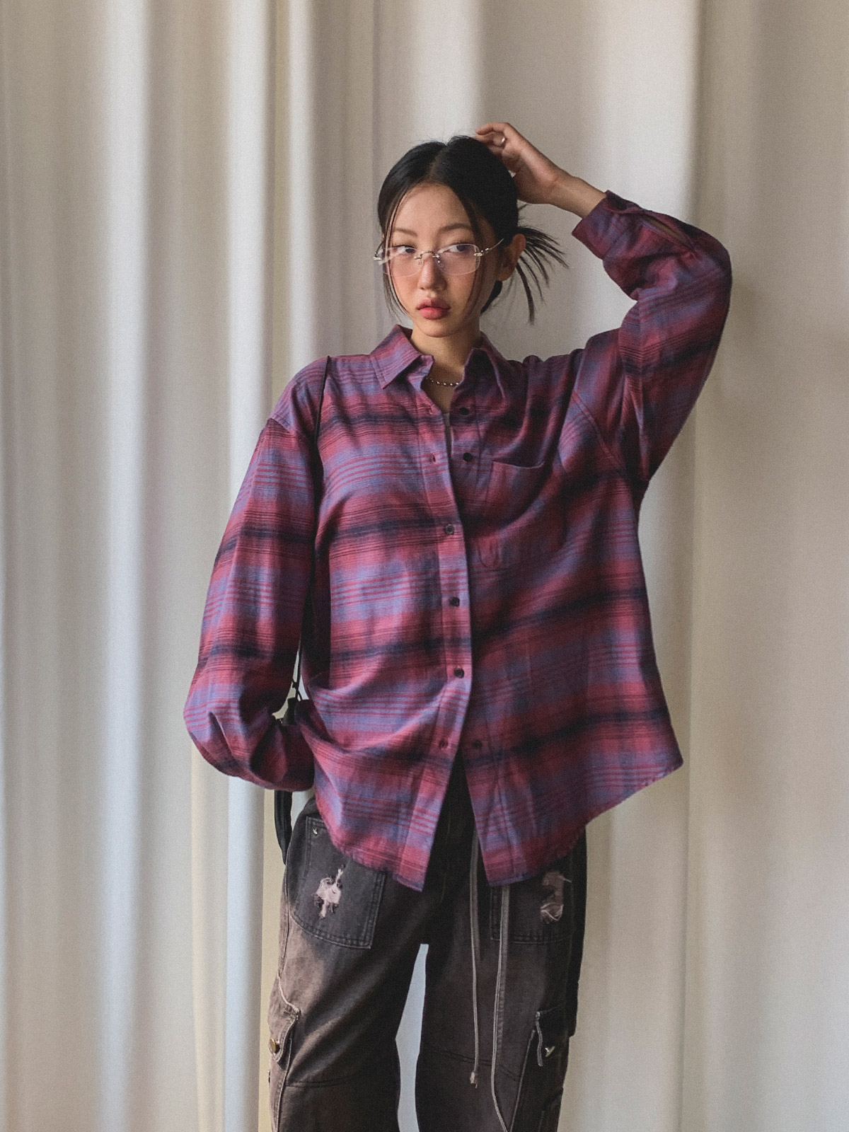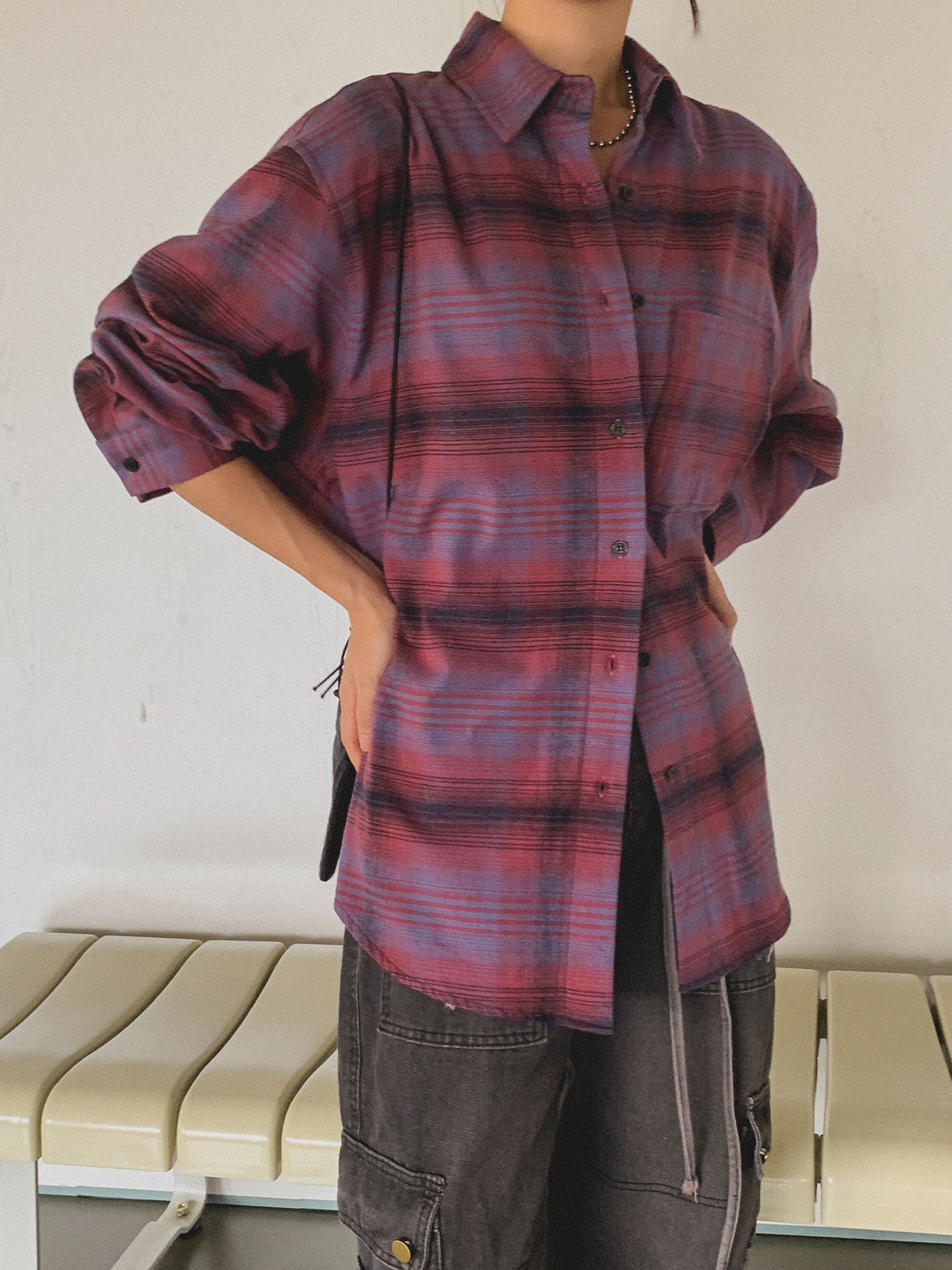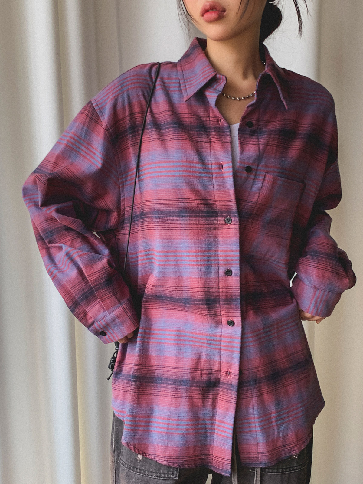 넉넉한 사이즈로 다양한 체형에도 여리여리한 실루엣을 연출해주어 꾸안꾸 체크 남방으로 추천해요~!