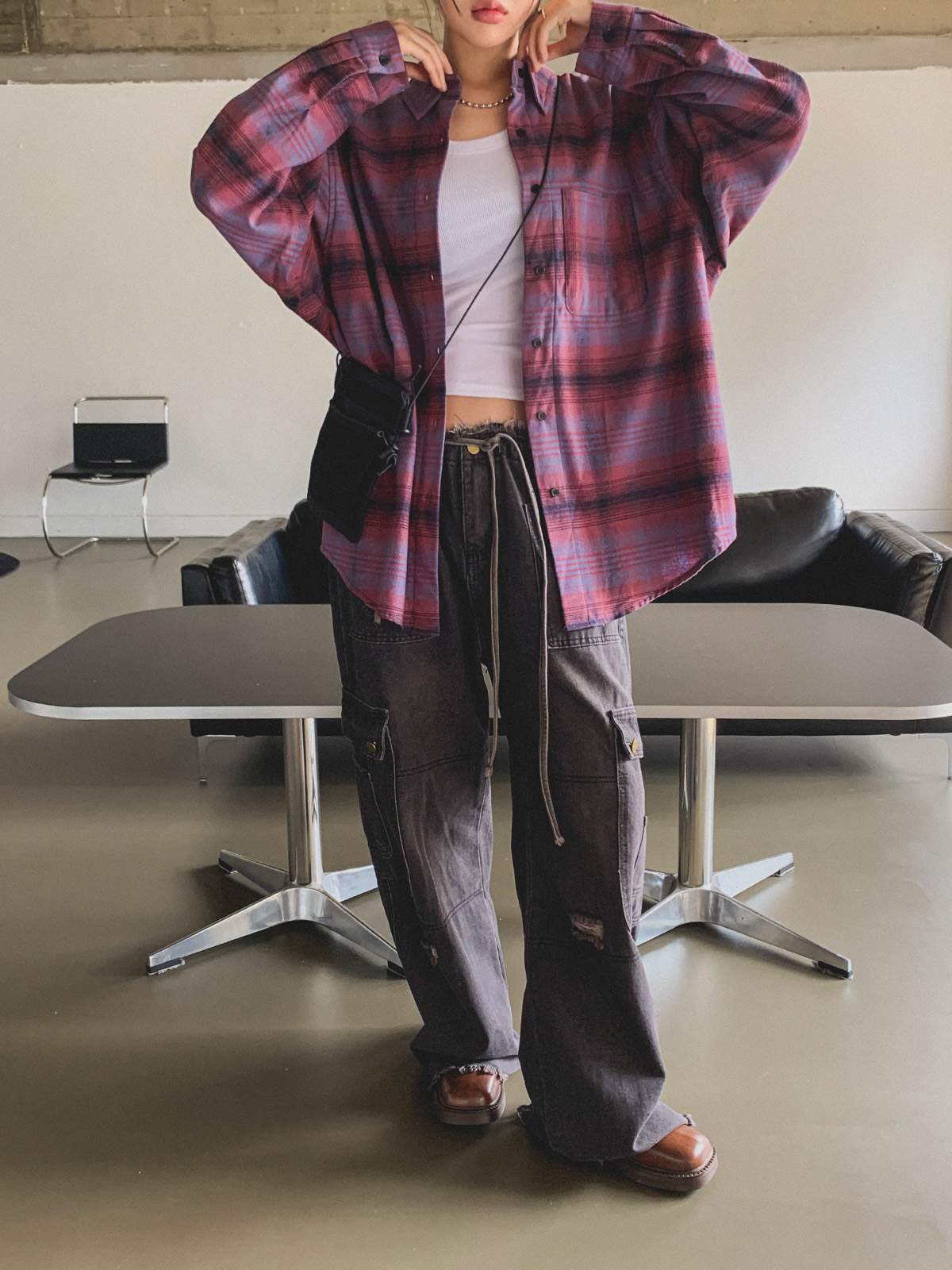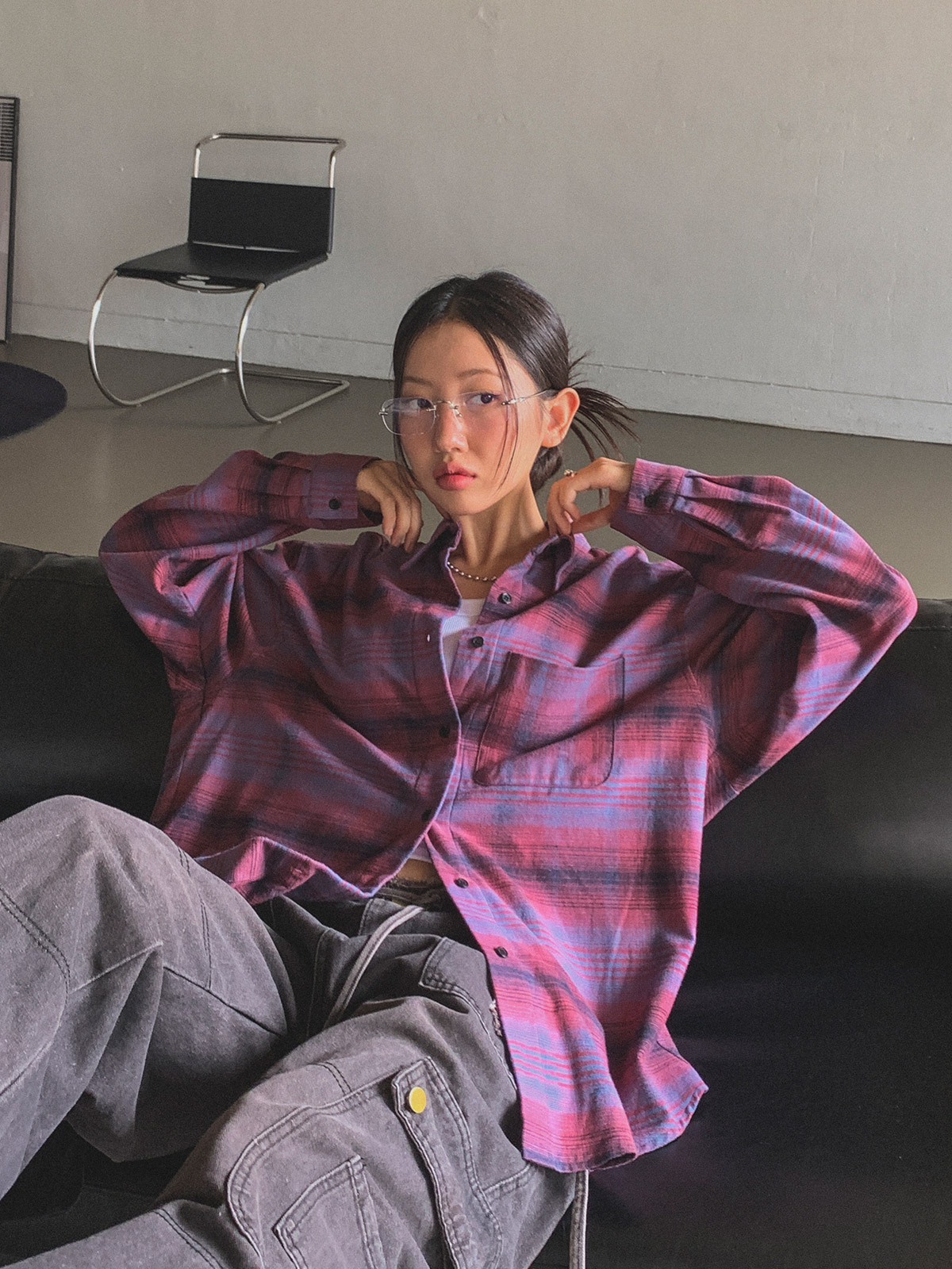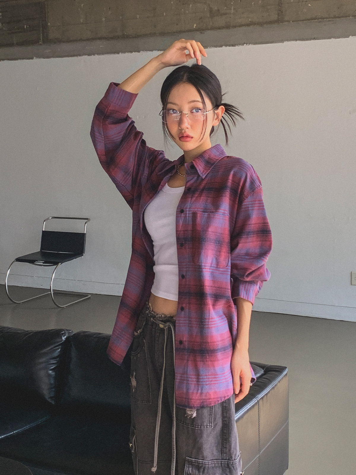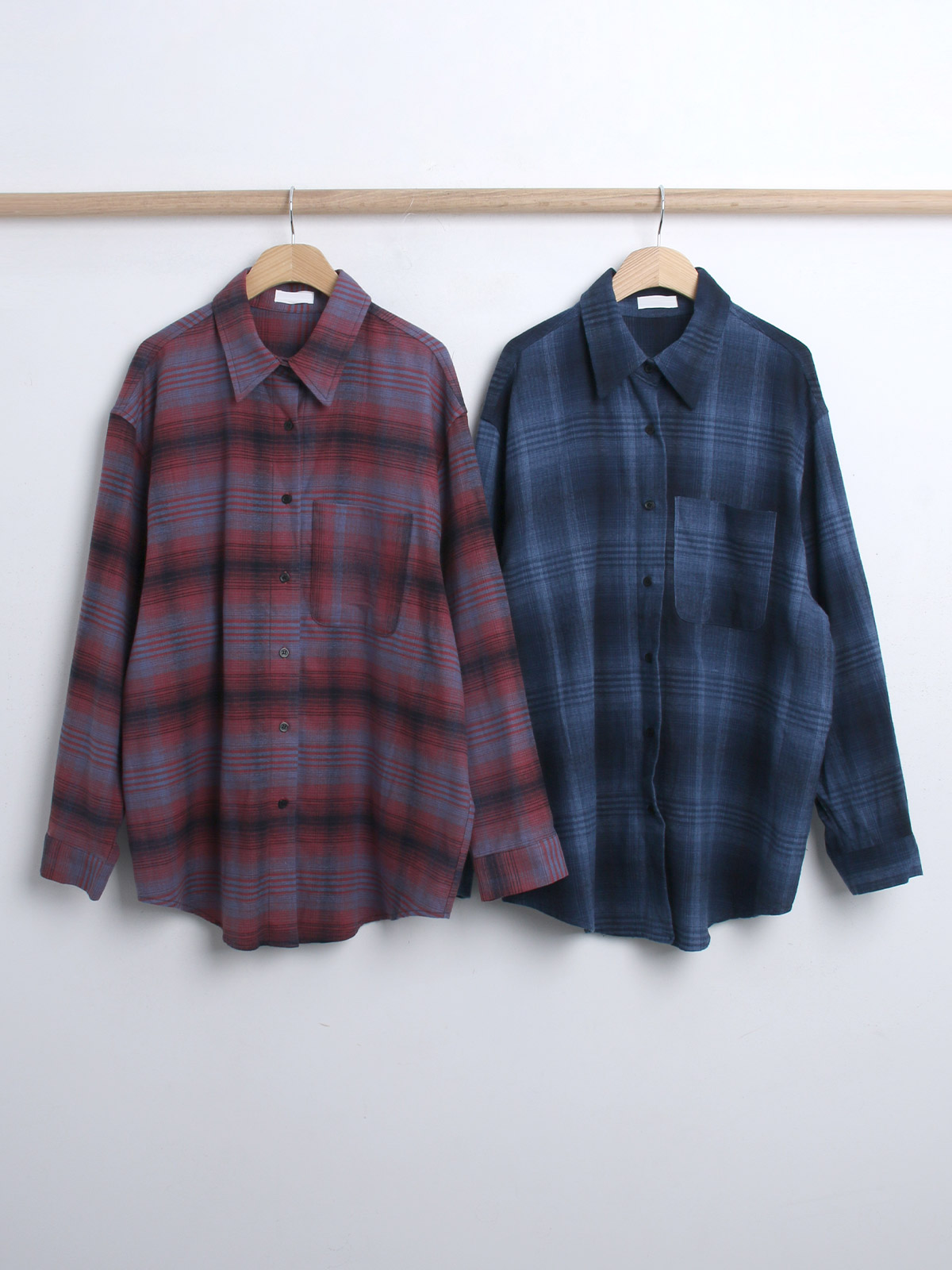넉넉한 사이즈로 다양한 체형에도 여리여리한 실루엣을 연출해주어 꾸안꾸 체크 남방으로 추천해요~!