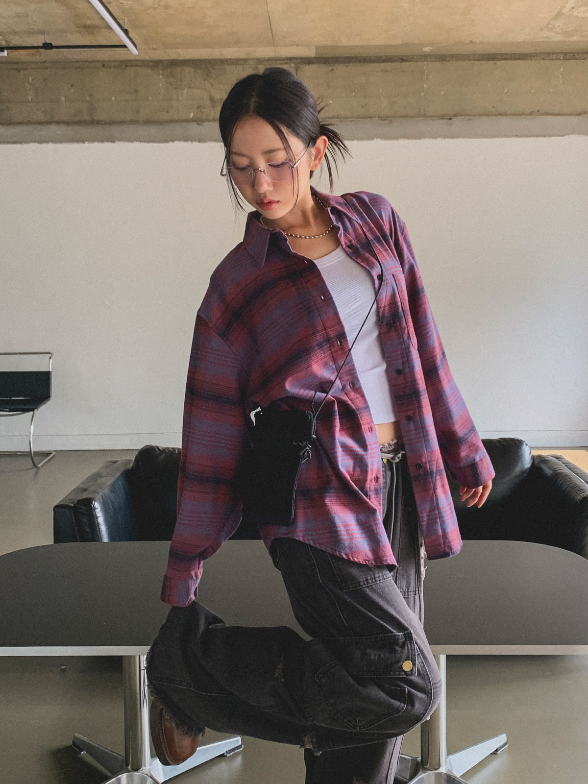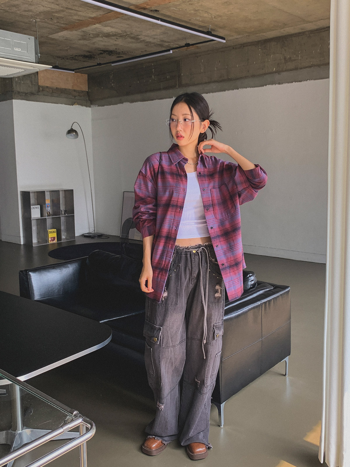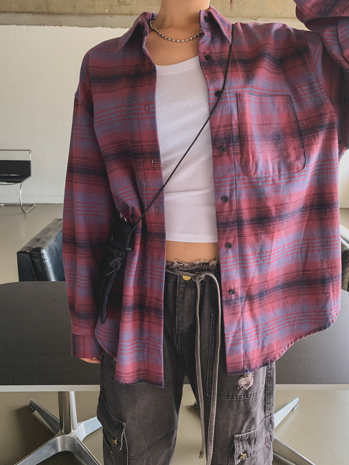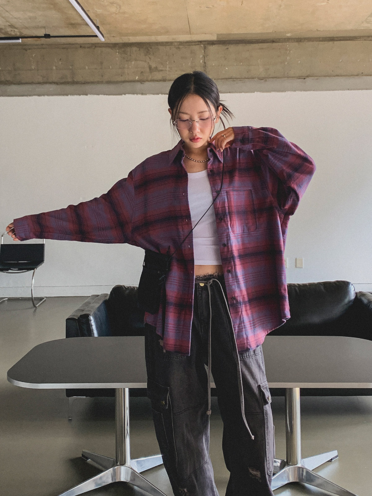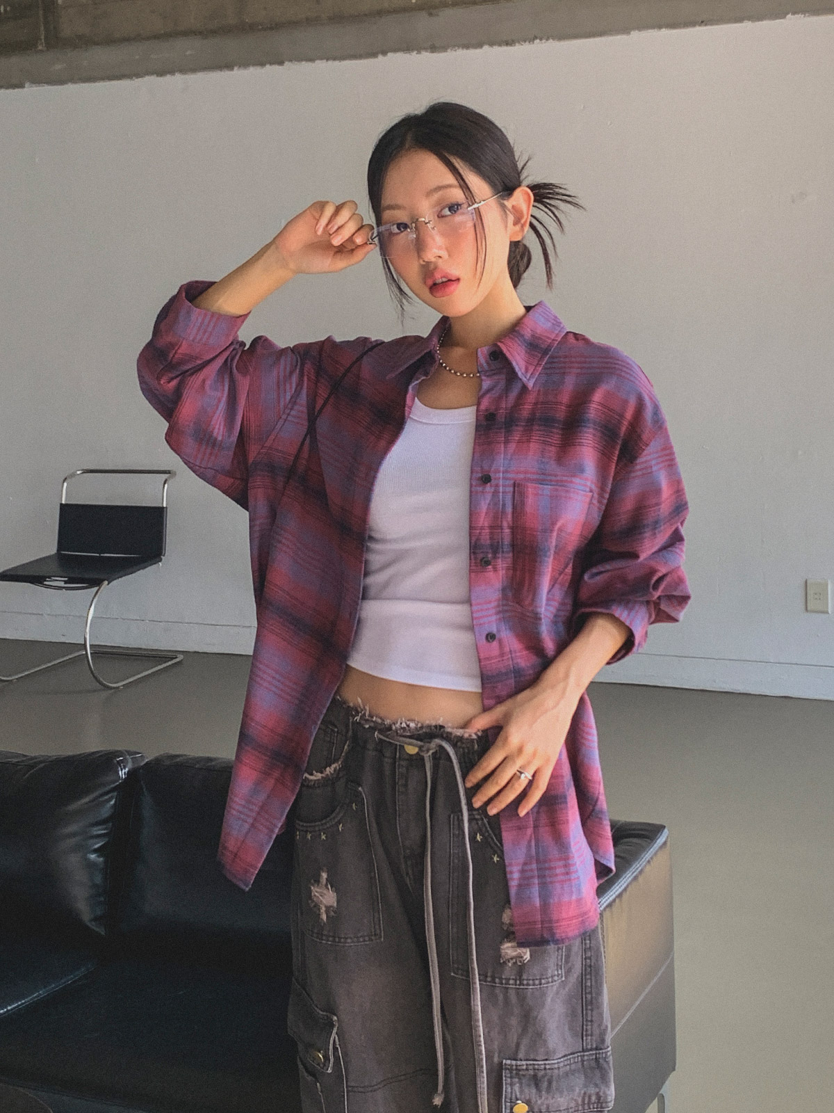 넉넉한 사이즈로 다양한 체형에도 여리여리한 실루엣을 연출해주어 꾸안꾸 체크 남방으로 추천해요~!