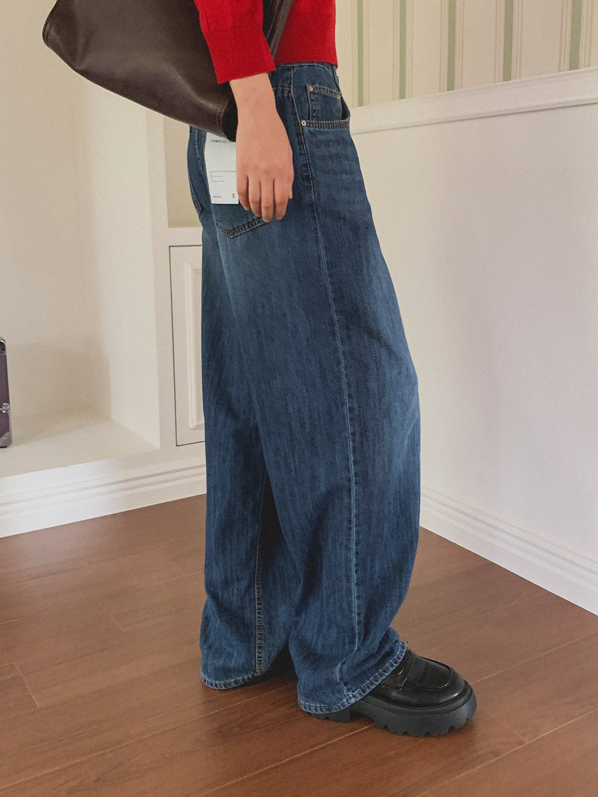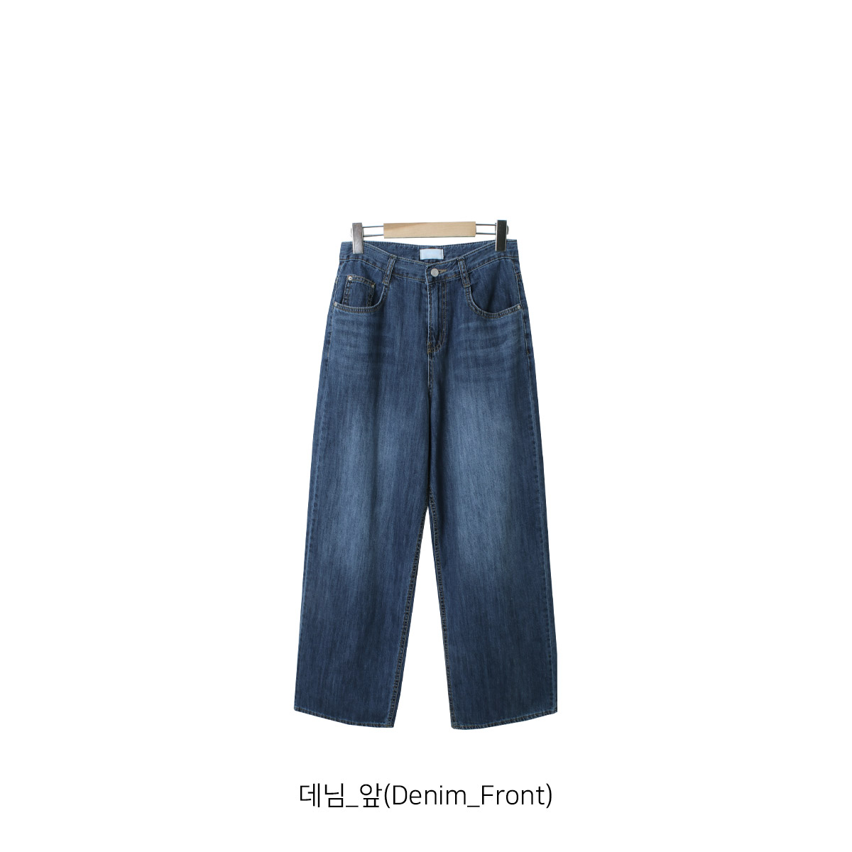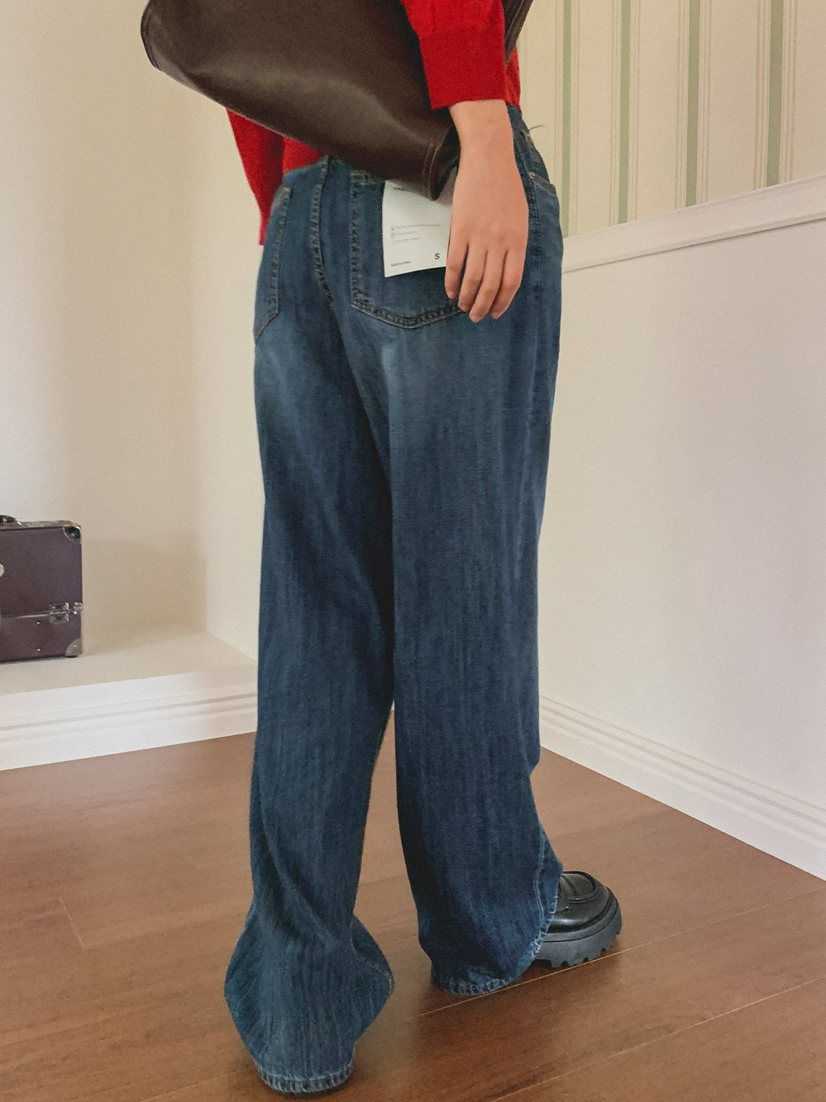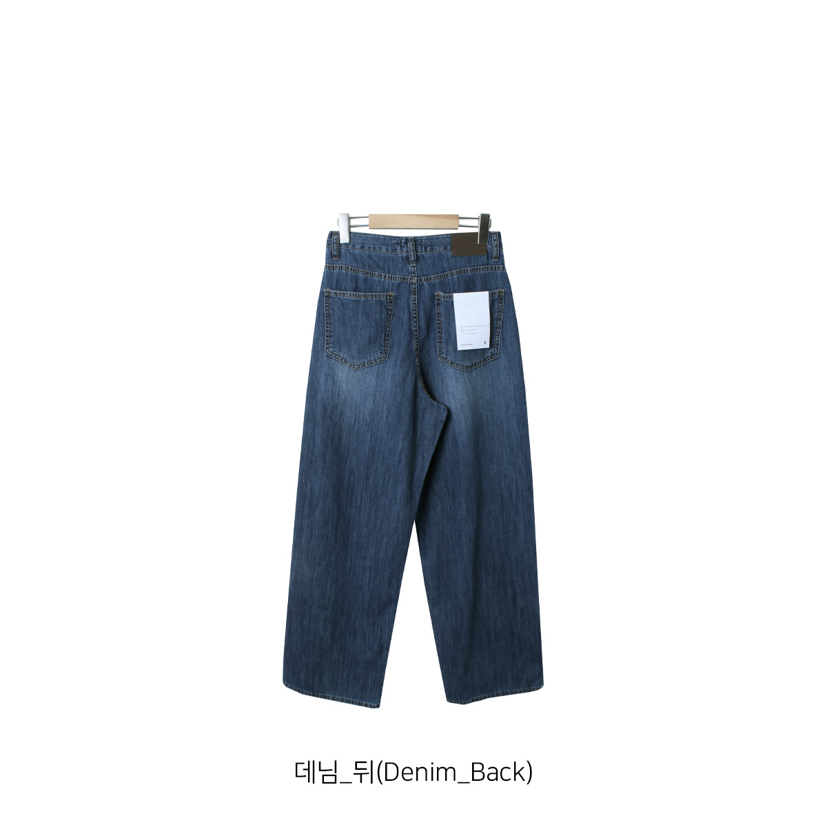 부담스럽지 않은 무게감으로 편안한 착용감을 주는 일자 와이드핏 데님 팬츠