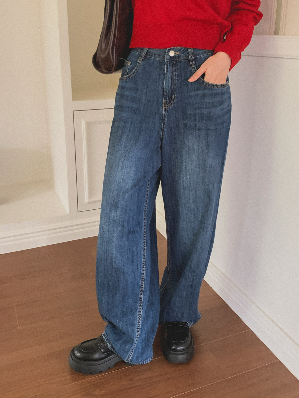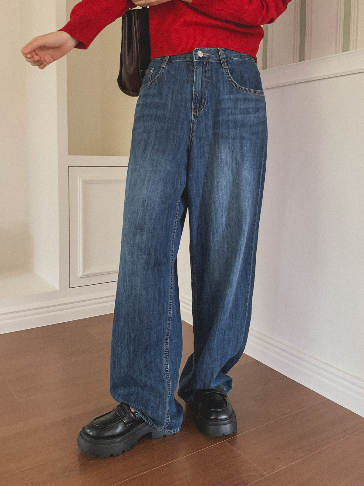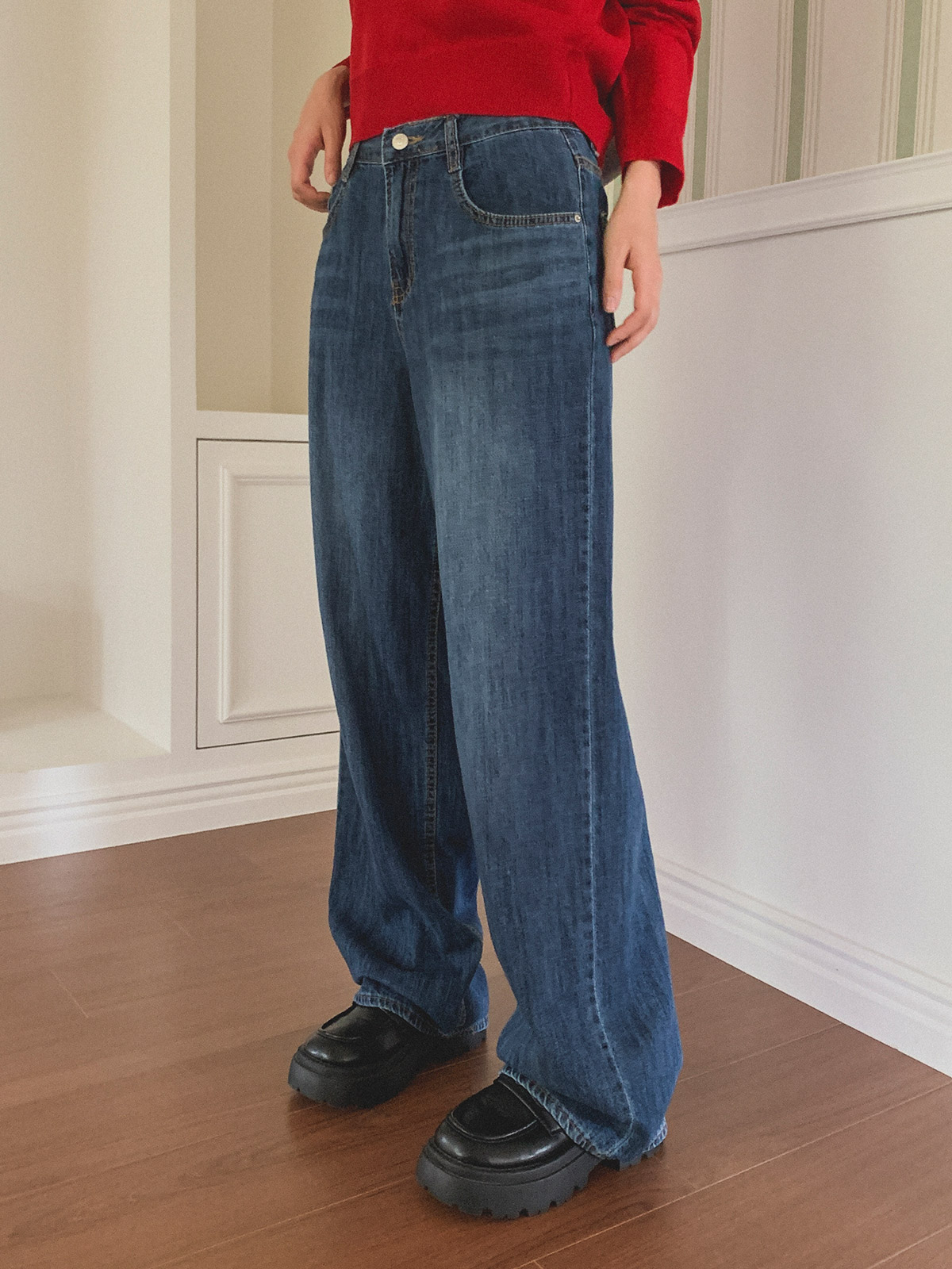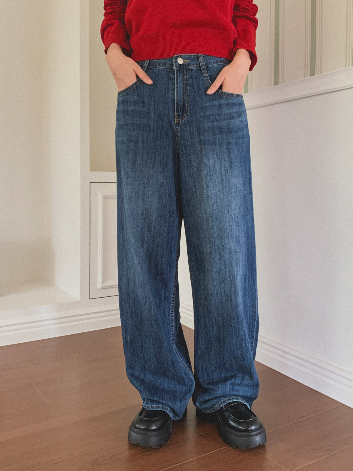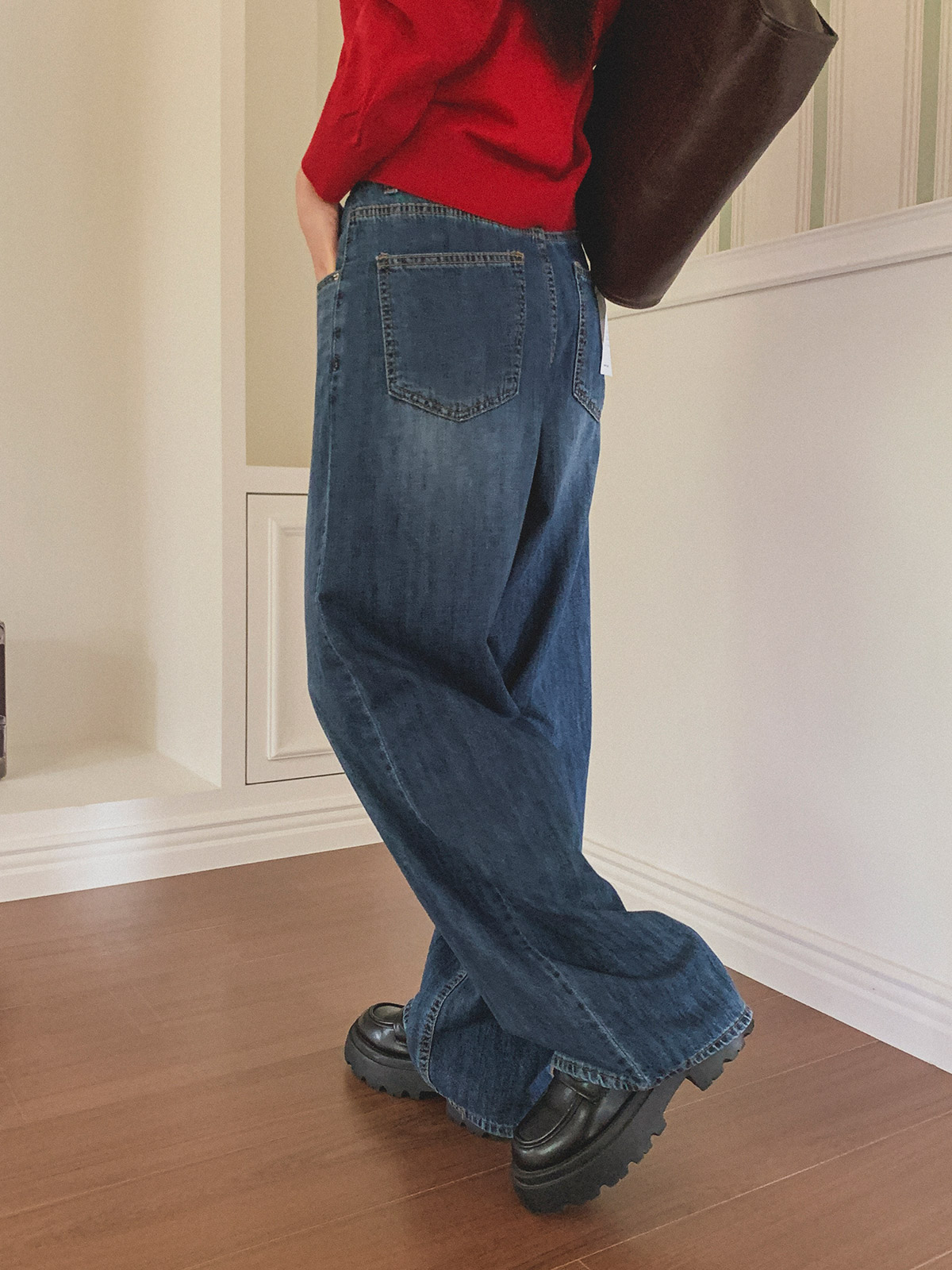 부담스럽지 않은 무게감으로 편안한 착용감을 주는 일자 와이드핏 데님 팬츠