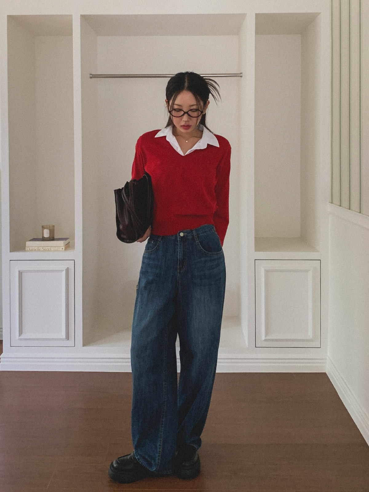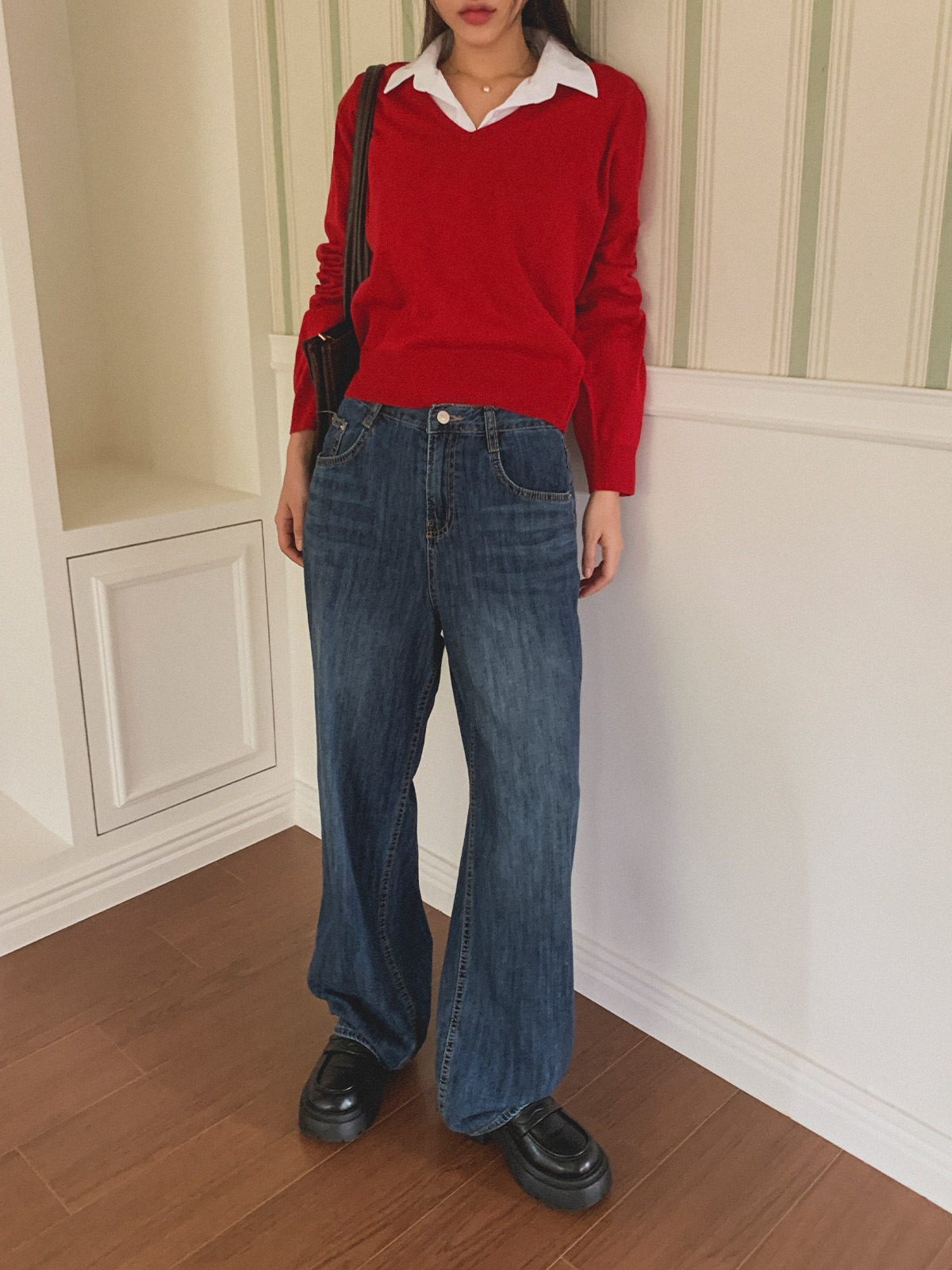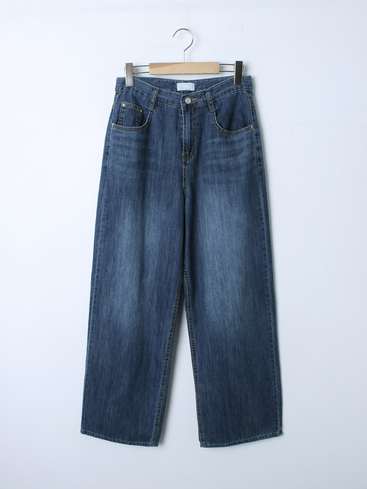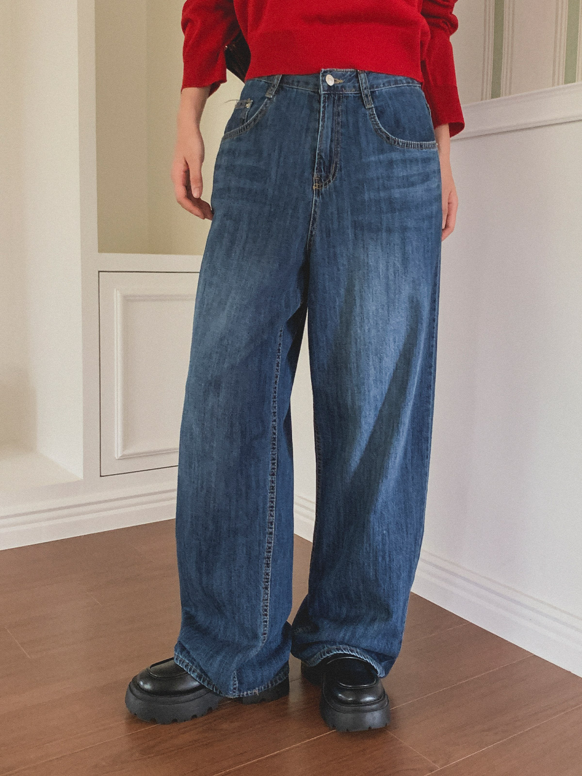 부담스럽지 않은 무게감으로 편안한 착용감을 주는 일자 와이드핏 데님 팬츠