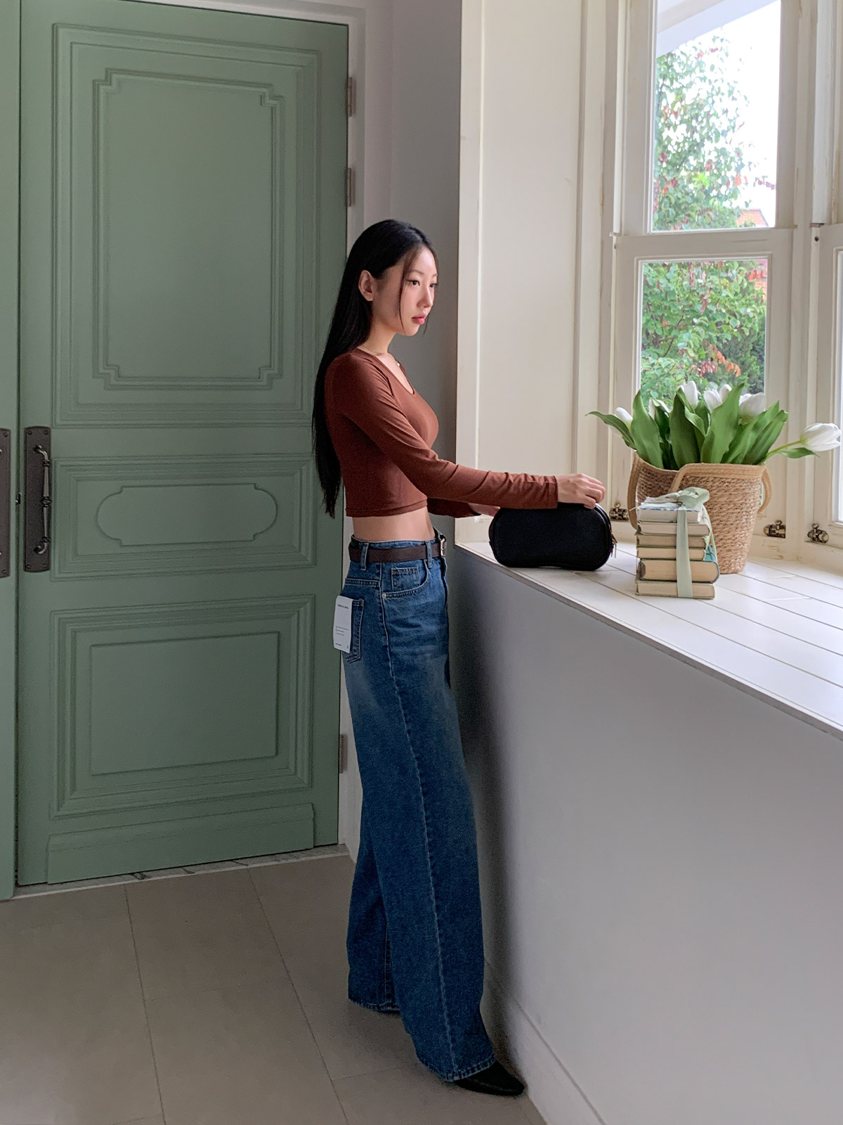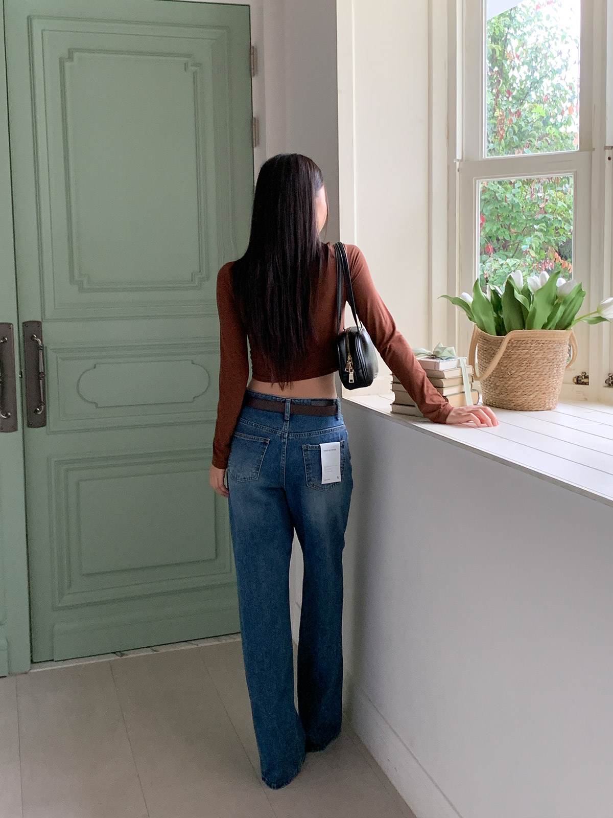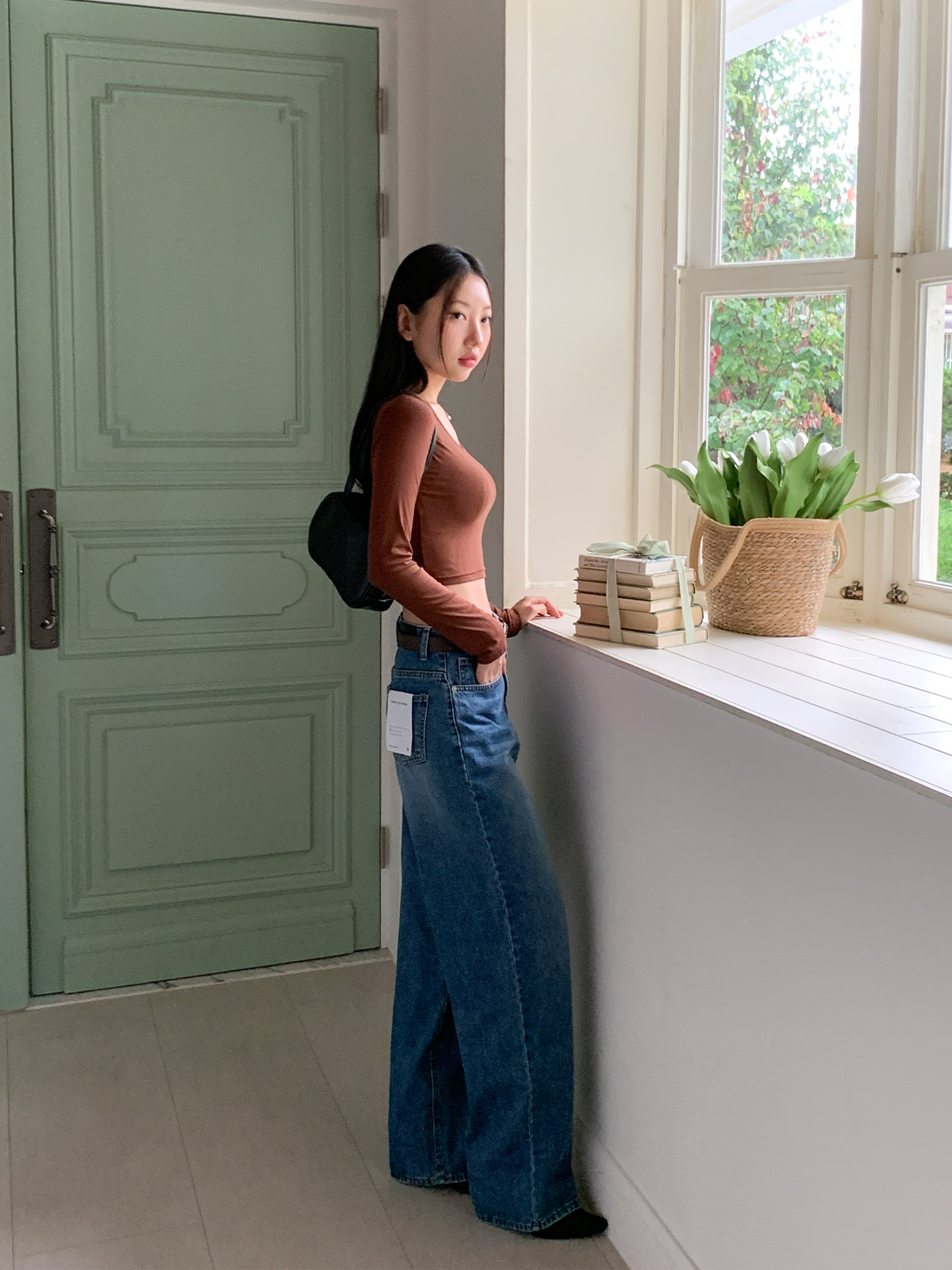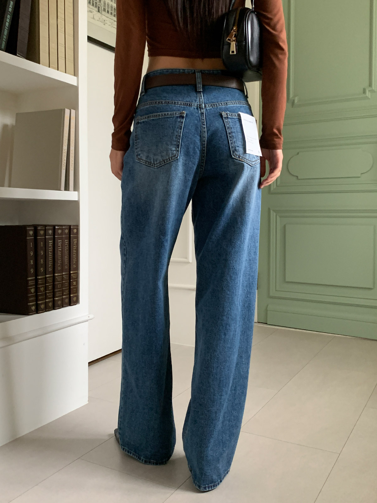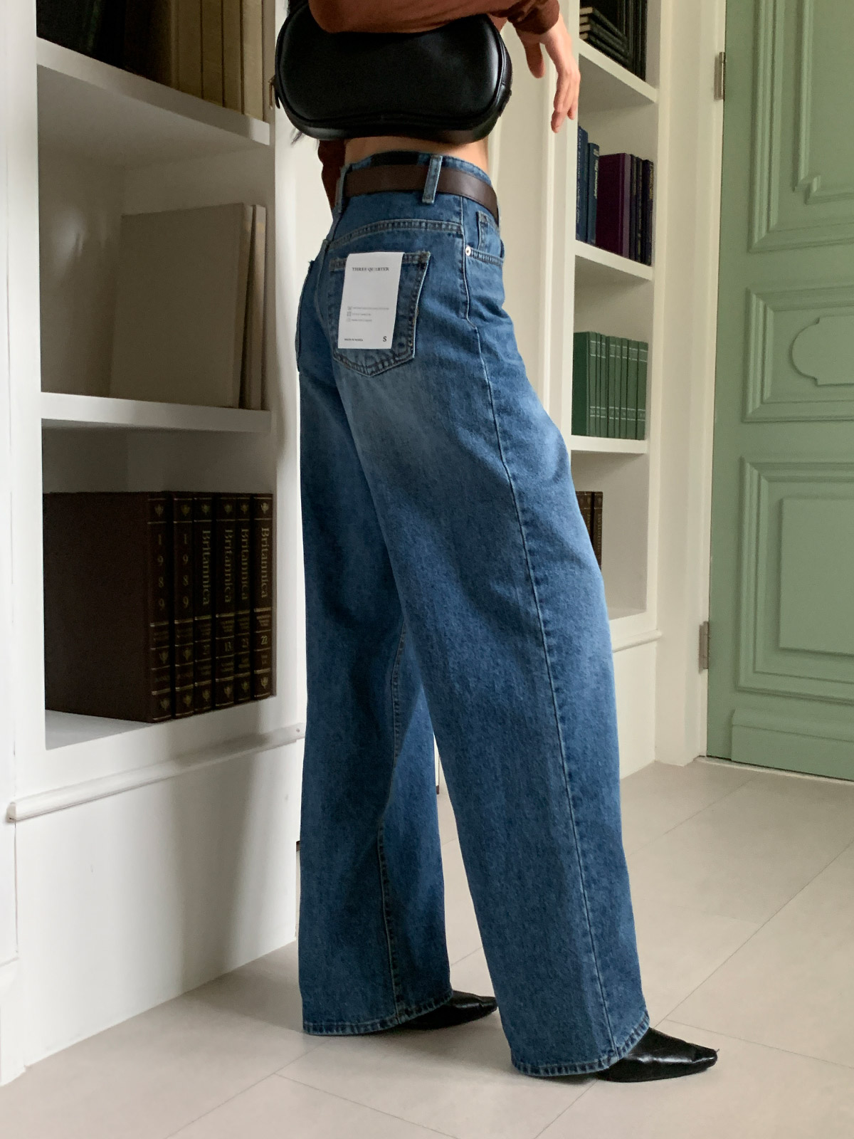 베이직한 디자인과 스탠다드하게 떨어지는 실루엣이 매력적인 와이드 데님 팬츠