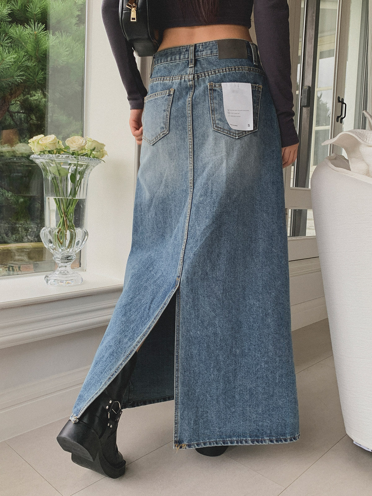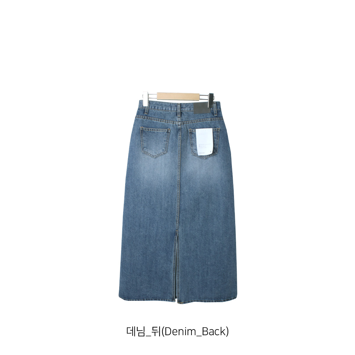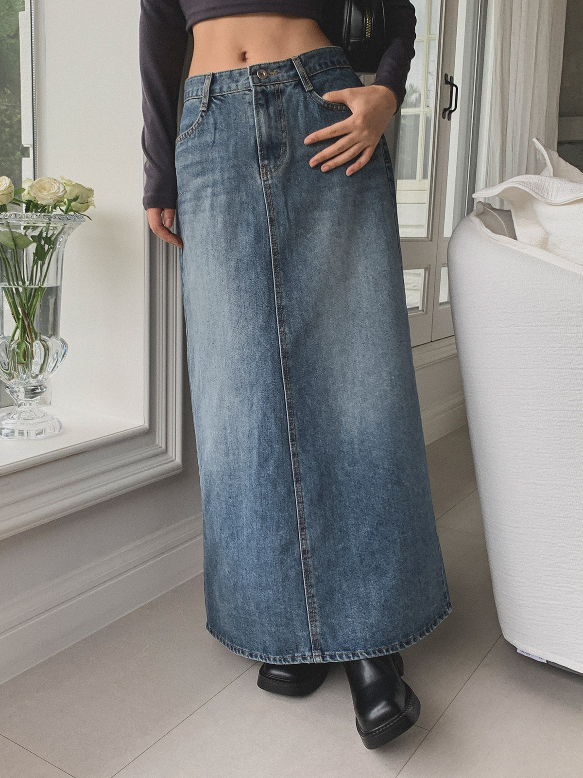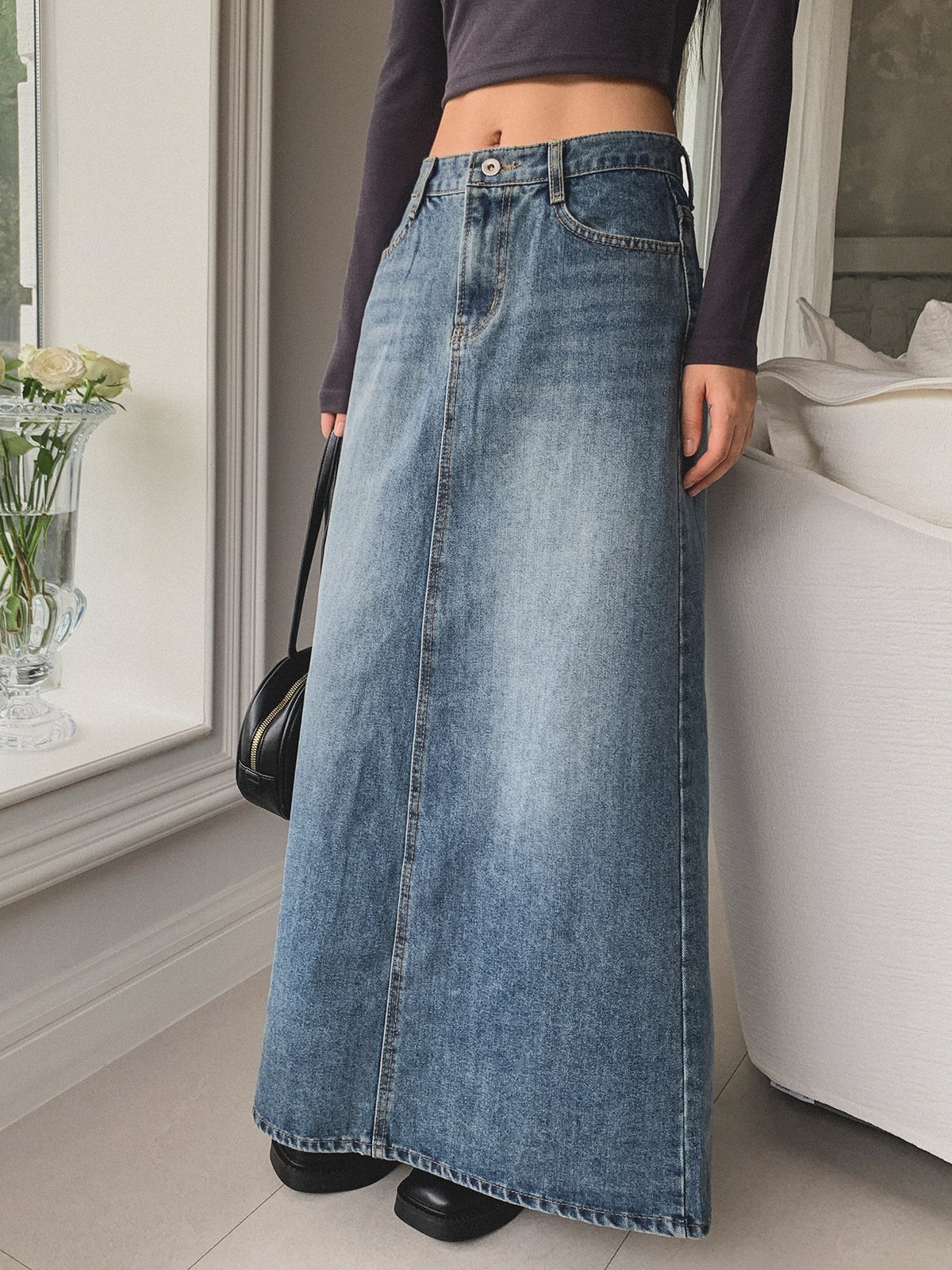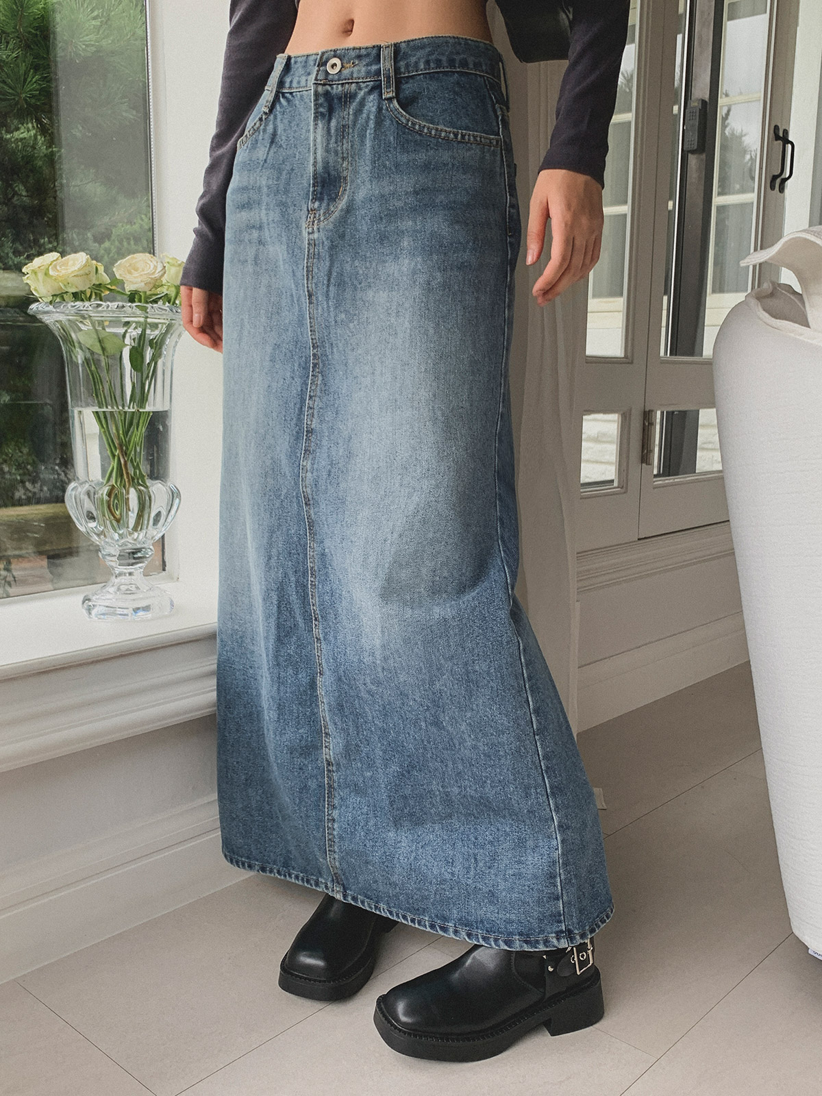 깔끔하면서 빈티지한 워싱과 뒷 트임 디자인이 매력적인 데님 롱스커트