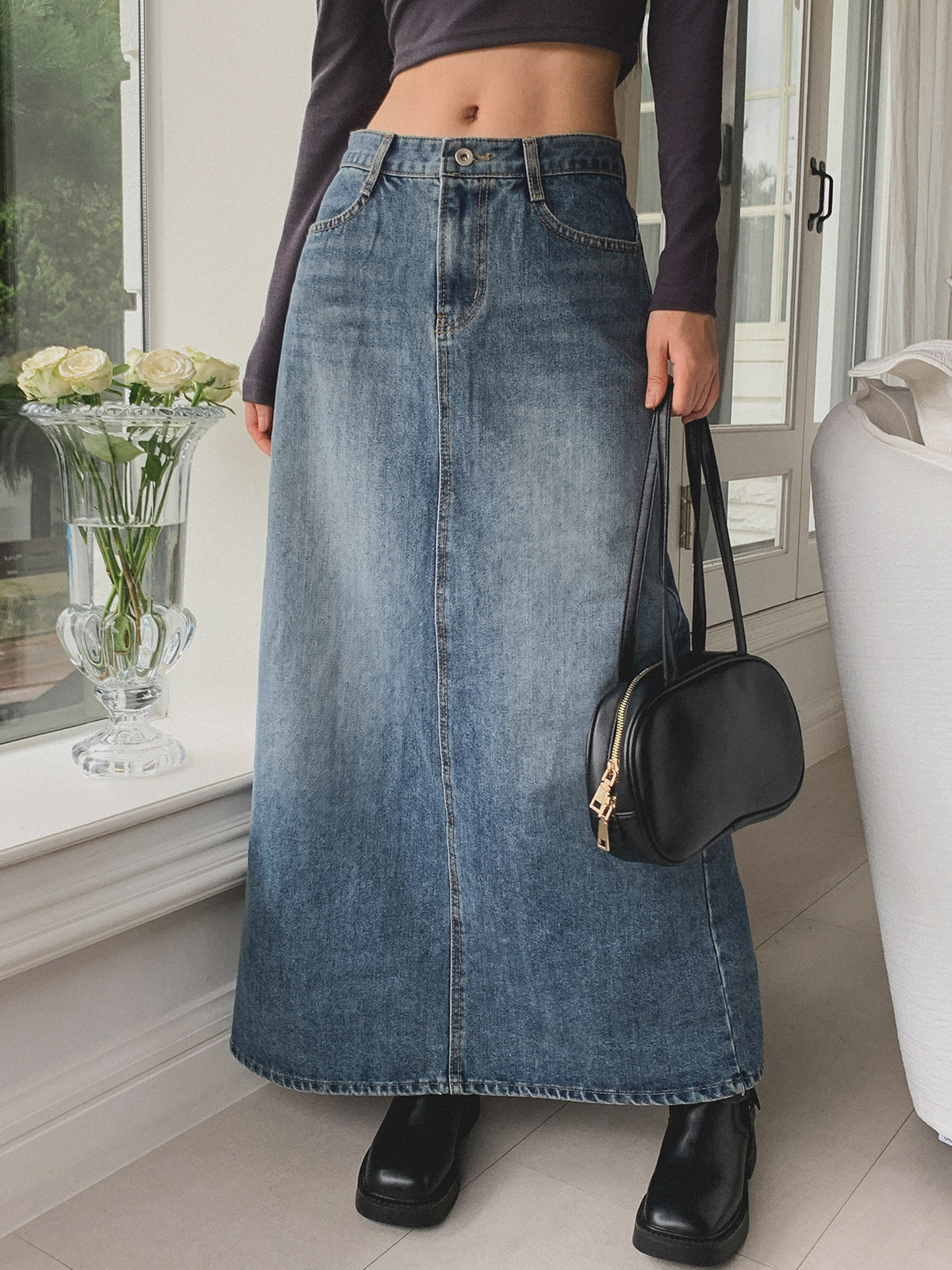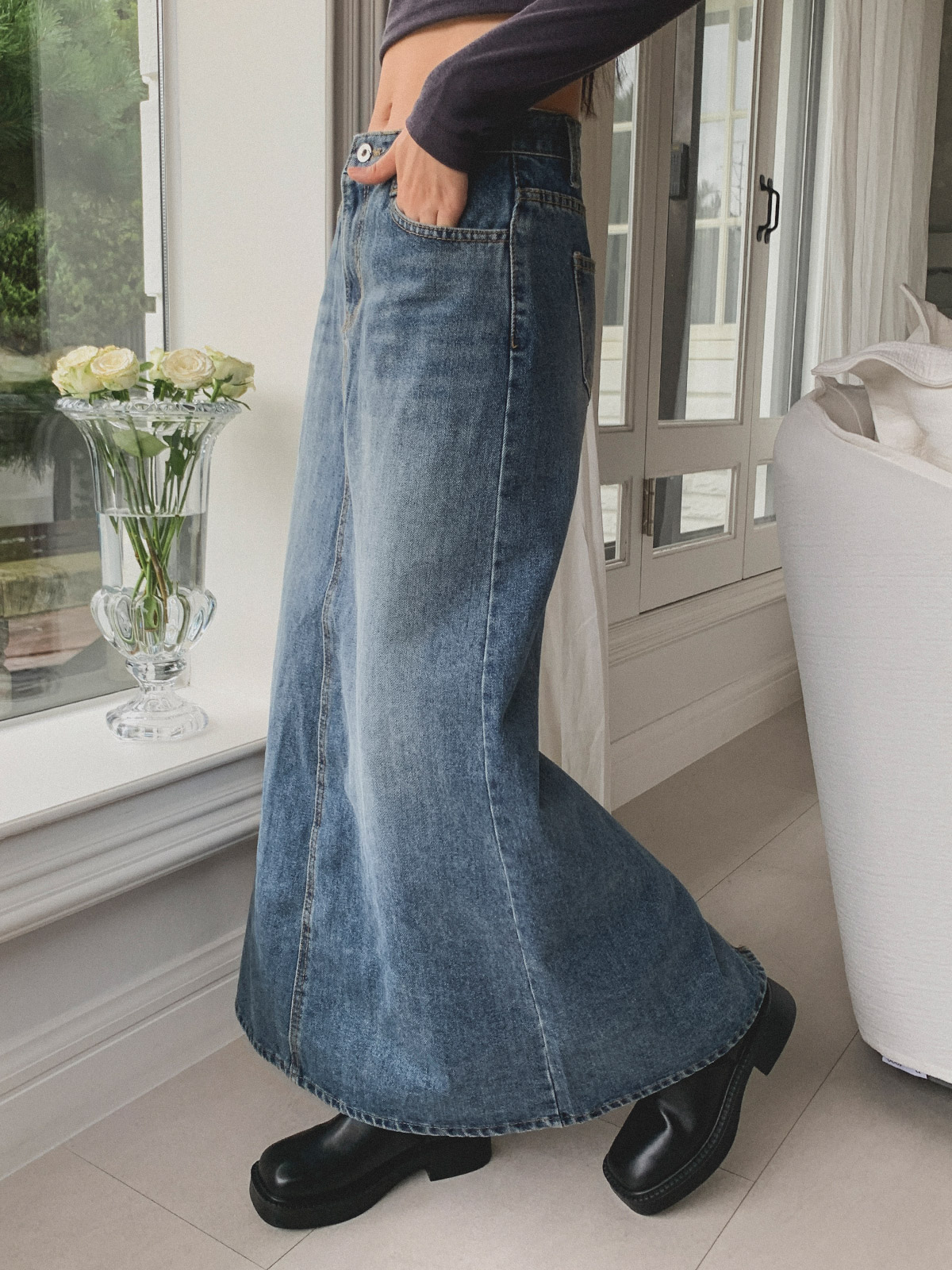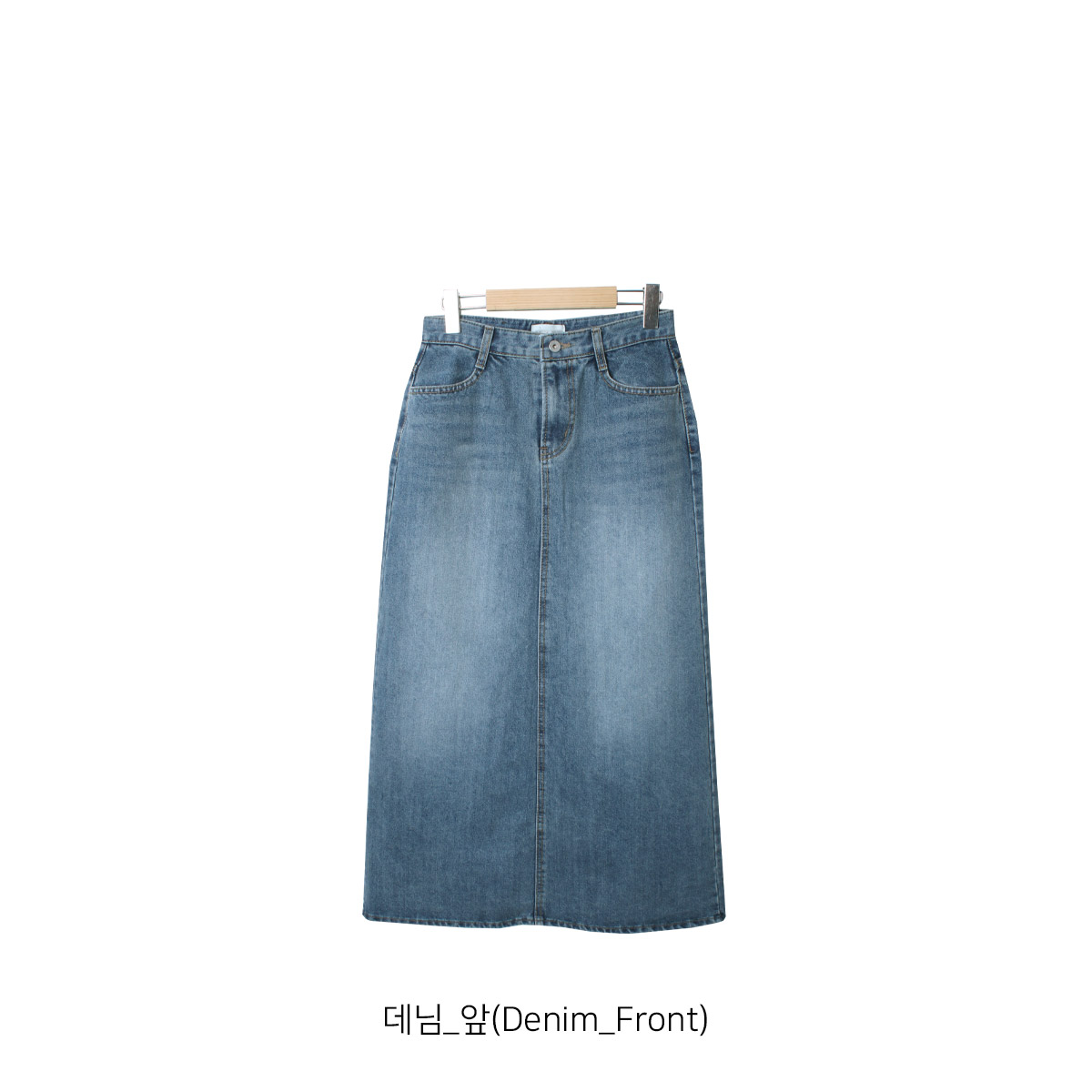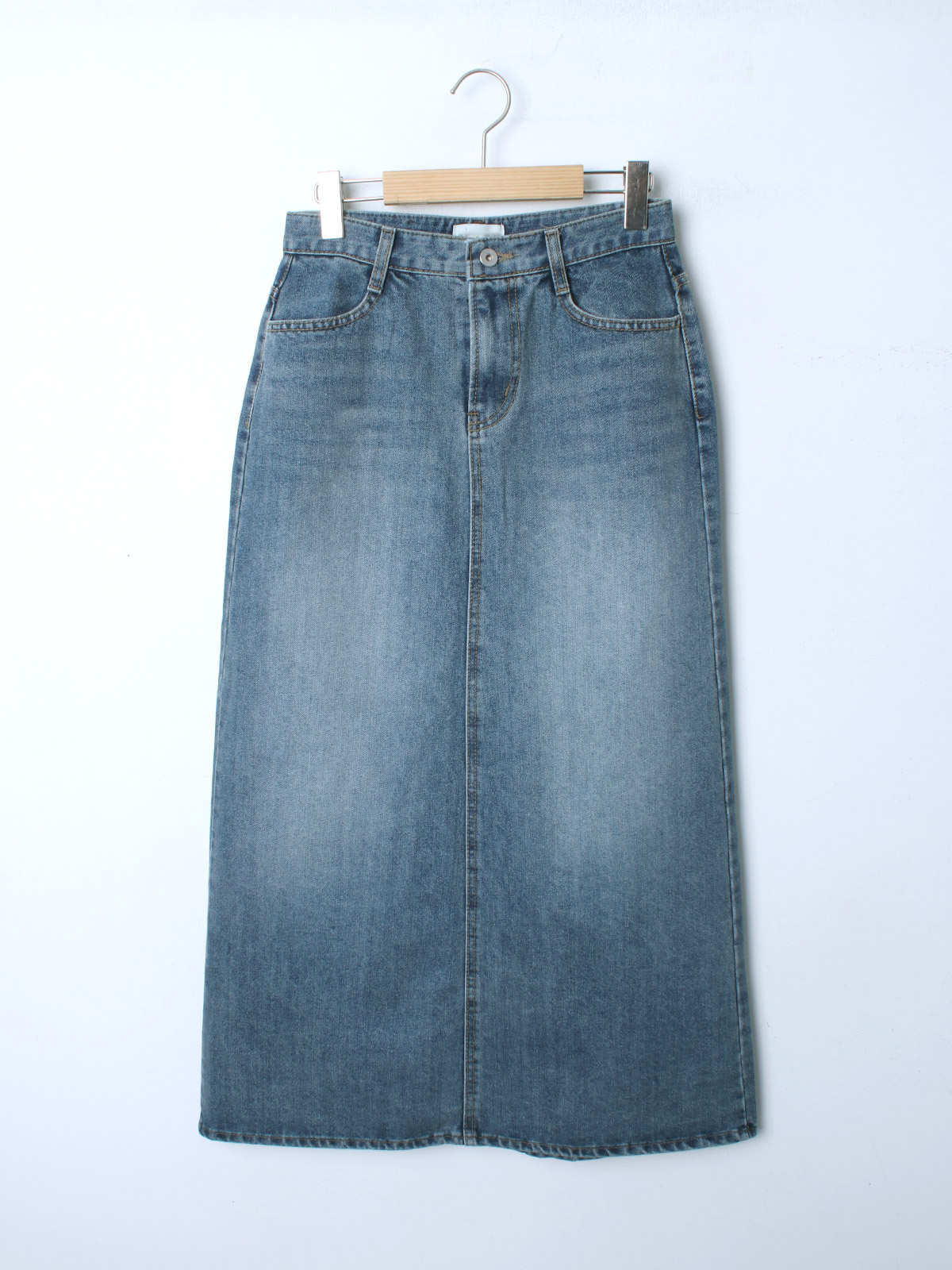 깔끔하면서 빈티지한 워싱과 뒷 트임 디자인이 매력적인 데님 롱스커트