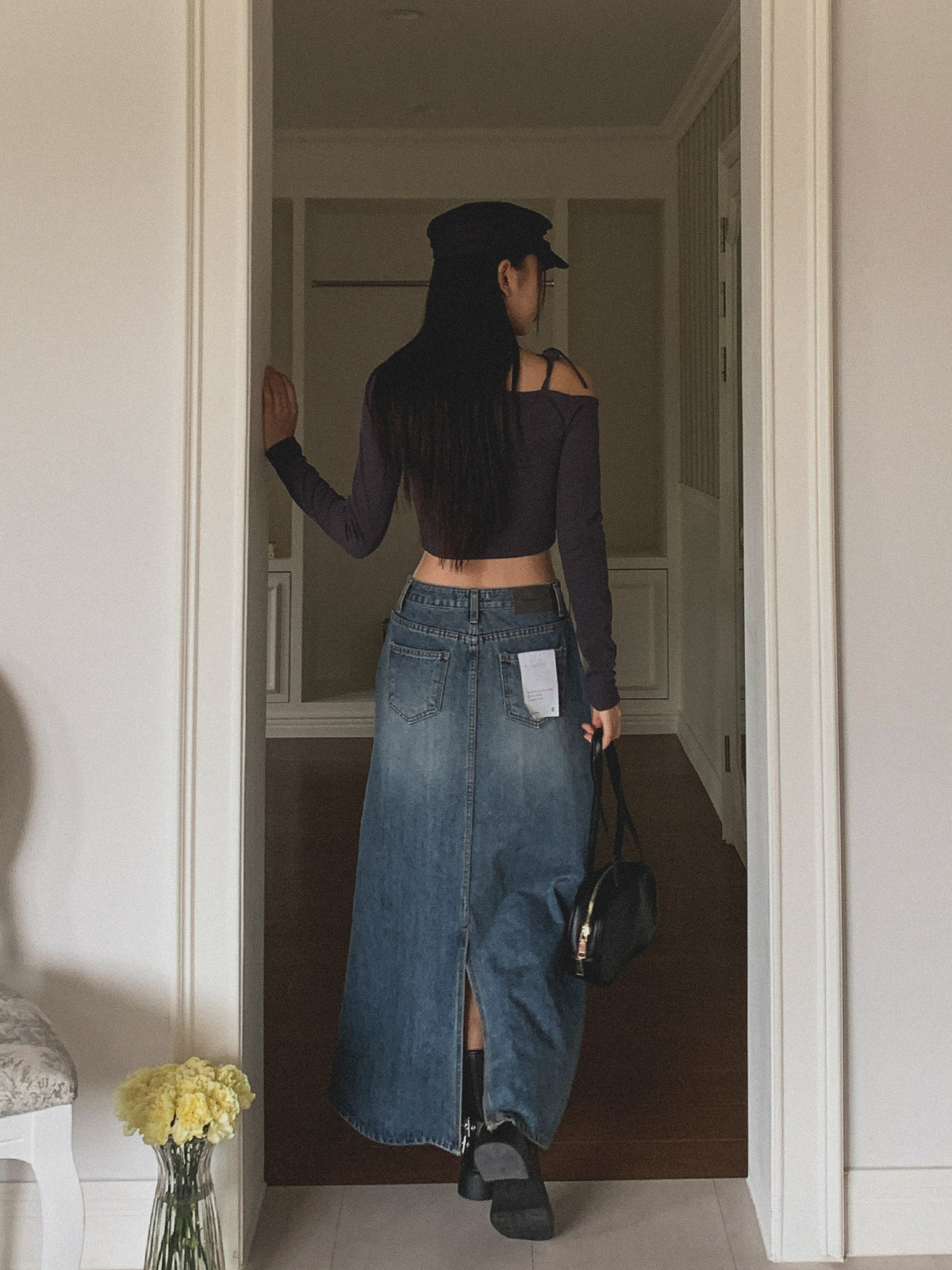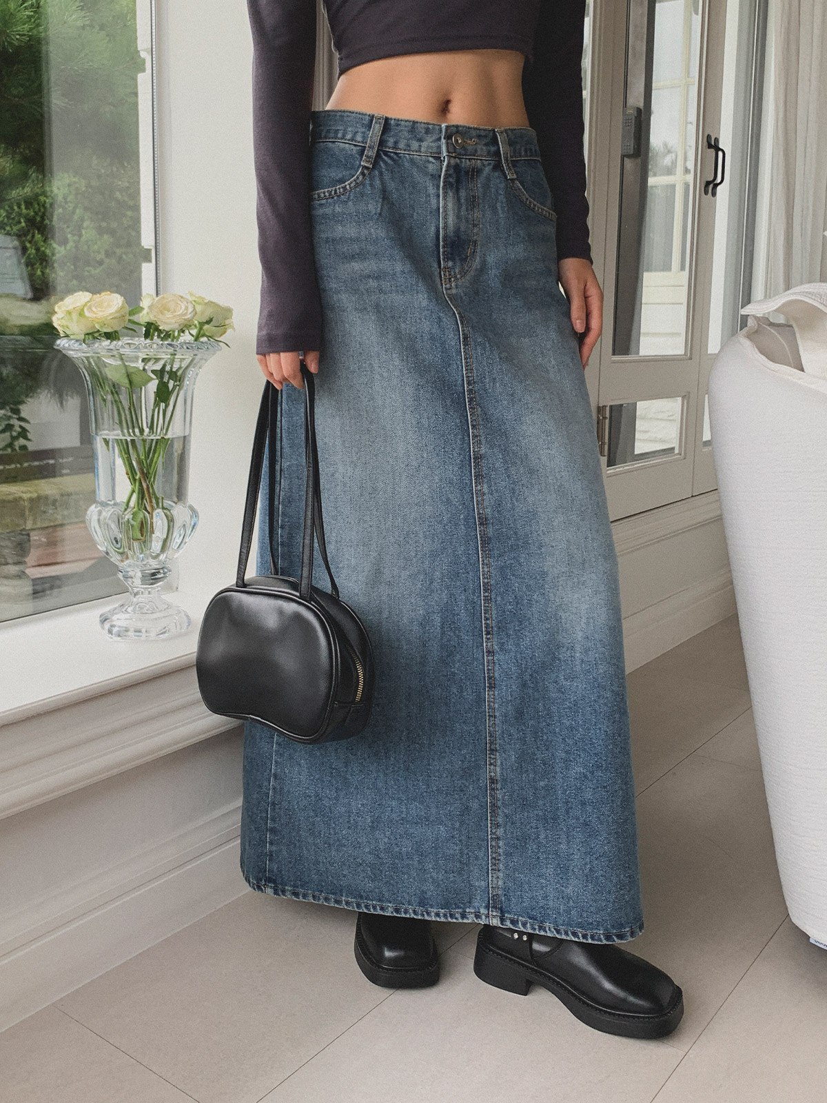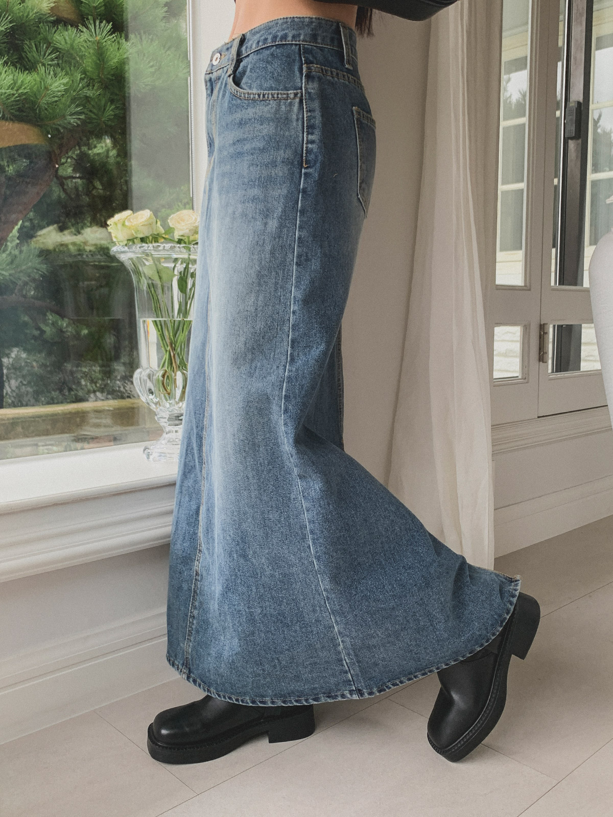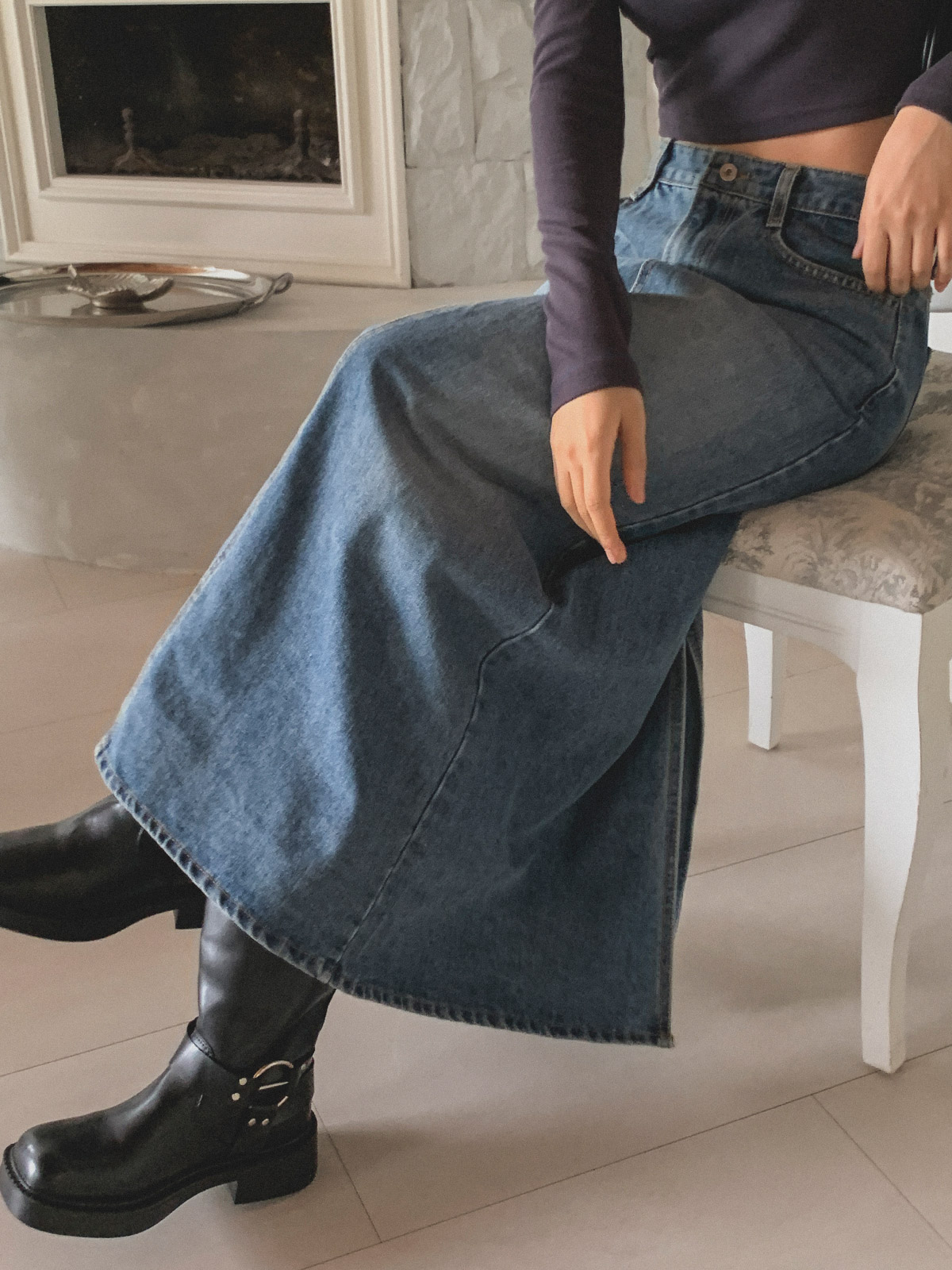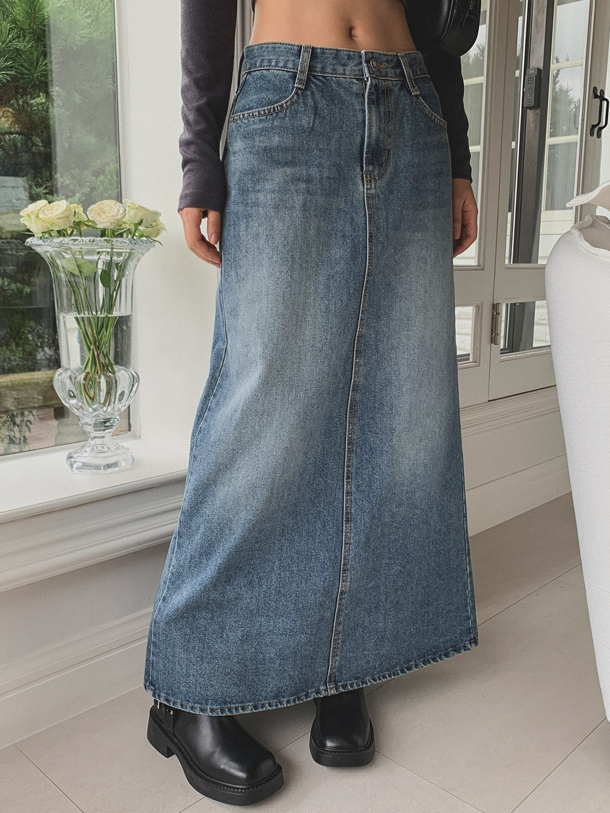 깔끔하면서 빈티지한 워싱과 뒷 트임 디자인이 매력적인 데님 롱스커트