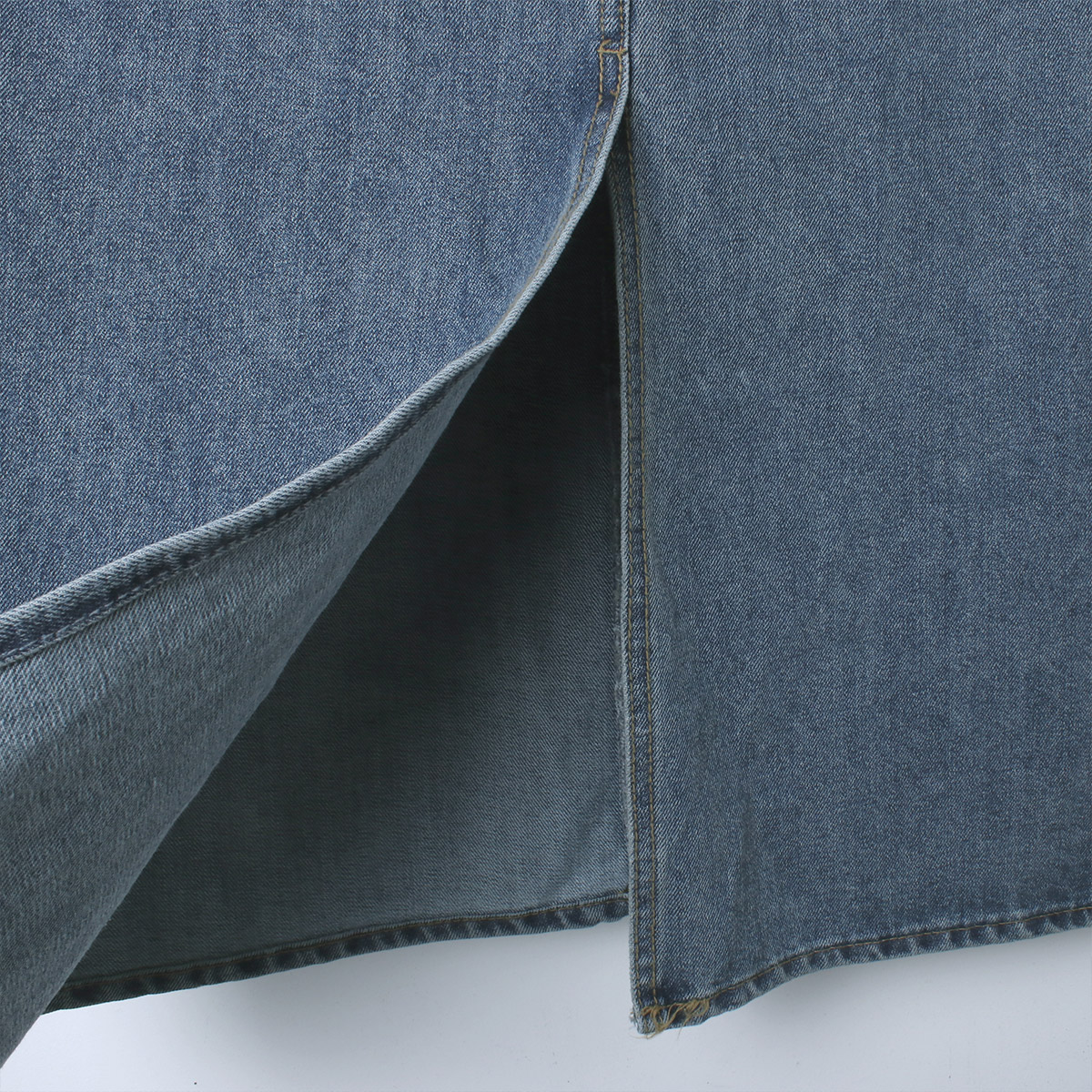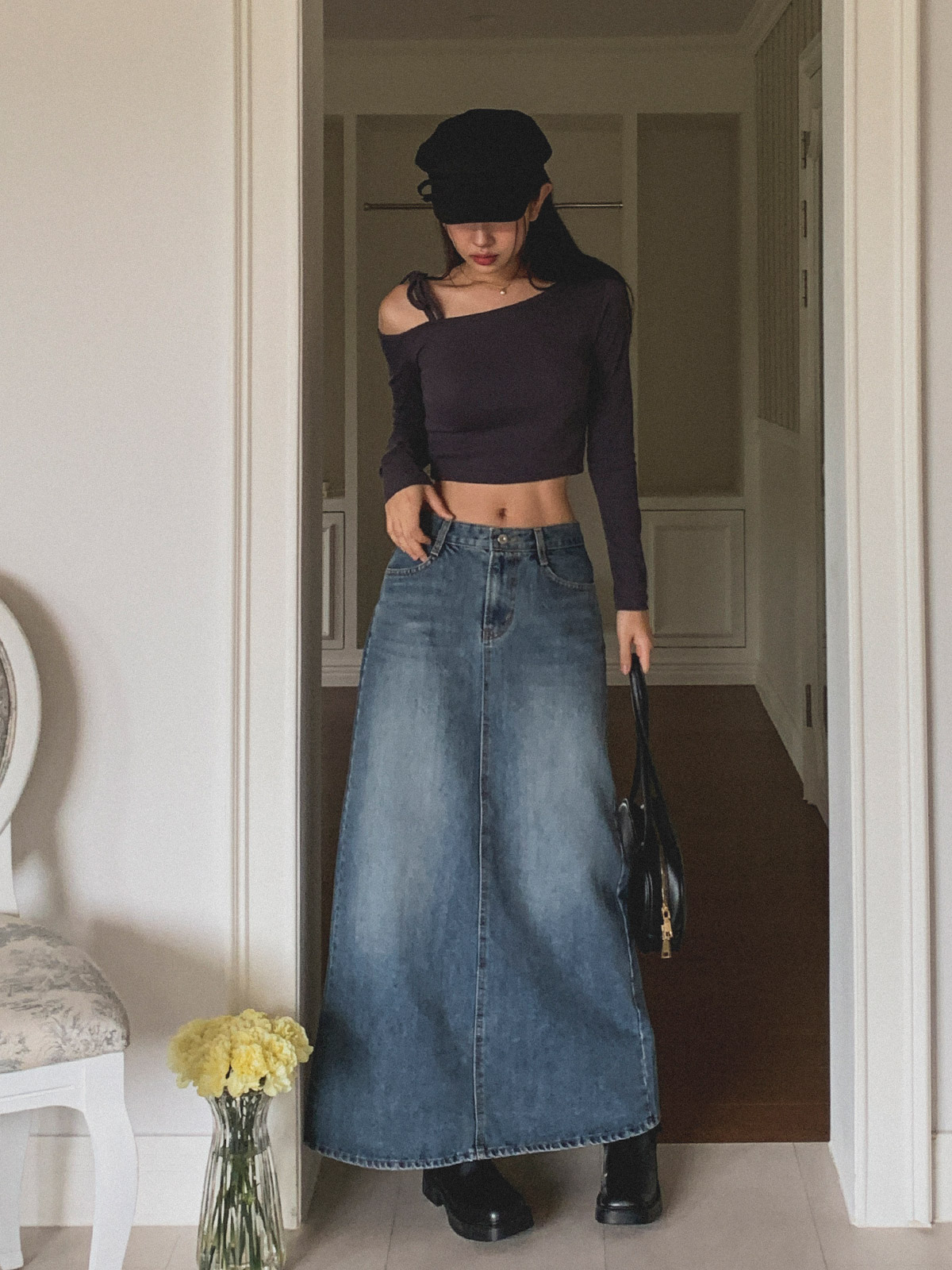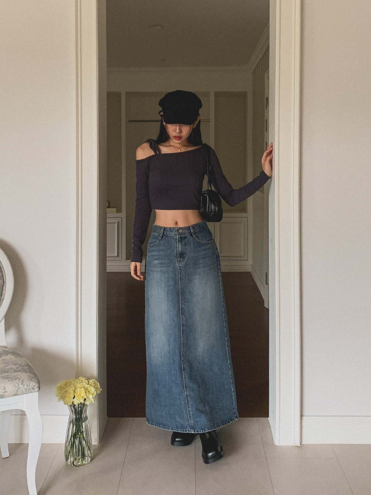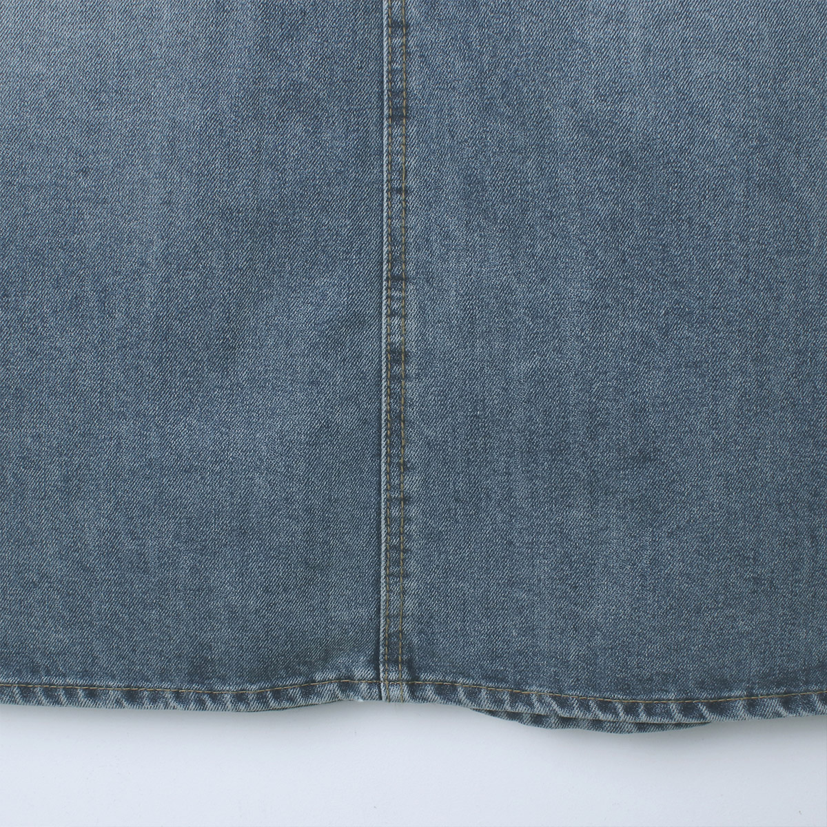 깔끔하면서 빈티지한 워싱과 뒷 트임 디자인이 매력적인 데님 롱스커트