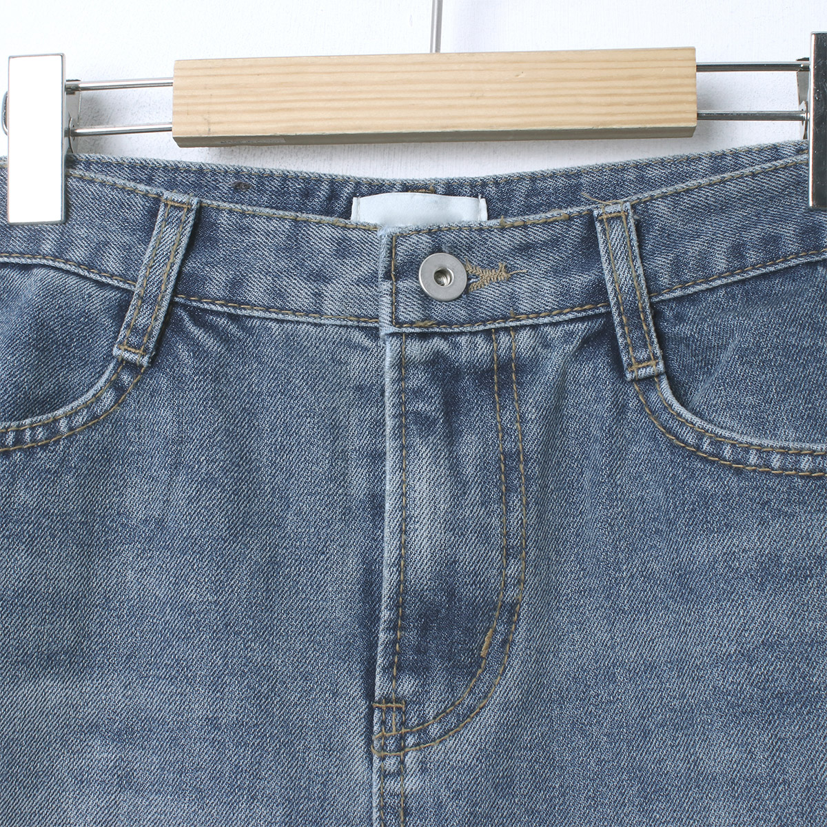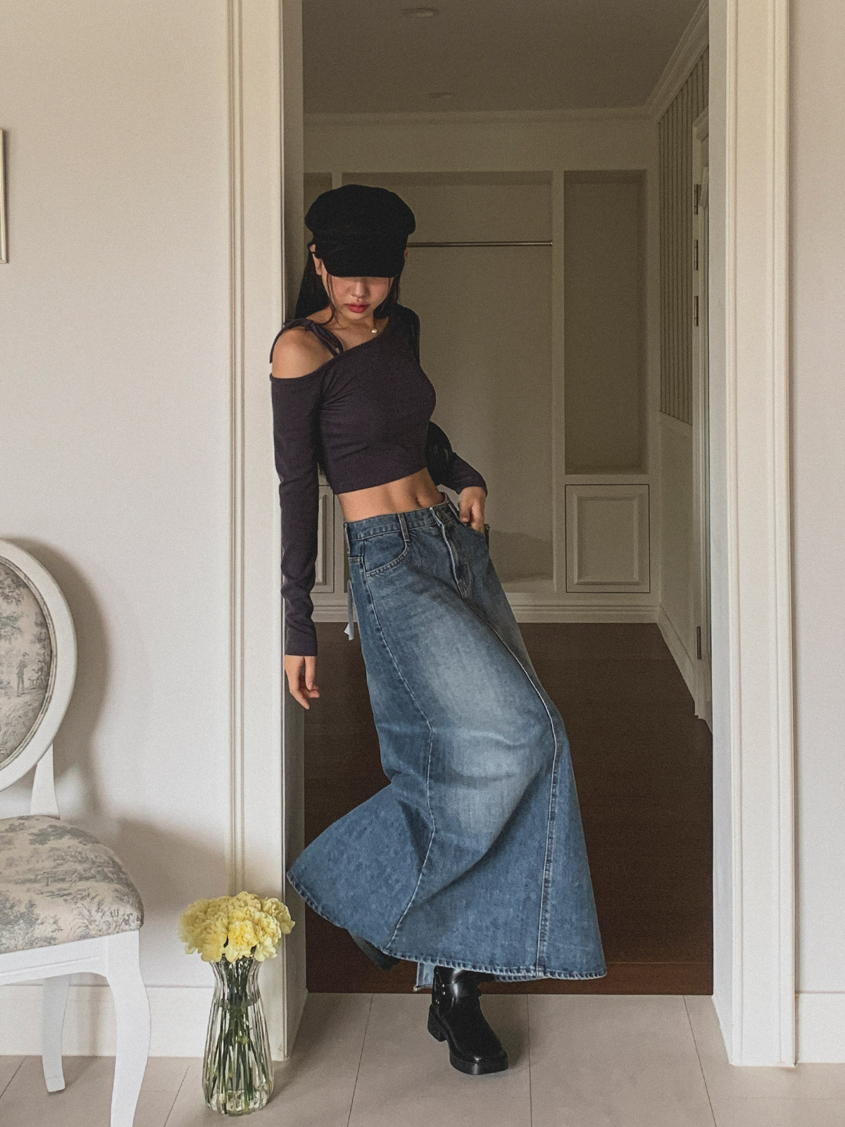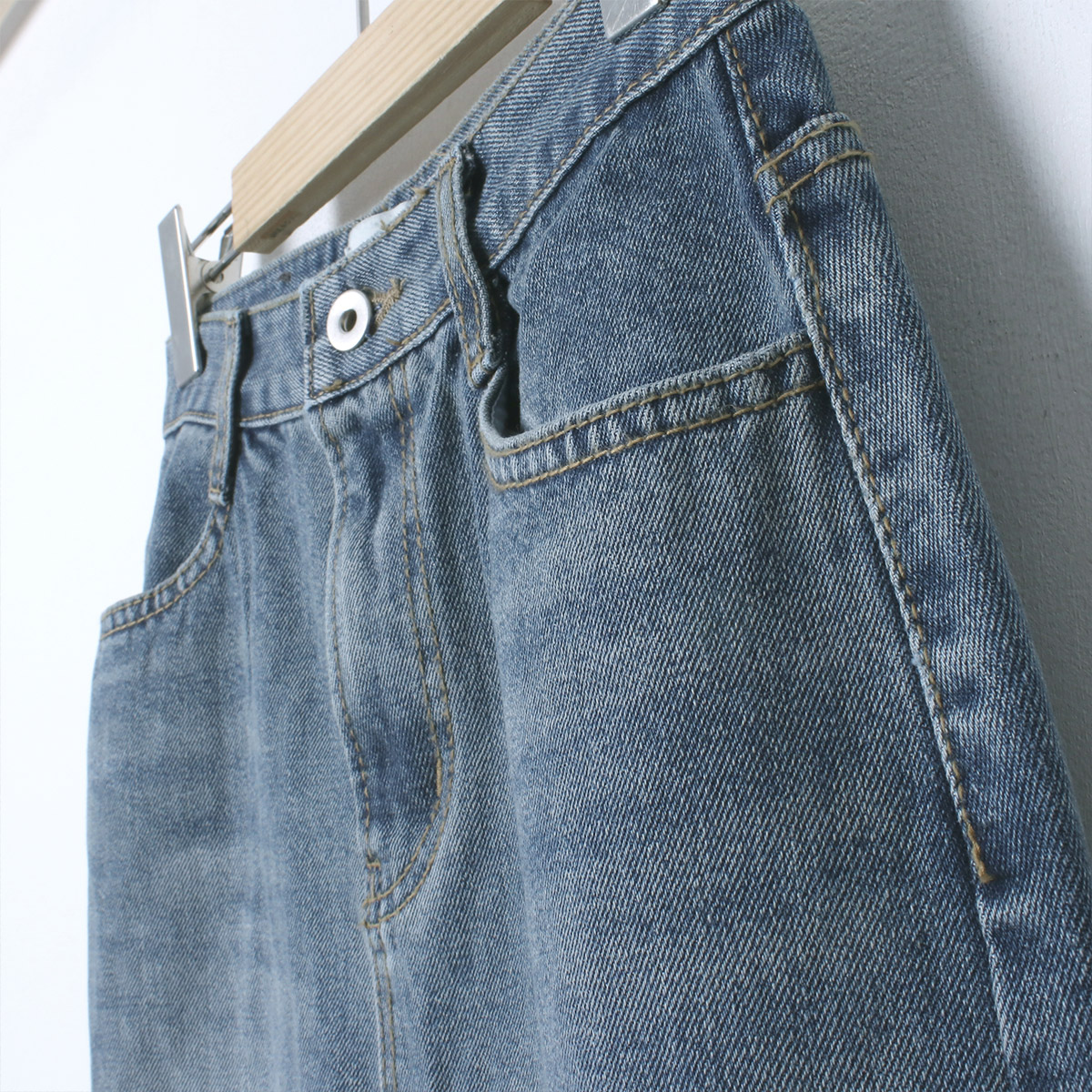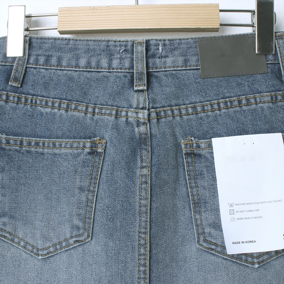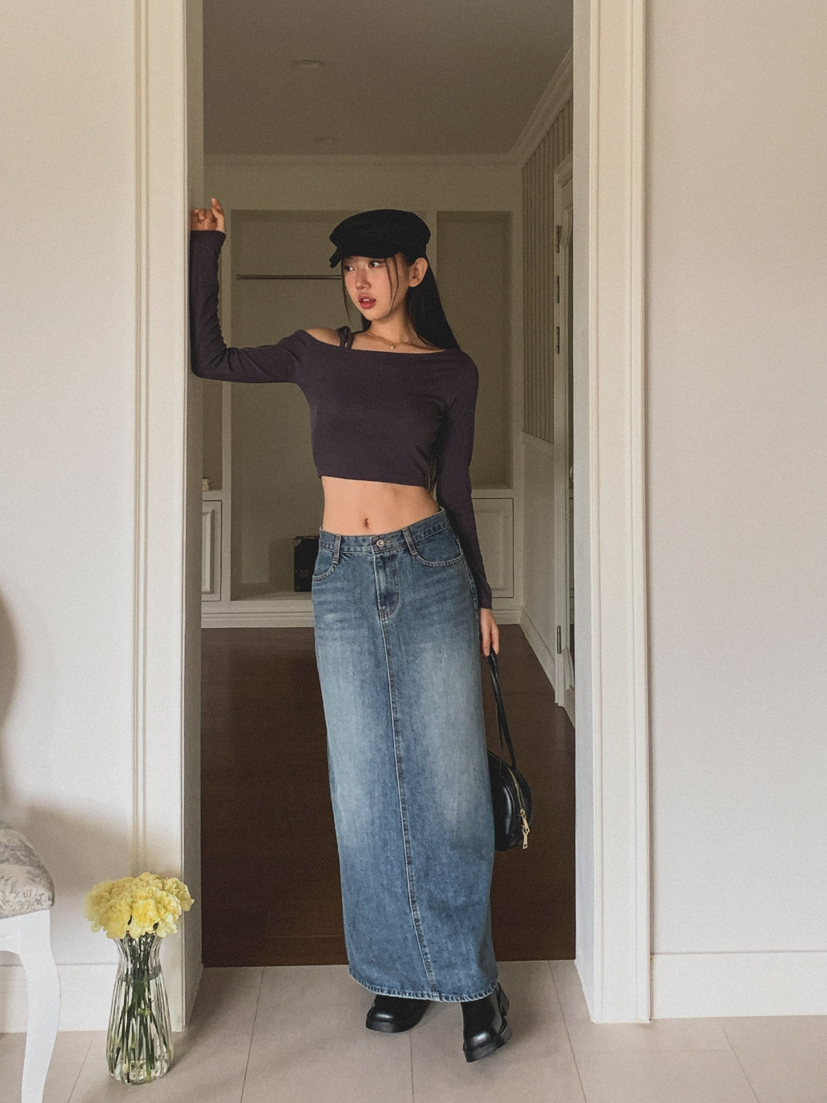 깔끔하면서 빈티지한 워싱과 뒷 트임 디자인이 매력적인 데님 롱스커트