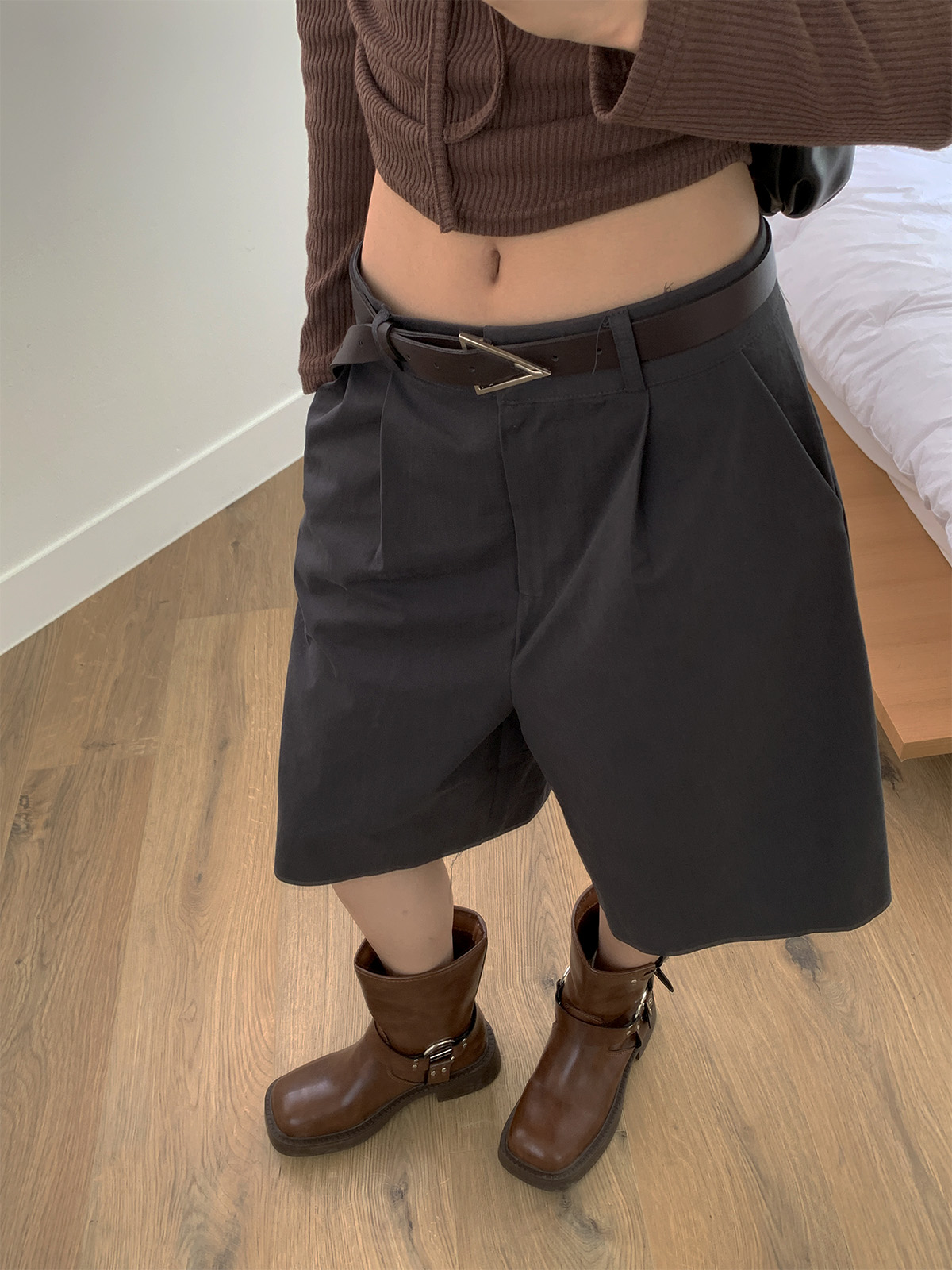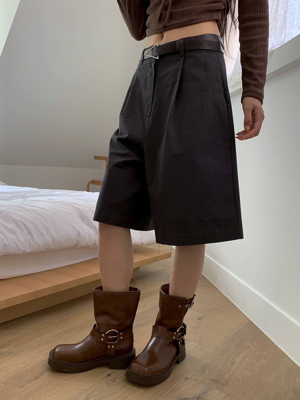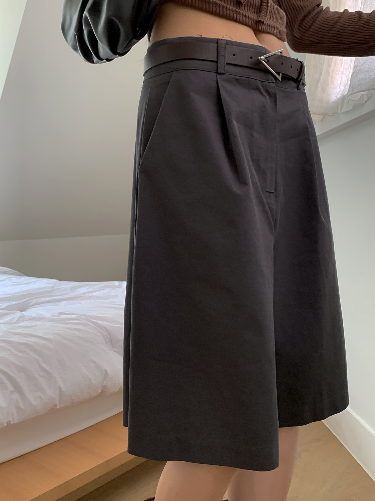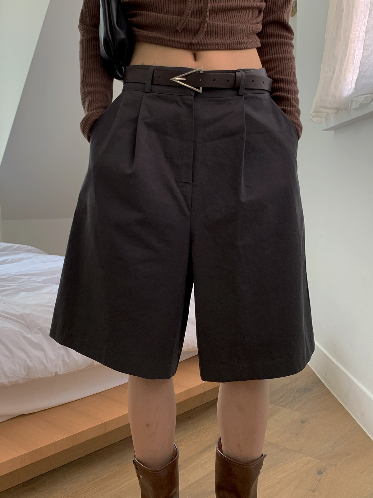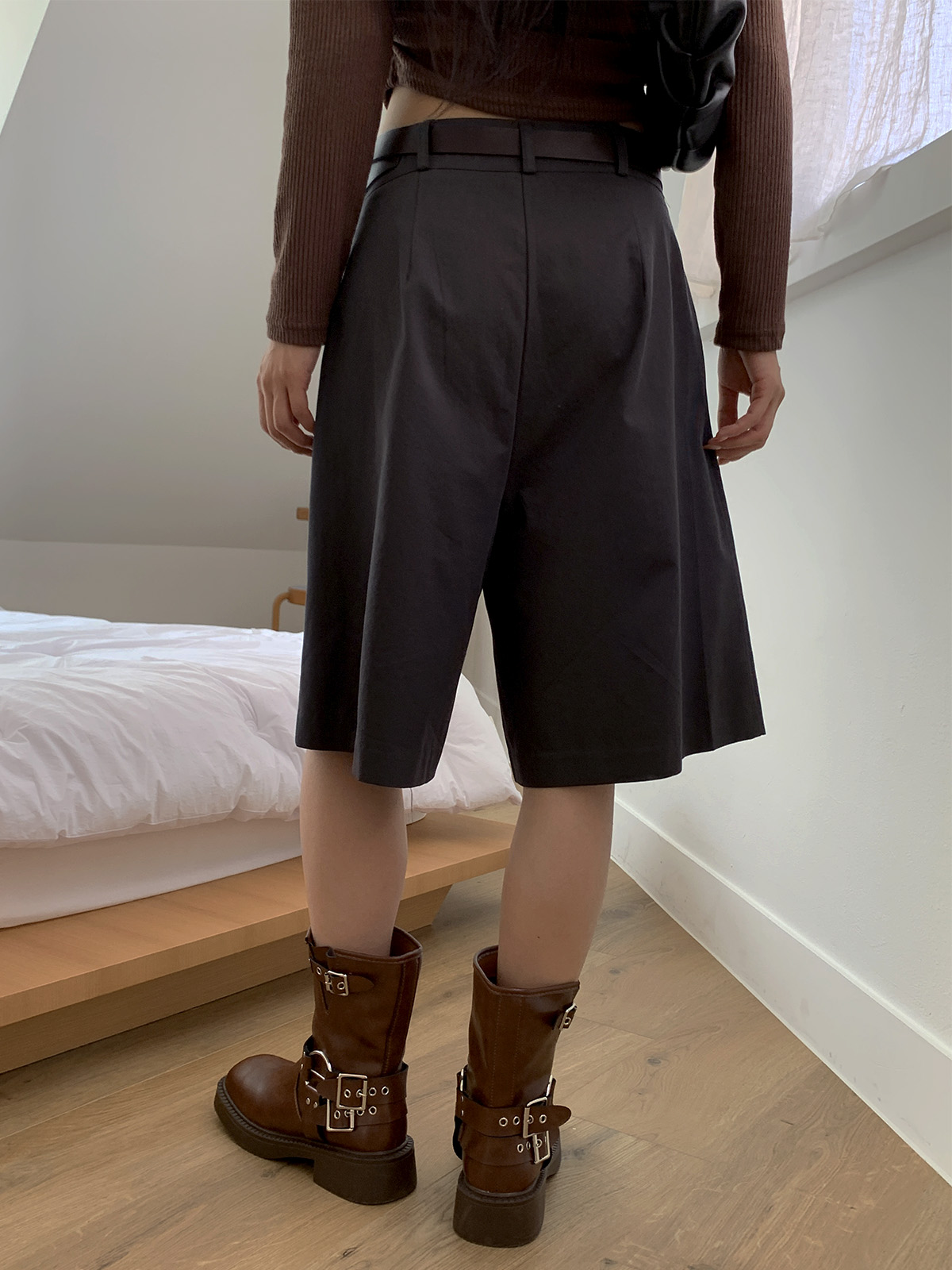 깔끔하게 떨어지는 핏과 핀턱으로 포인트를 더해 밋밋하지 않아 데일리로 입기 좋은 버뮤다 팬츠