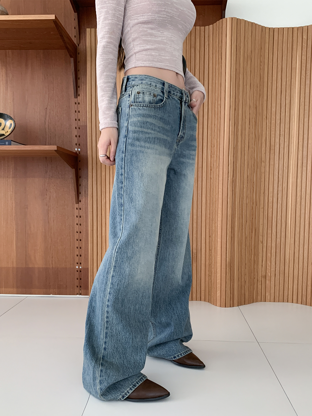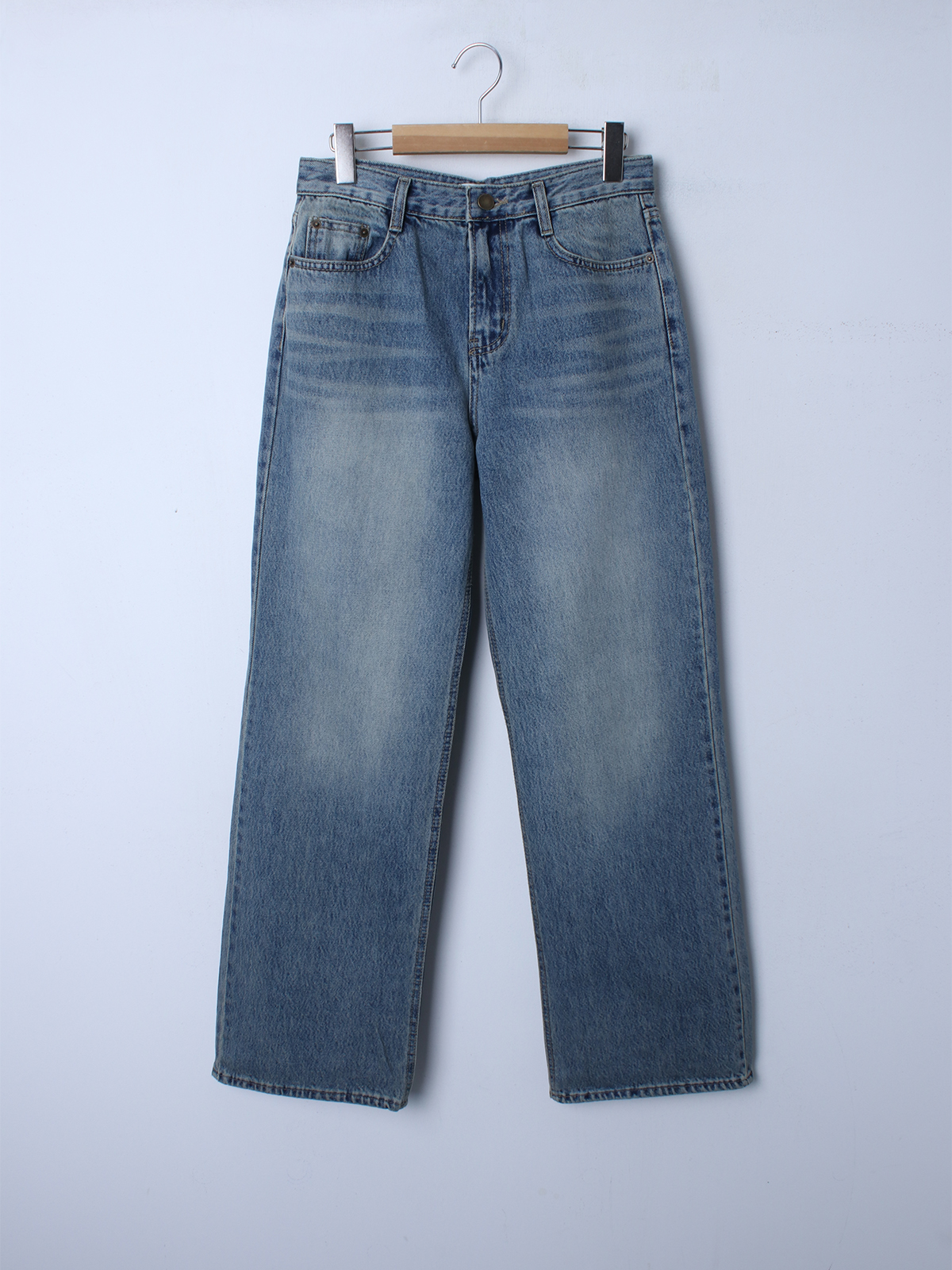 차분한 데님 컬러감의 빈티지한 무드를 담아 데일리룩에 자주 손이 가게 될 넉넉한 일자 와이드 핏감의 데님 팬츠