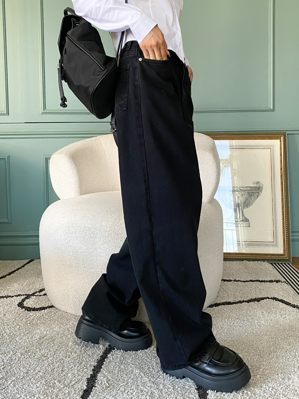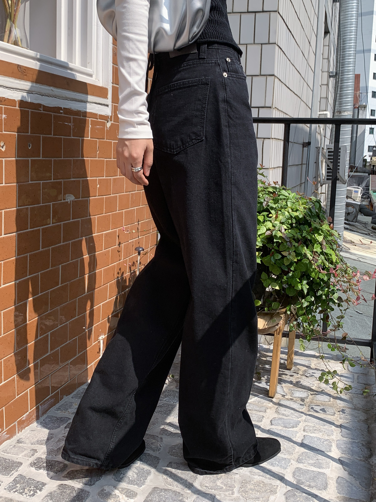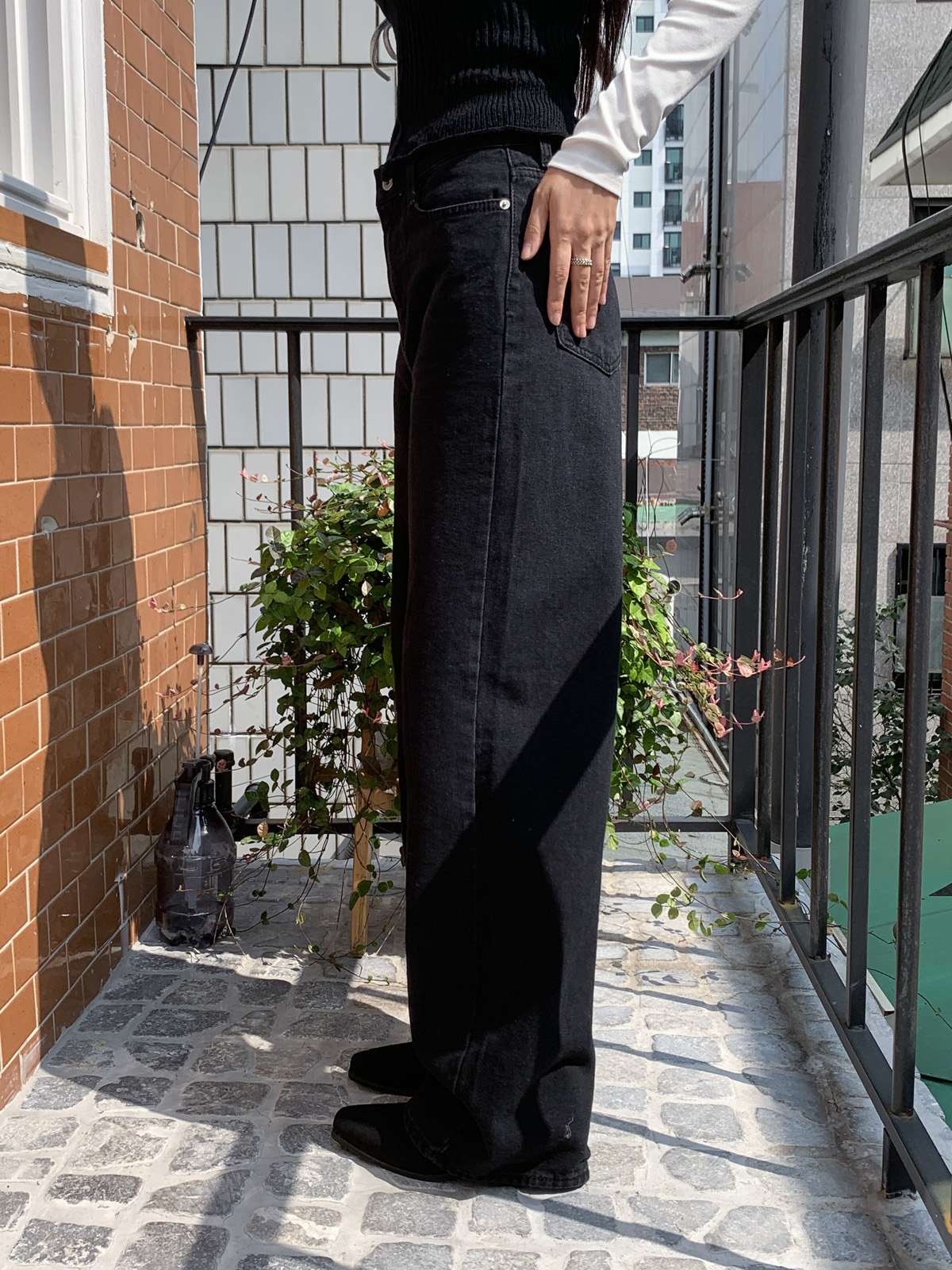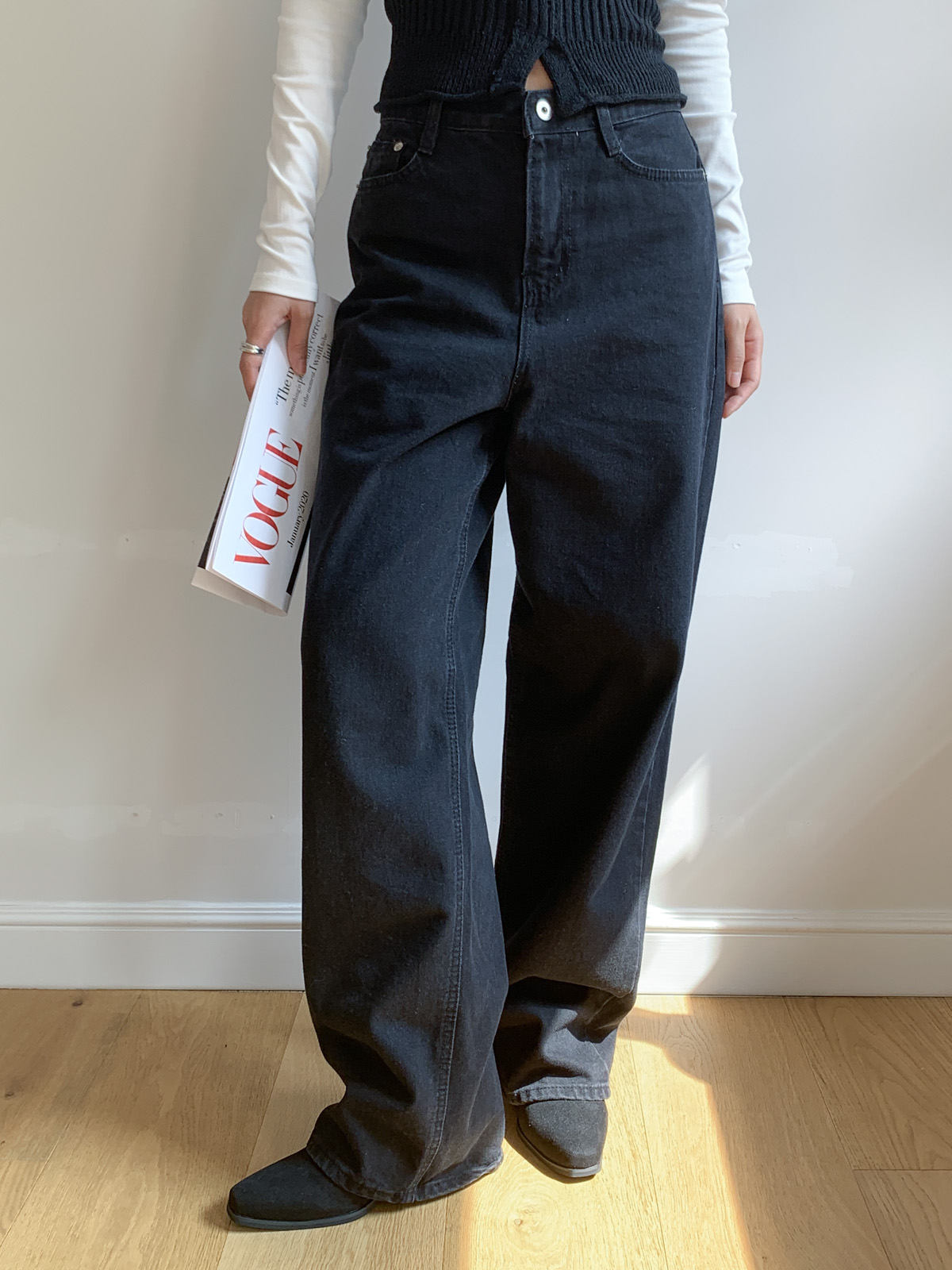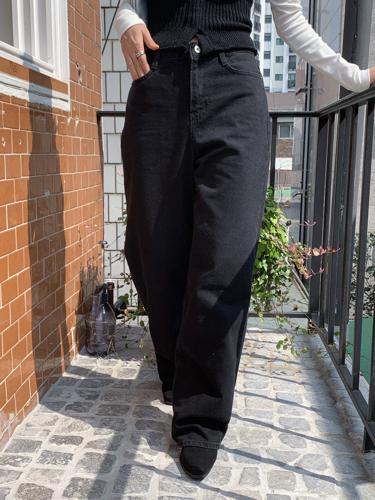 블랙의 일자핏으로 된 데님팬츠로 가장 손이 많이가고 다양한 코디가 가능하여