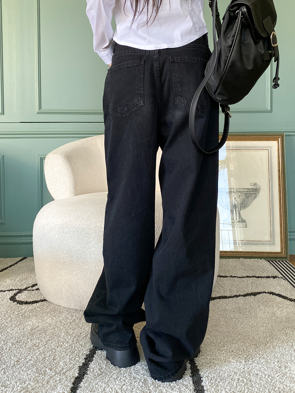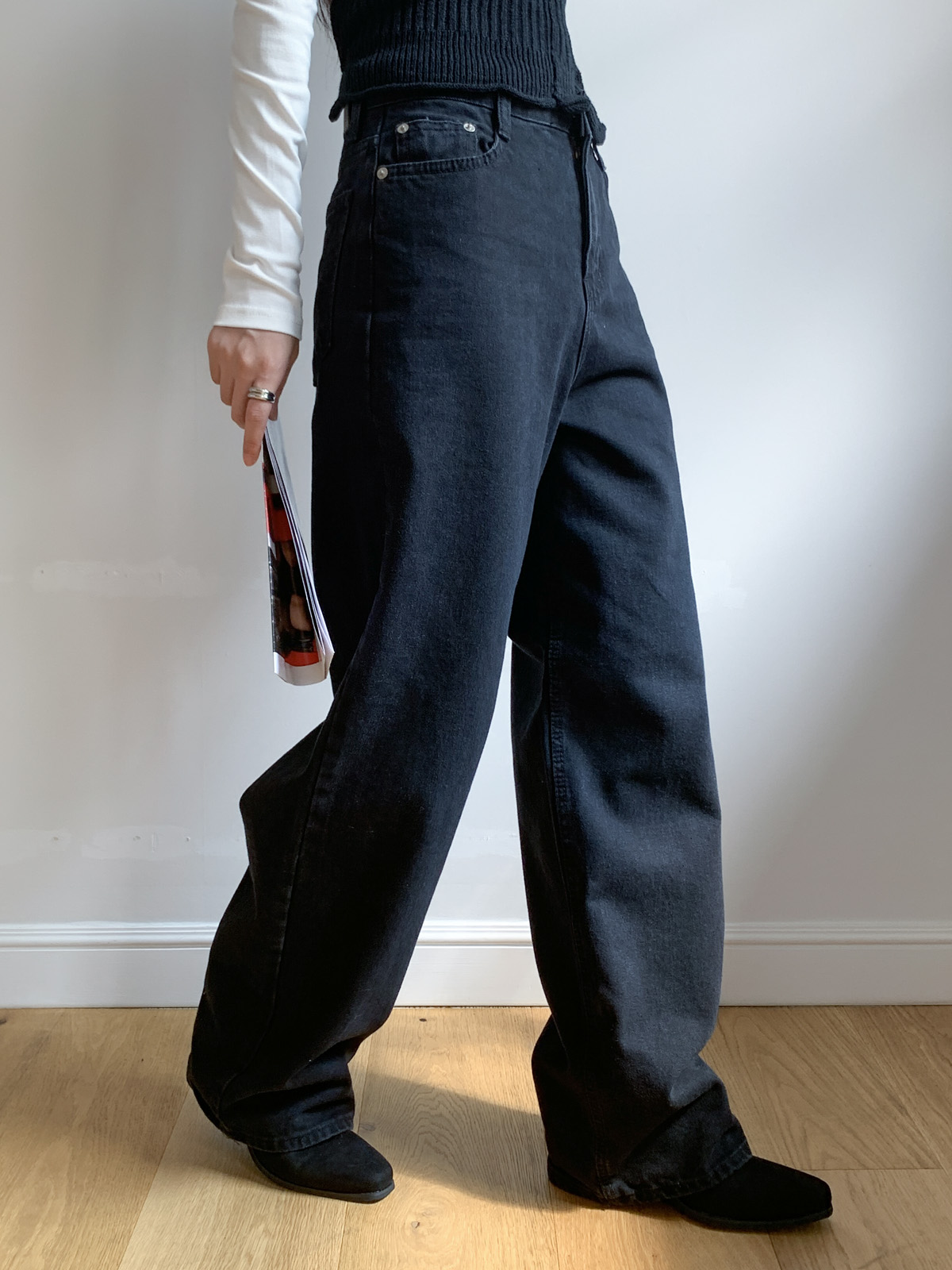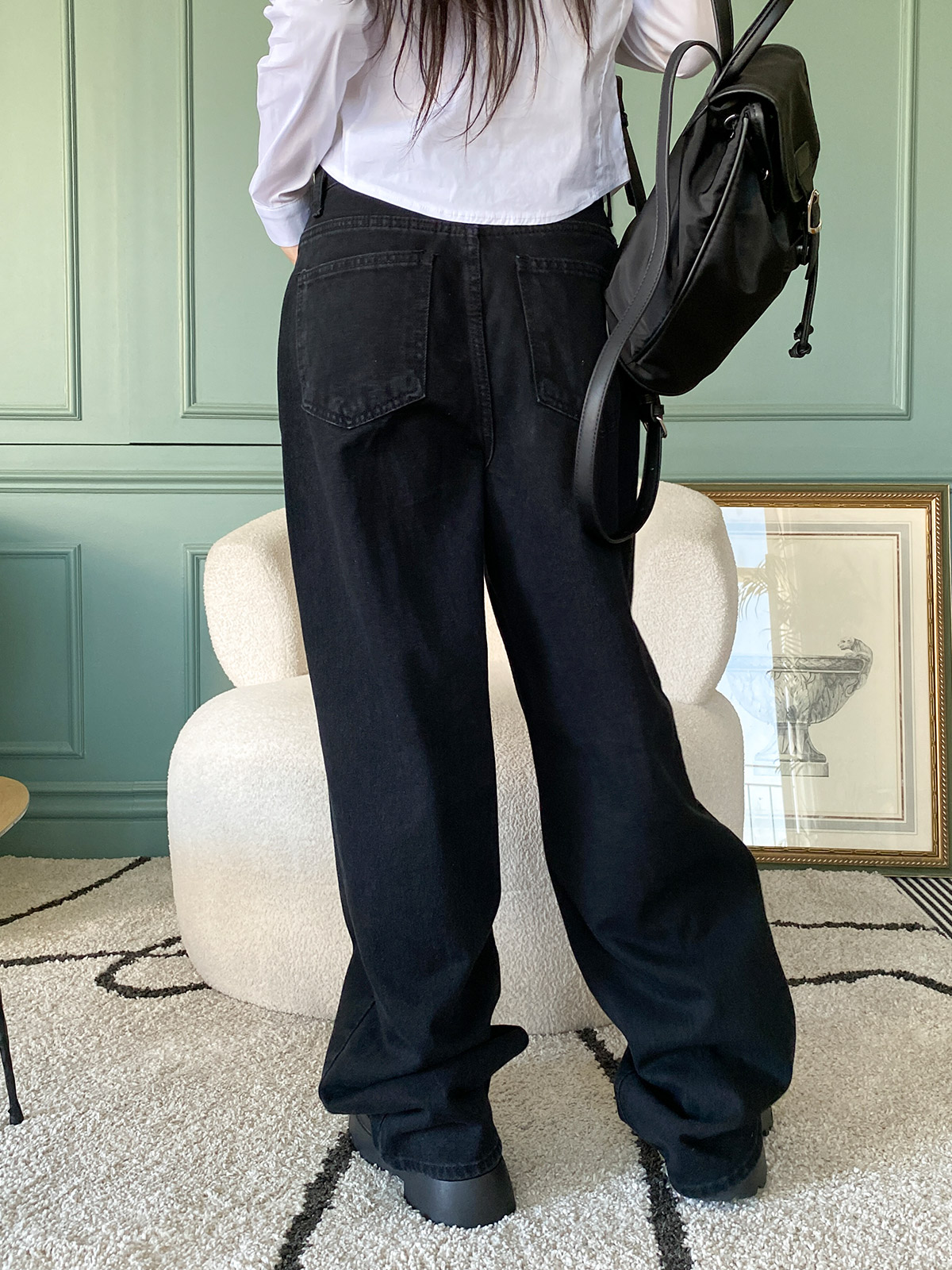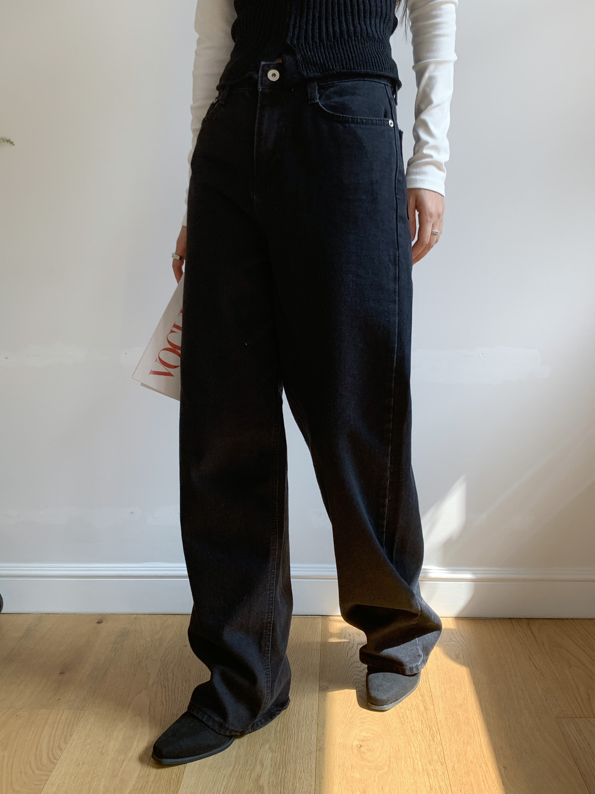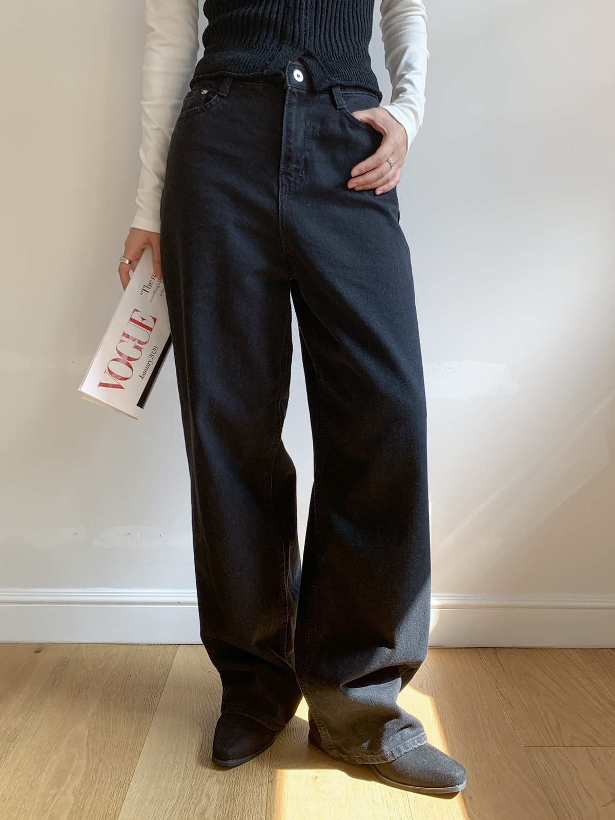 블랙의 일자핏으로 된 데님팬츠로 가장 손이 많이가고 다양한 코디가 가능하여