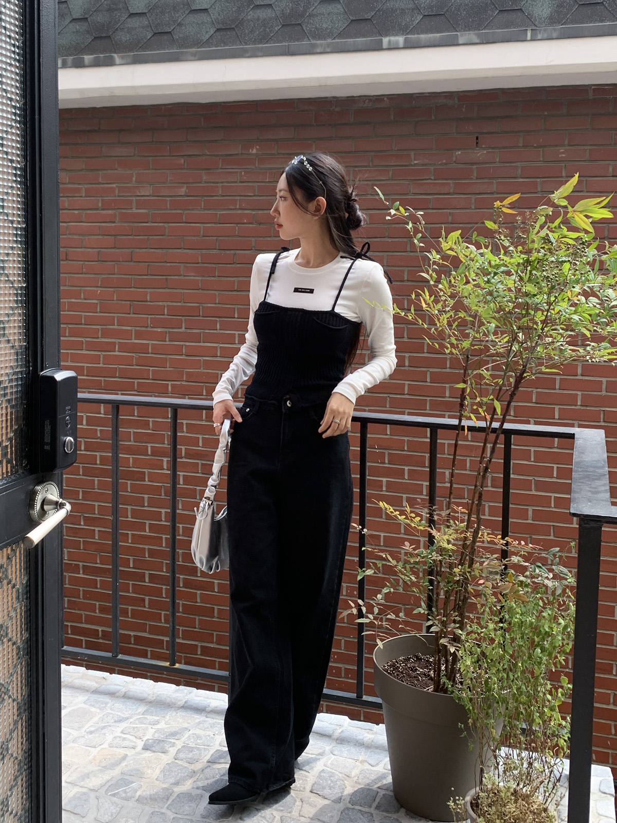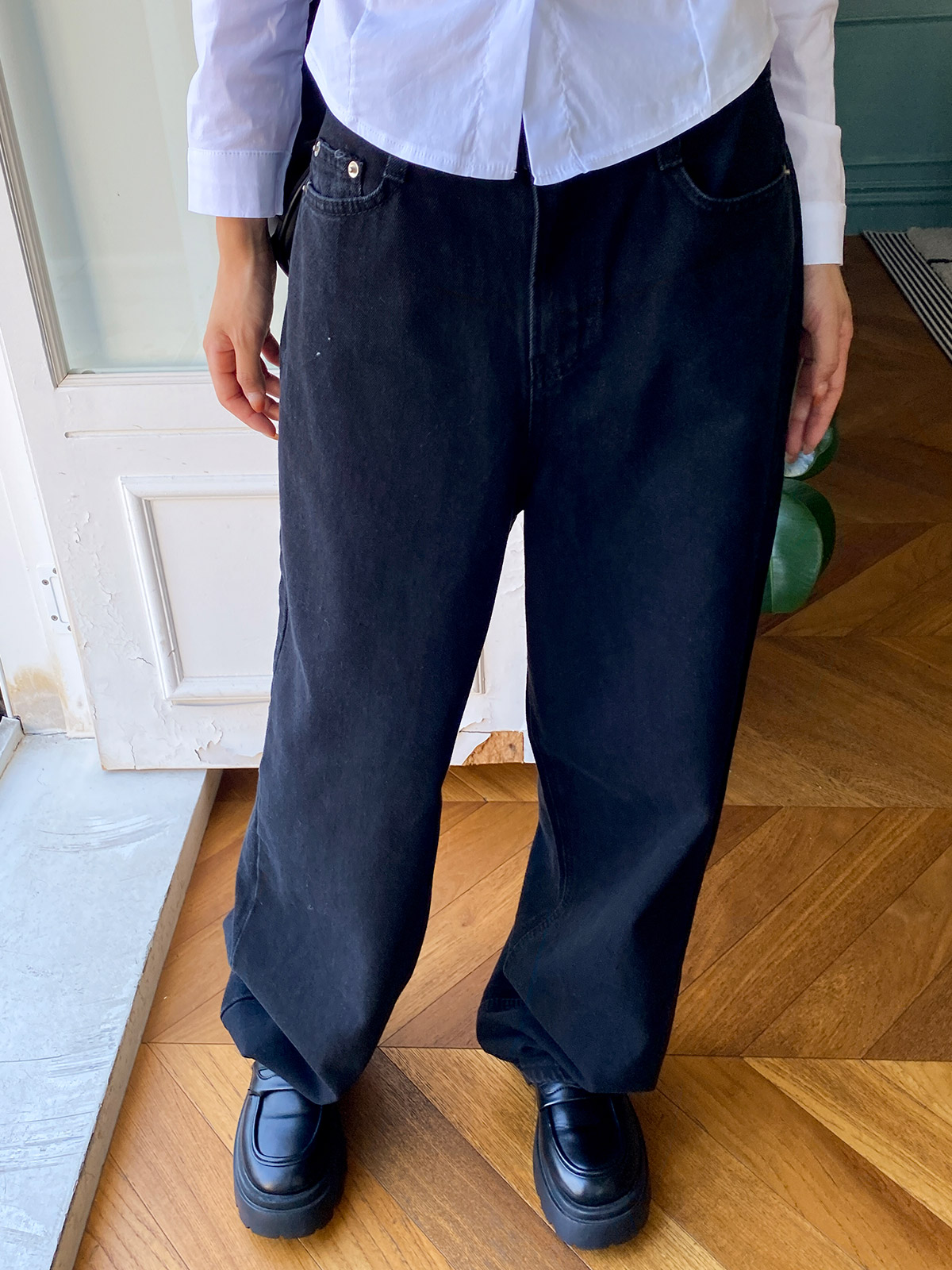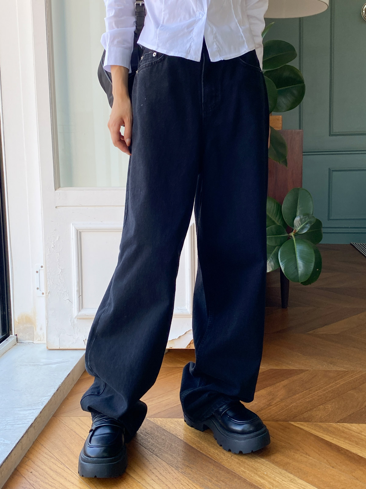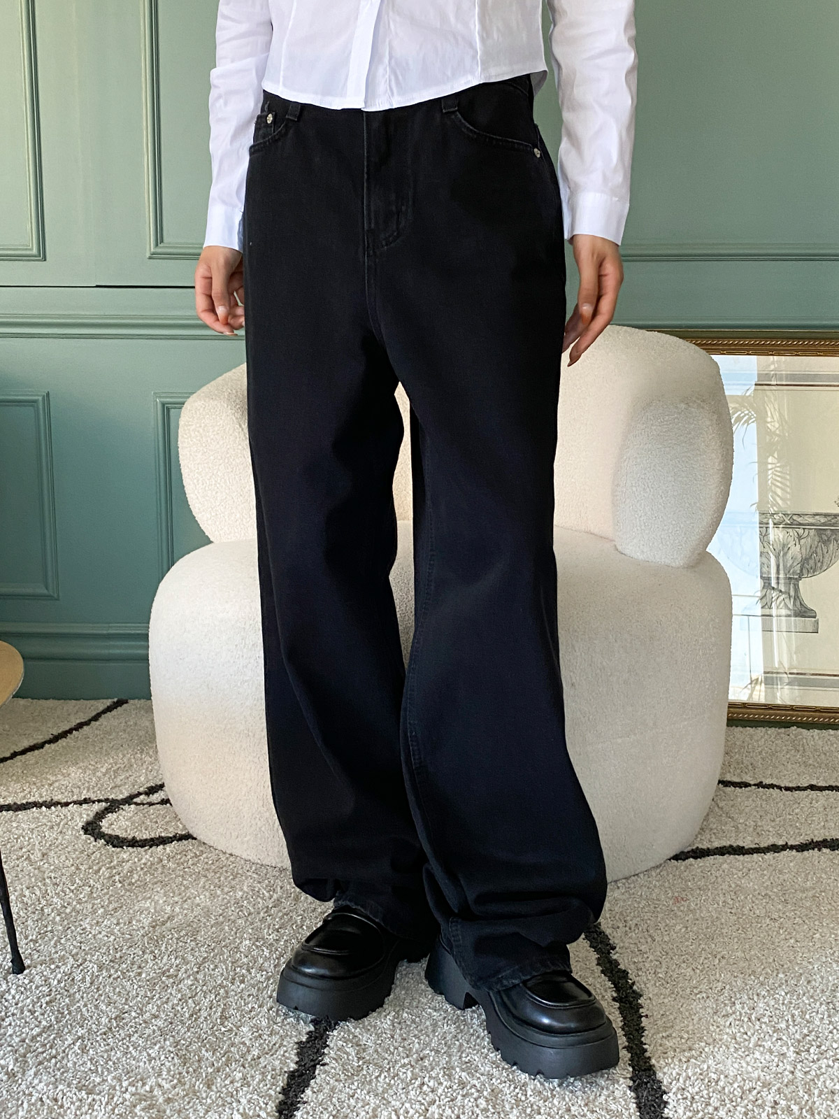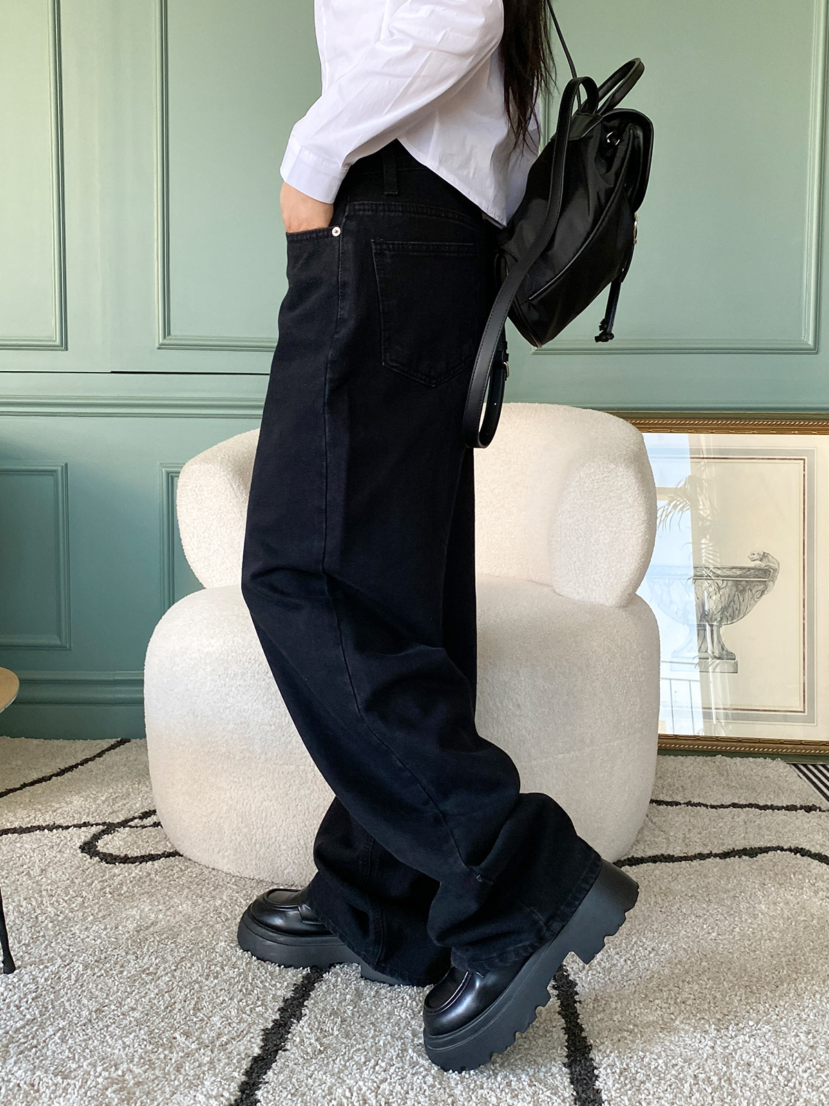블랙의 일자핏으로 된 데님팬츠로 가장 손이 많이가고 다양한 코디가 가능하여