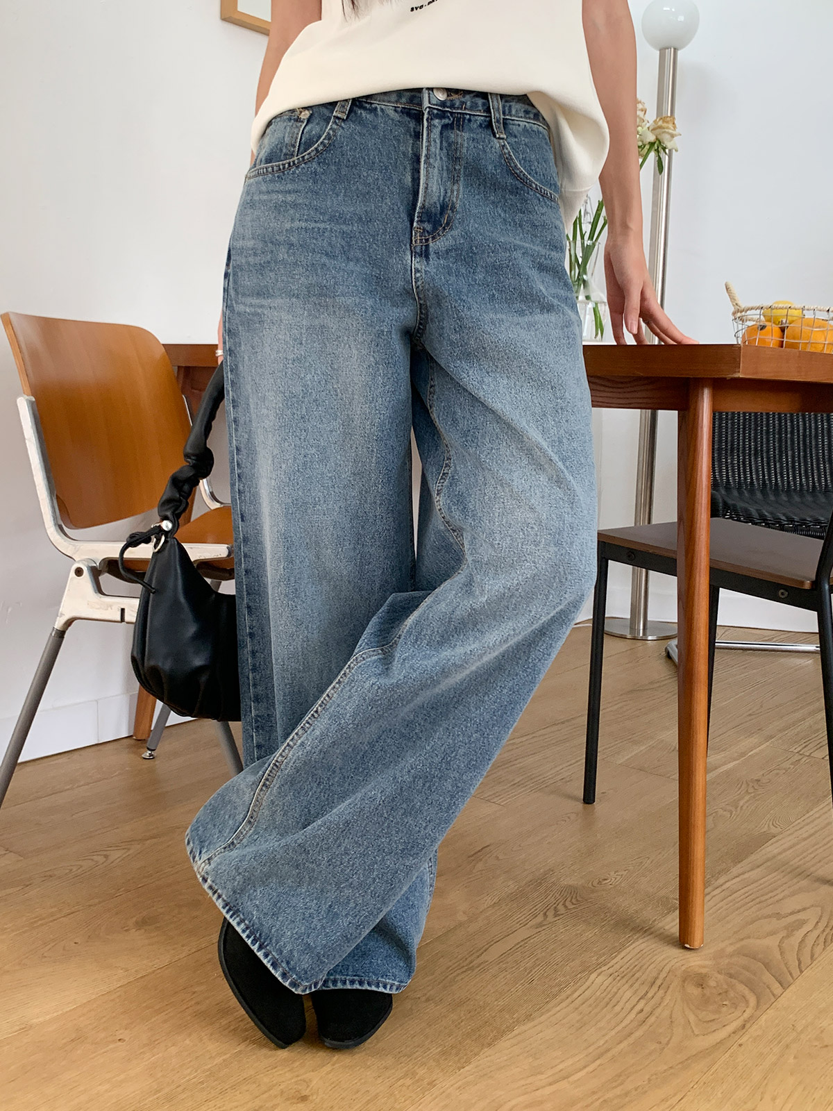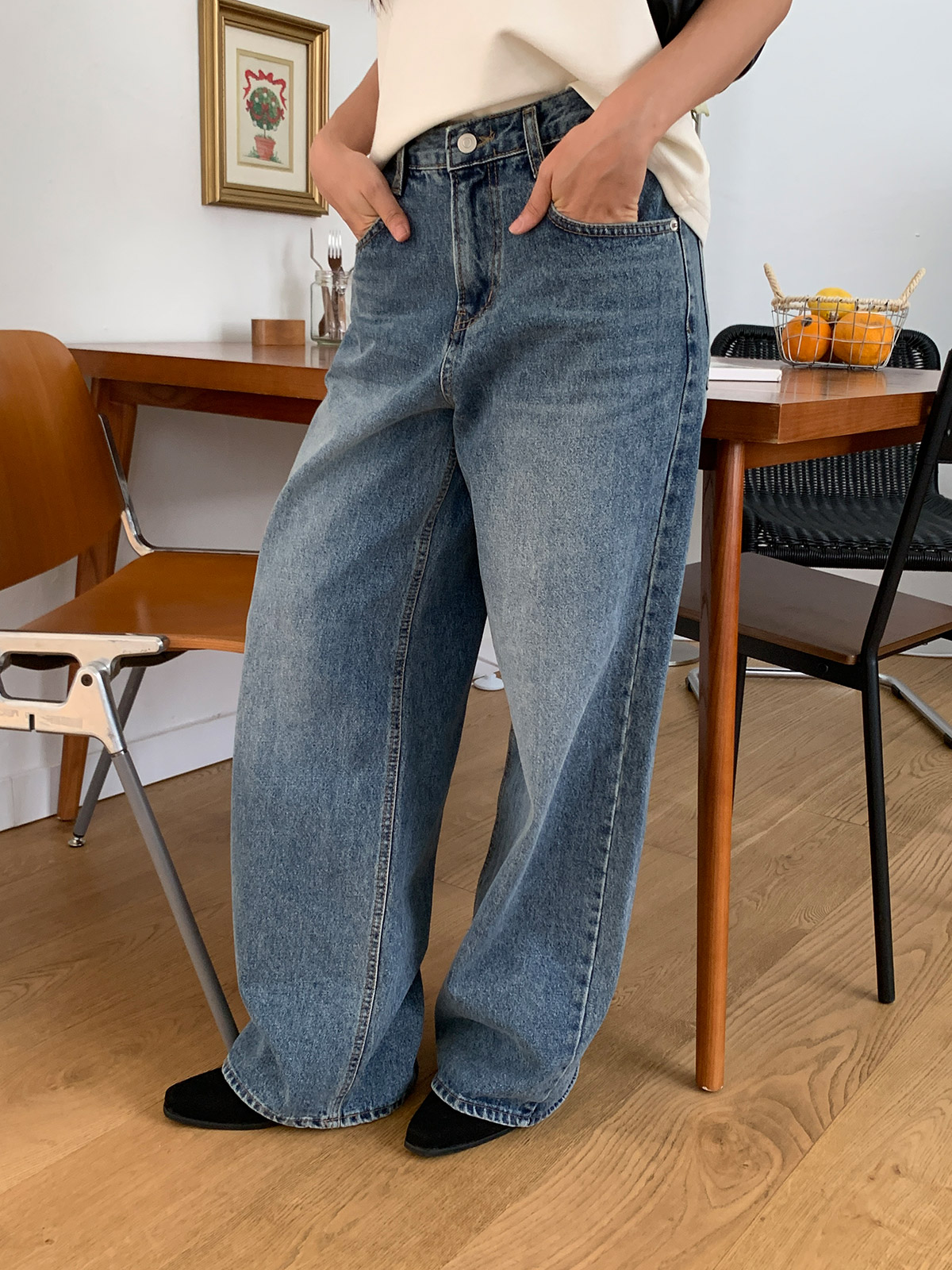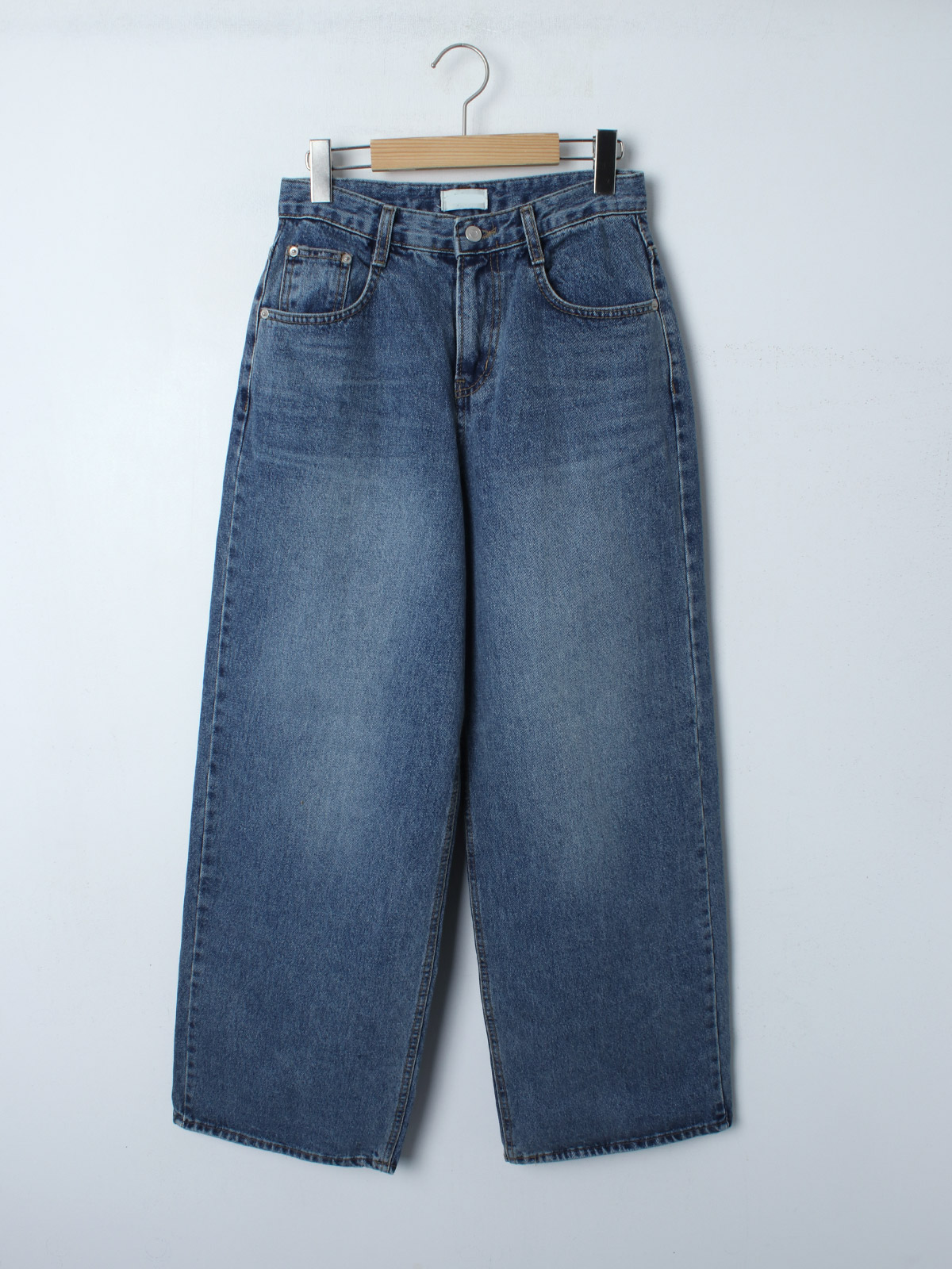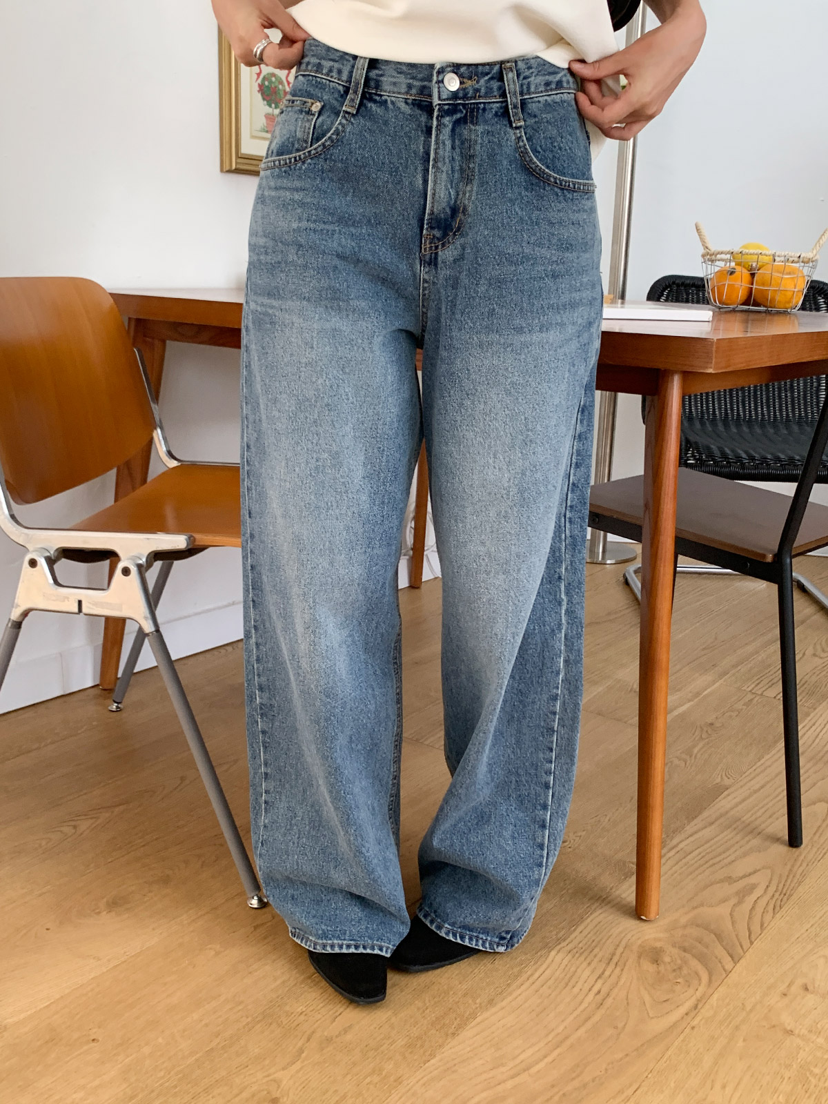 바지 중간부분 워싱이 들어가있어 밋밋하지 않고 와이드,하게 떨어지는 핏으로