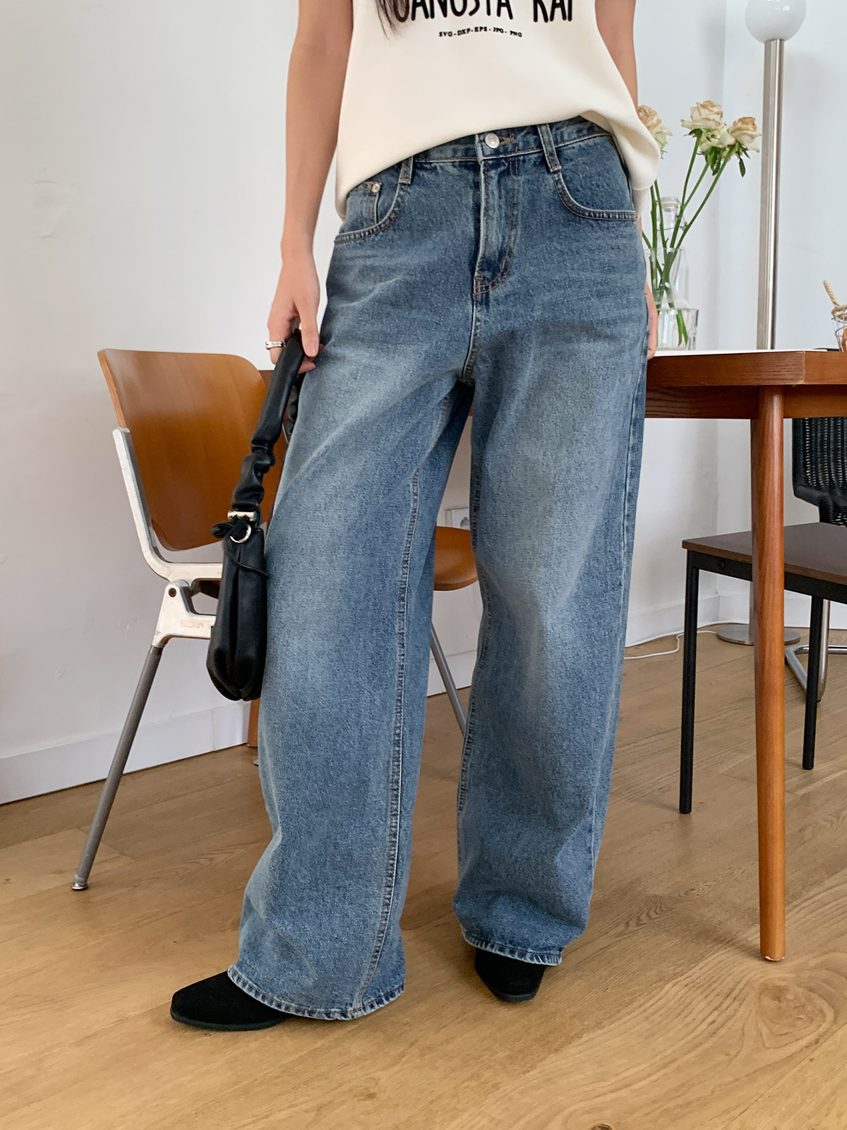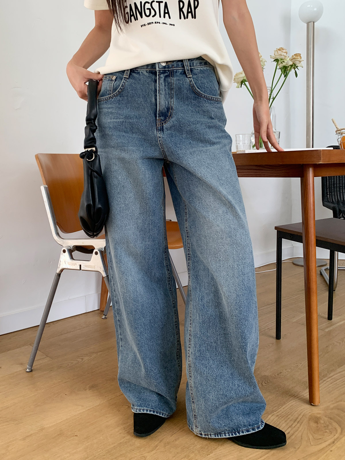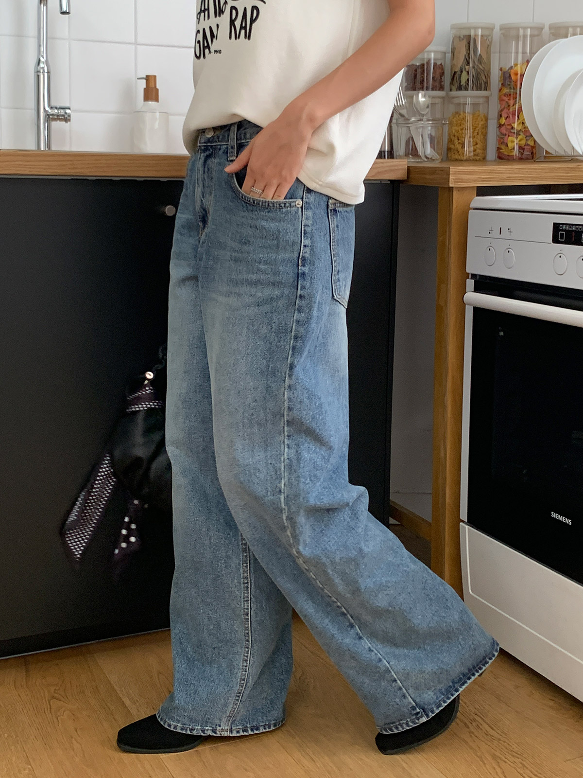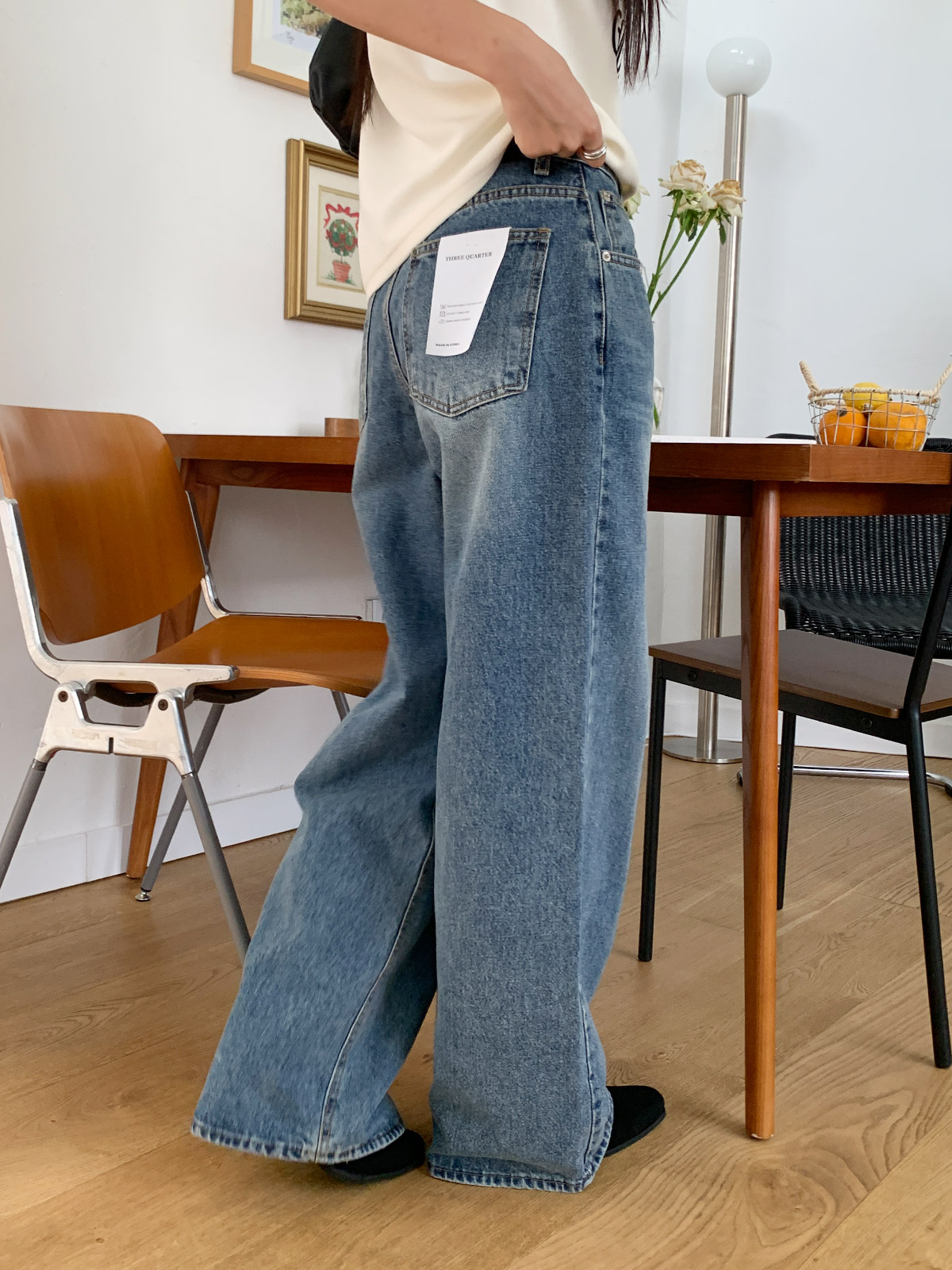 바지 중간부분 워싱이 들어가있어 밋밋하지 않고 와이드,하게 떨어지는 핏으로