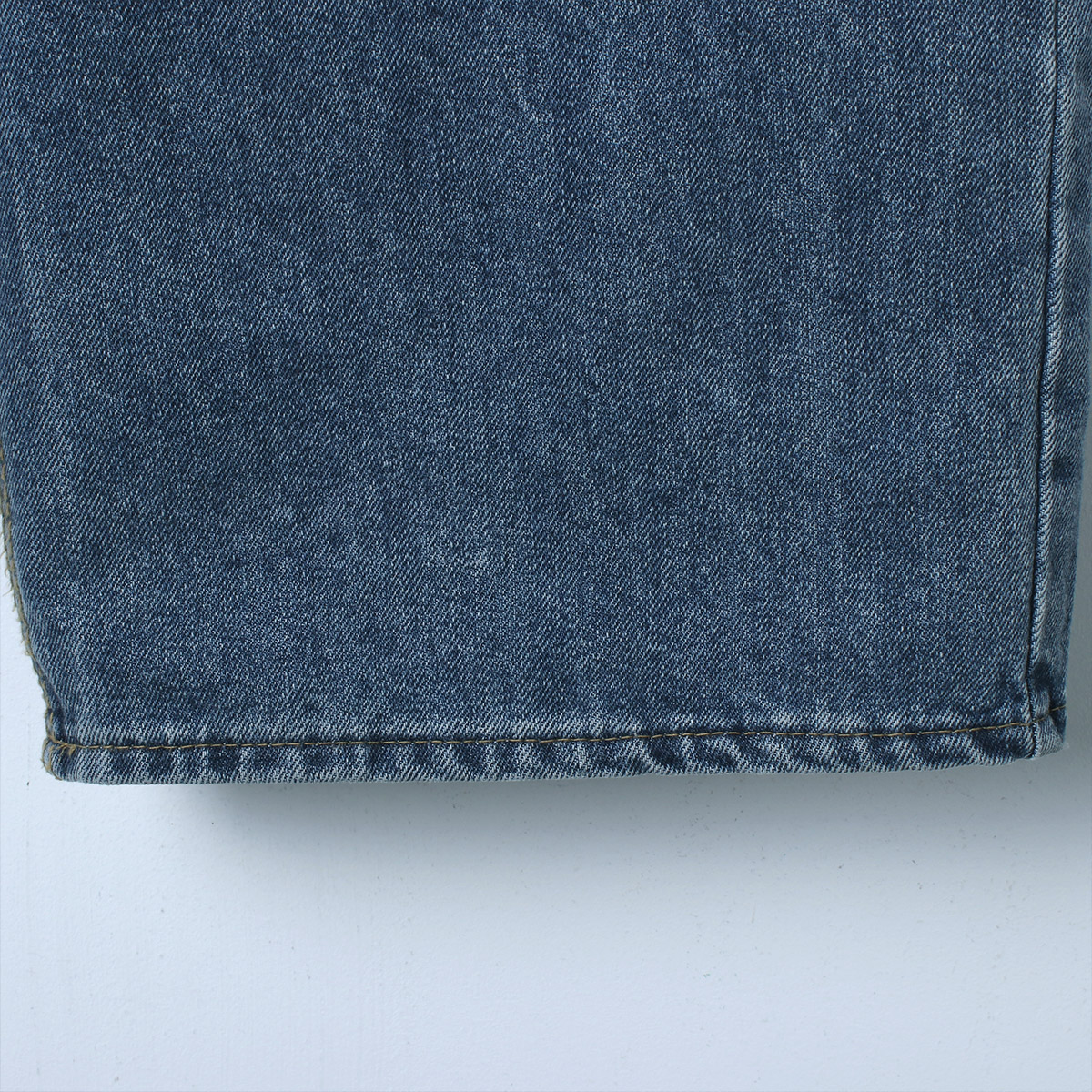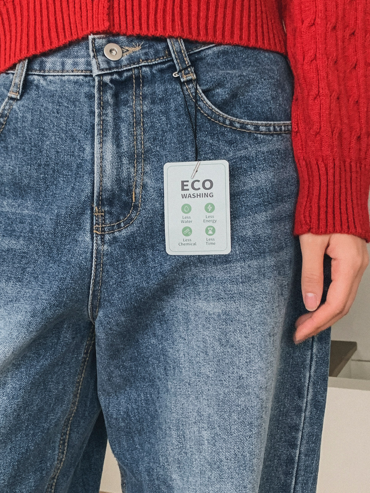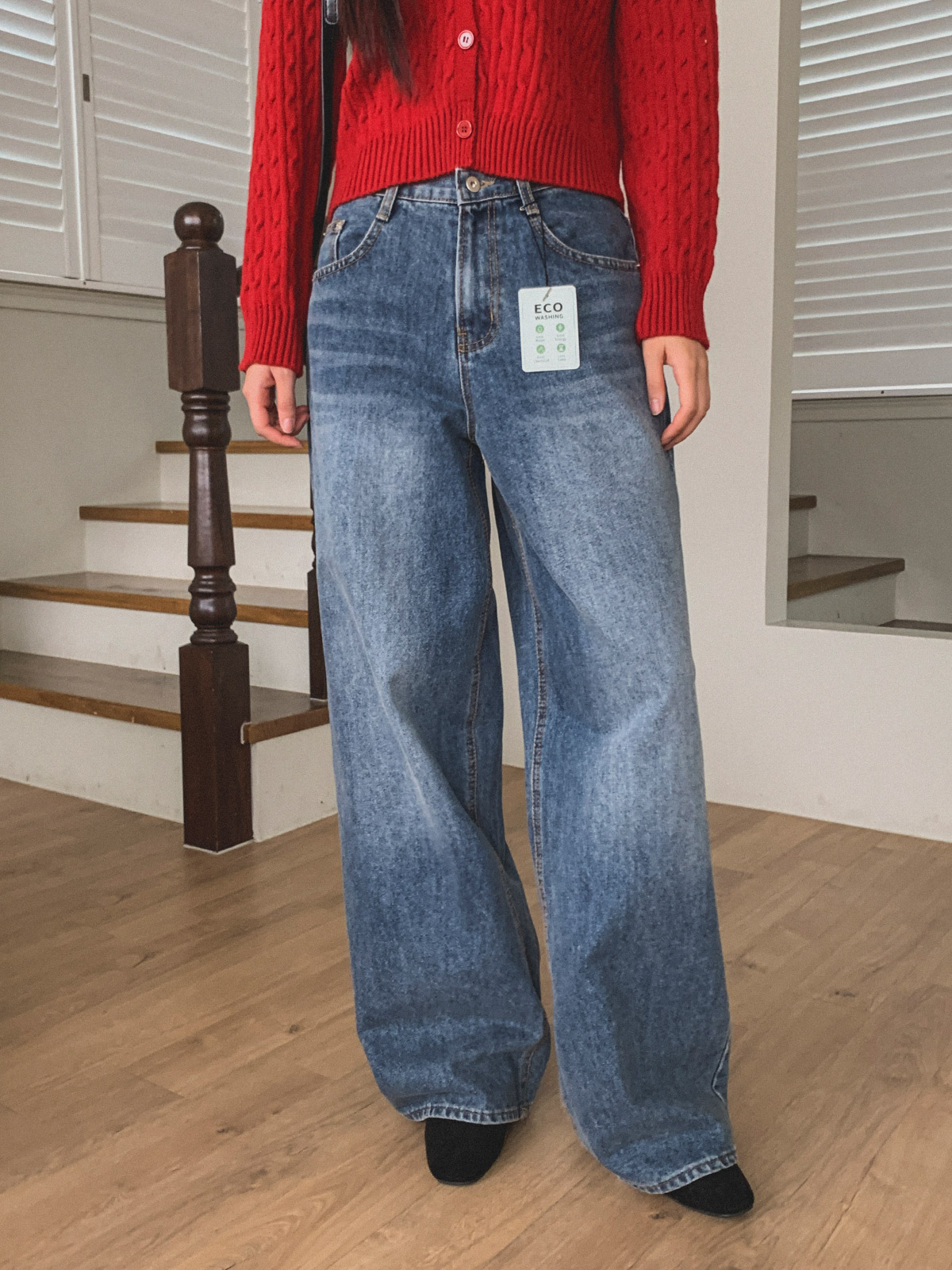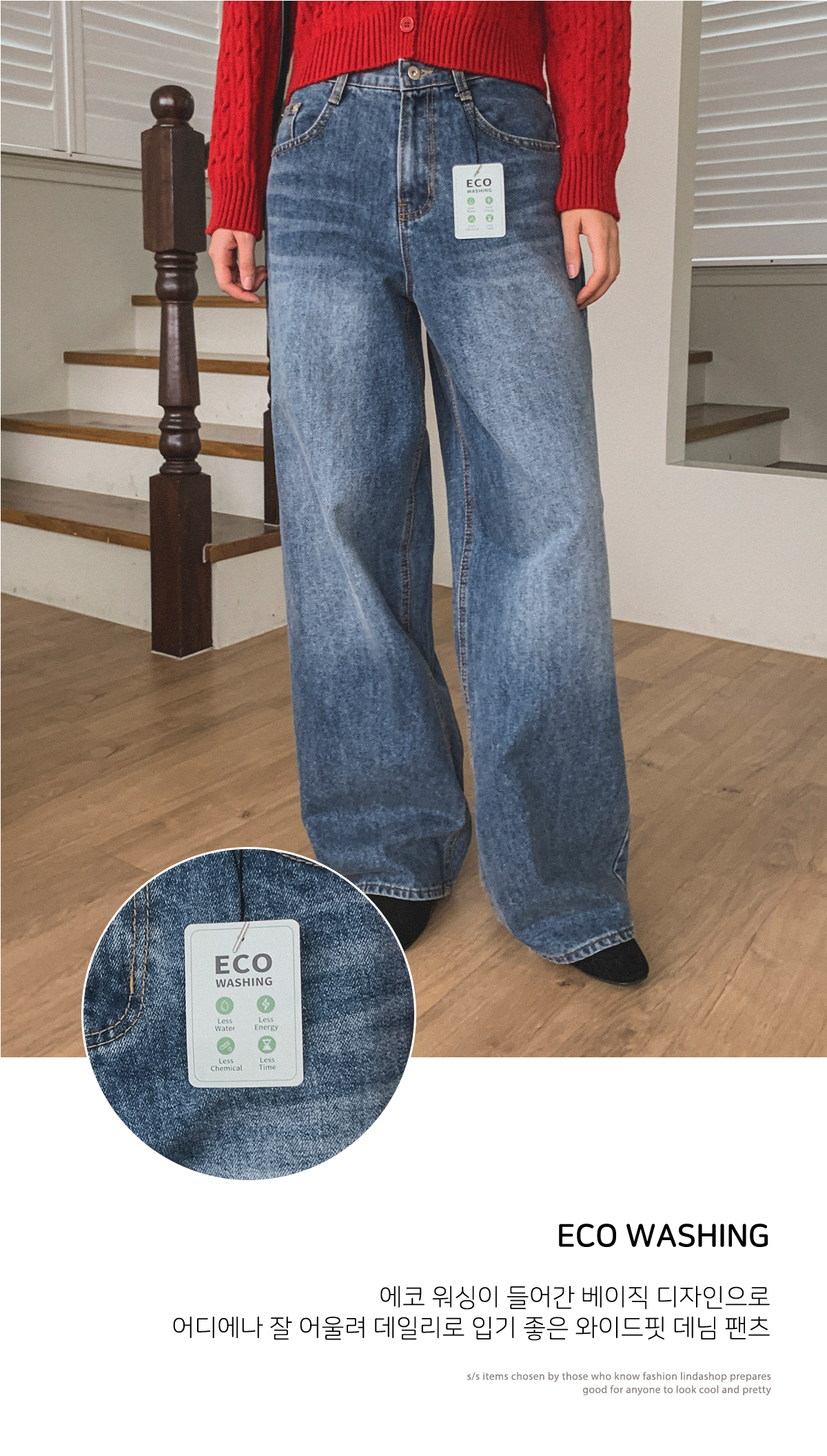 에코 워싱이 들어간 디자인으로 다양한 상의와 함께 매치하기에 좋으며 와이드핏 데님으로
