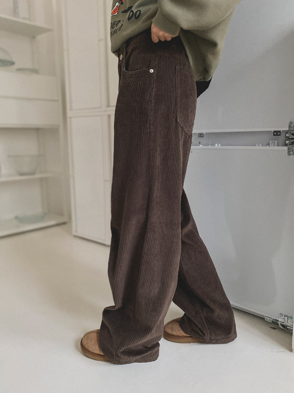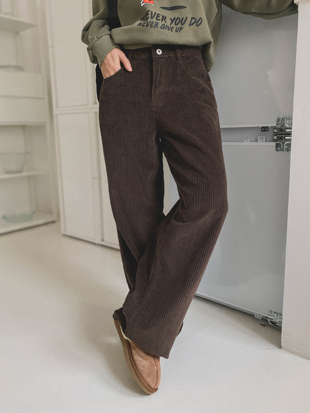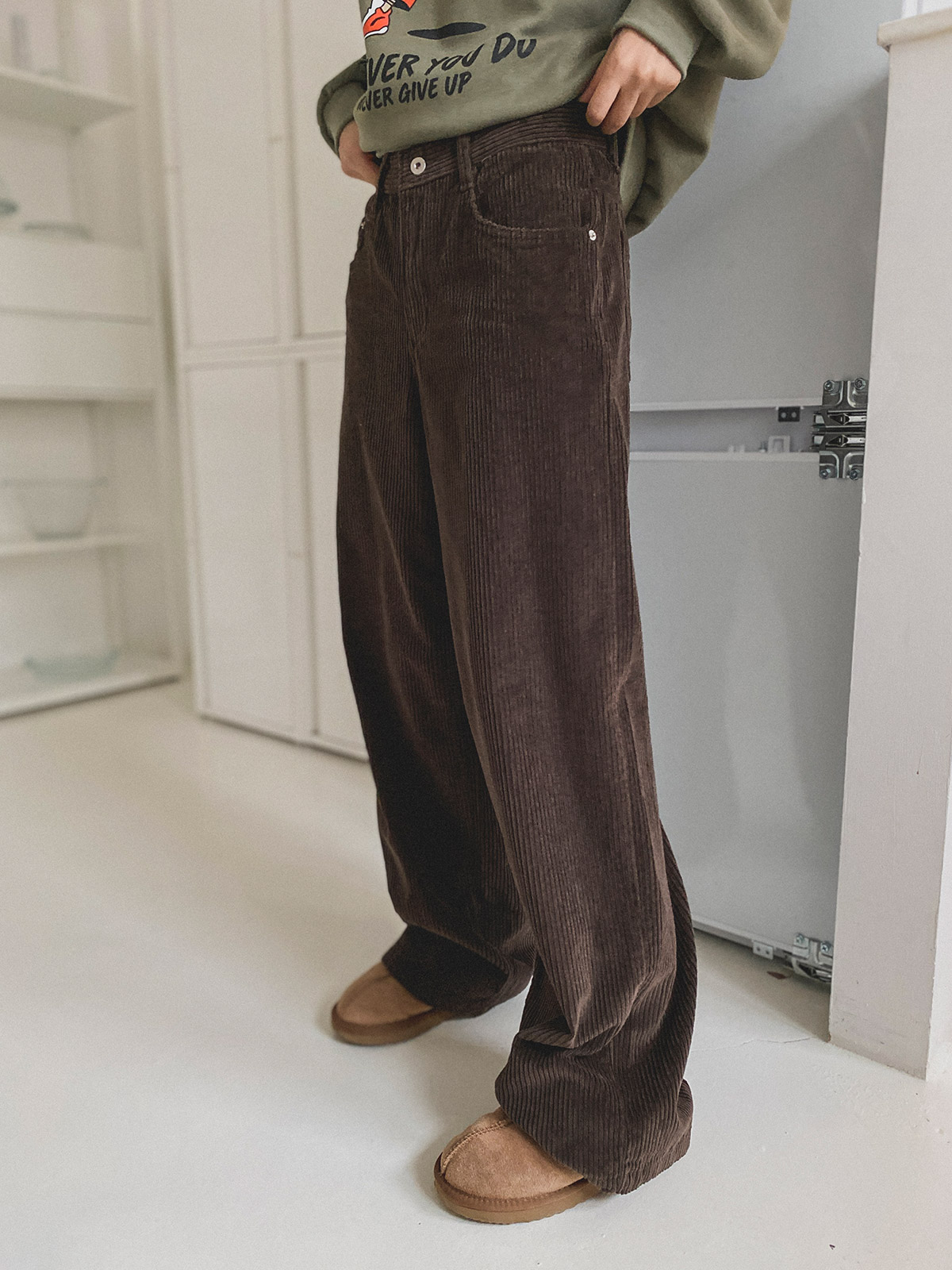 스트레이트한 핏의 코듀로이 일자 와이드 팬츠로