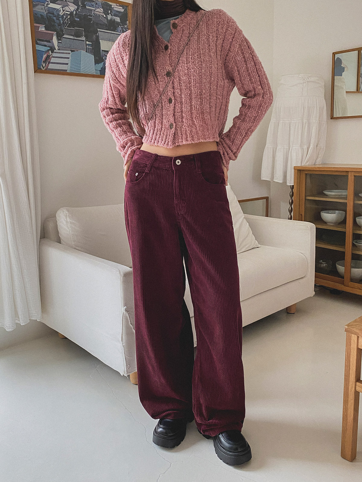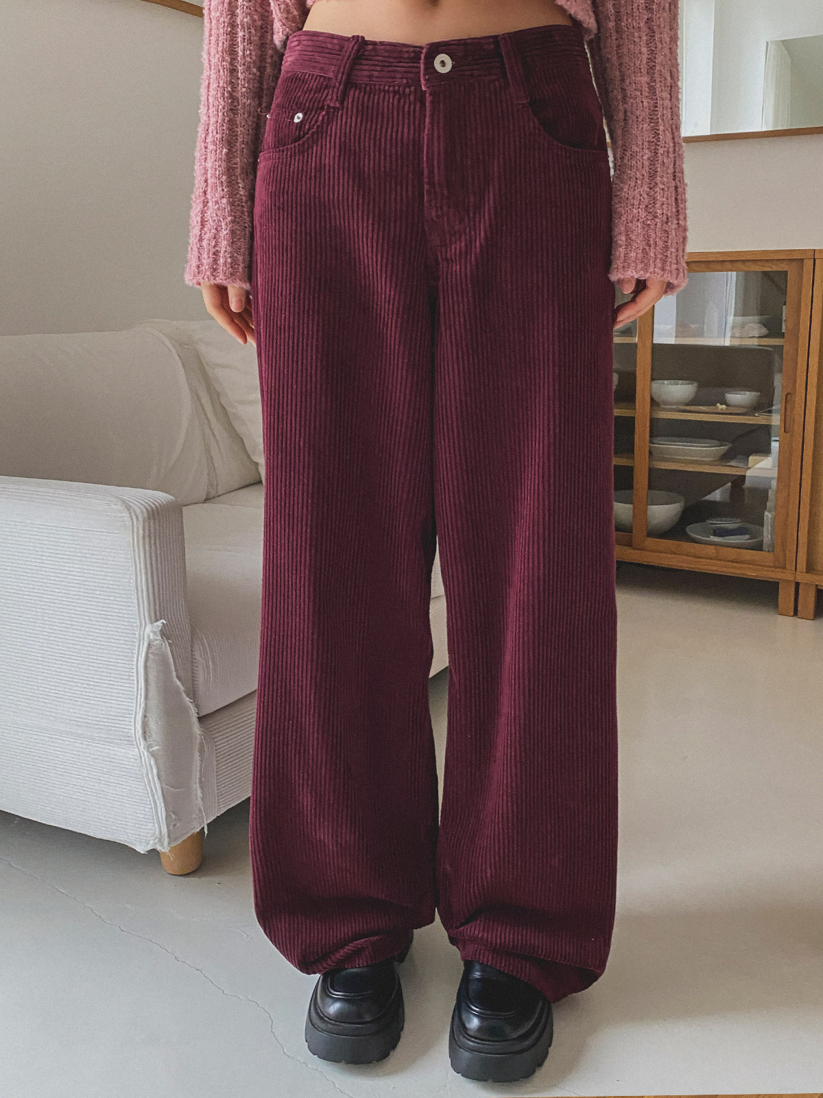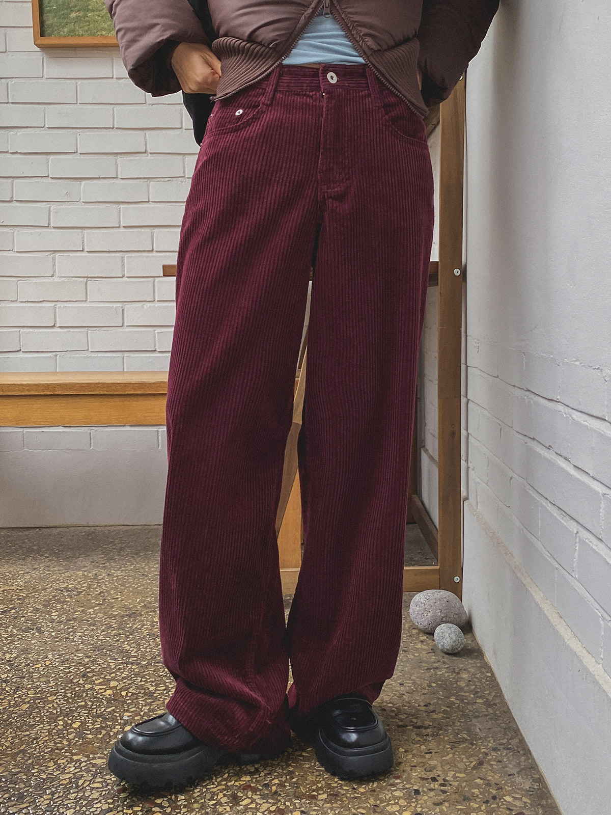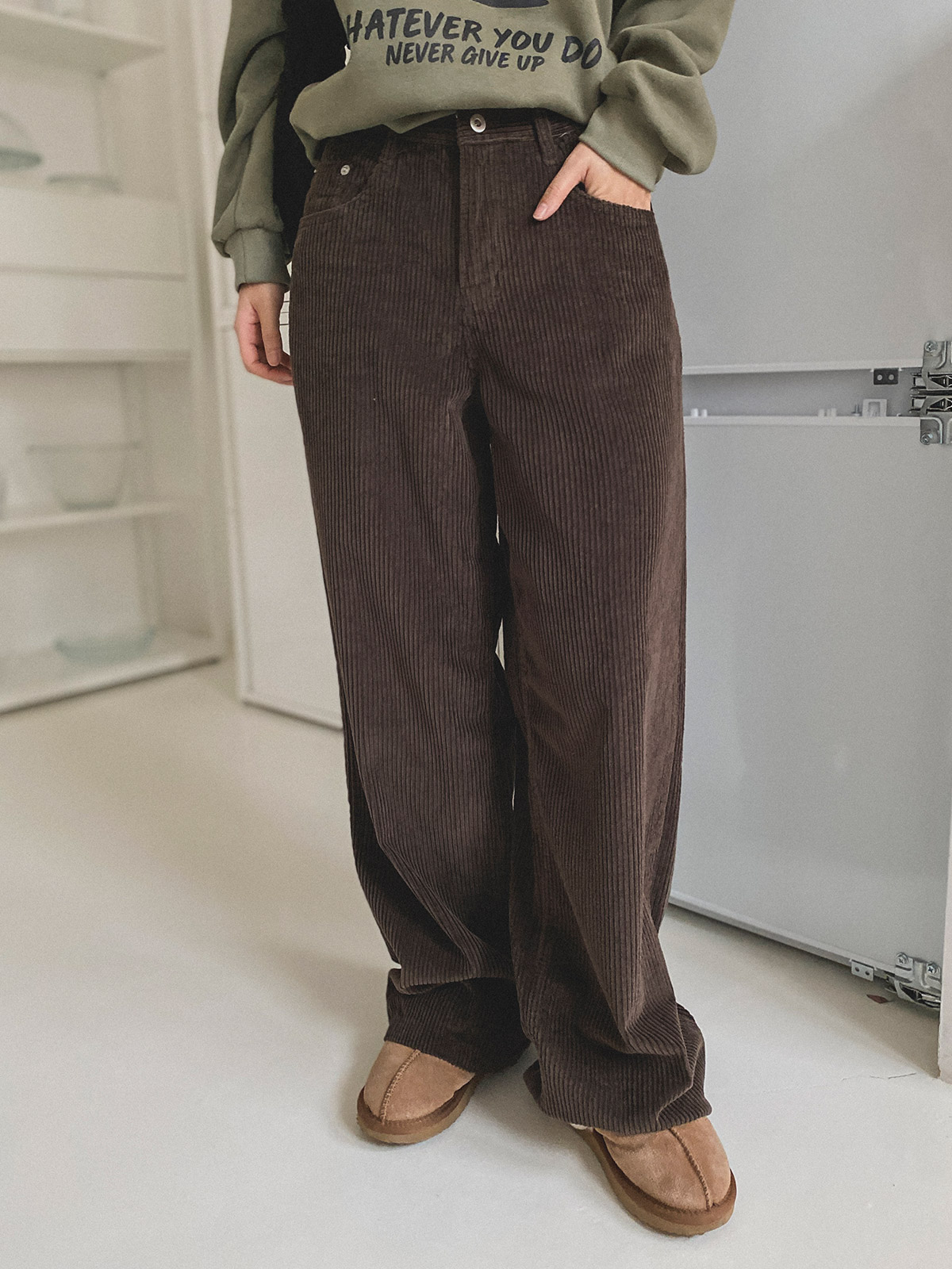 스트레이트한 핏의 코듀로이 일자 와이드 팬츠로