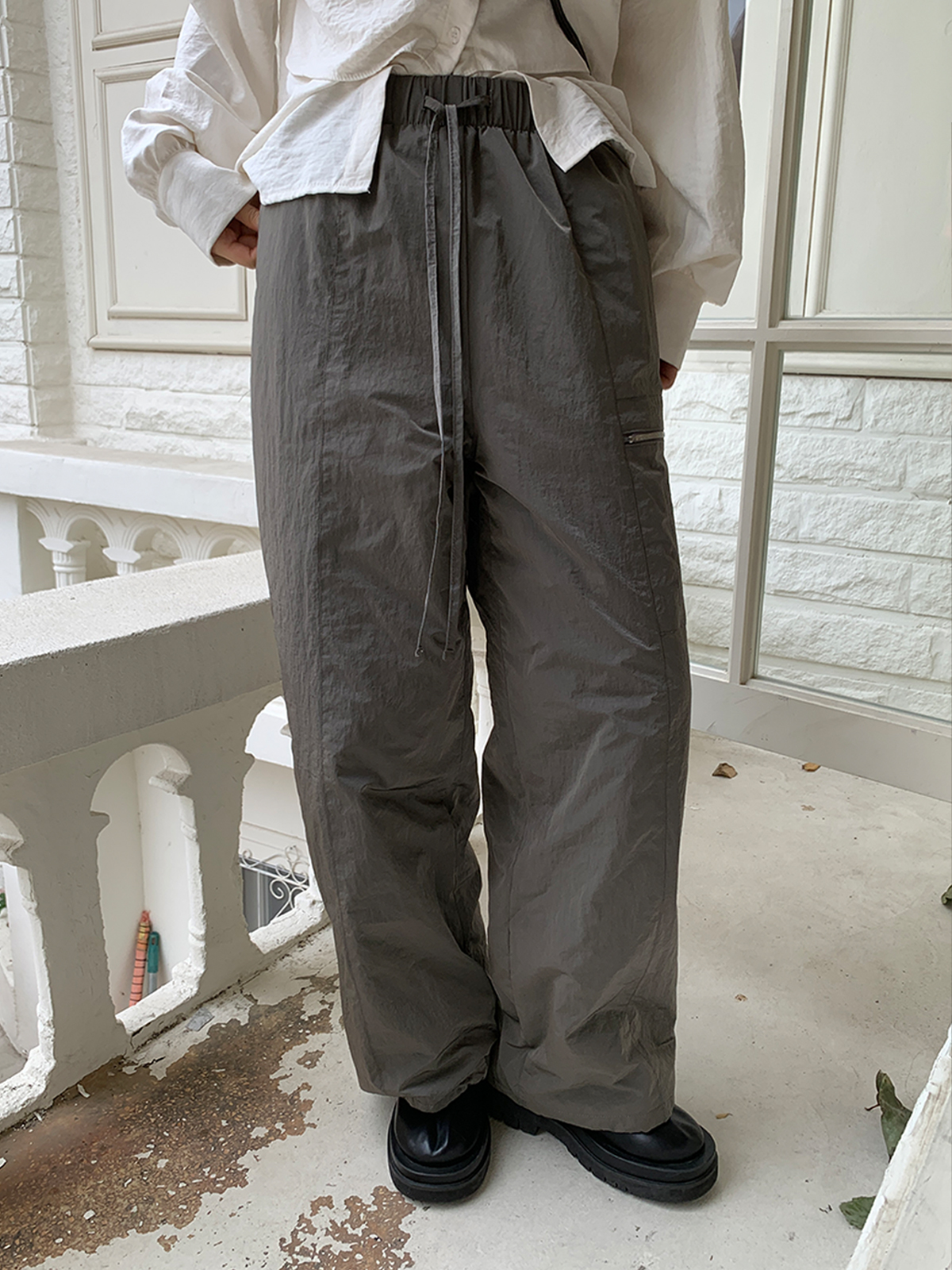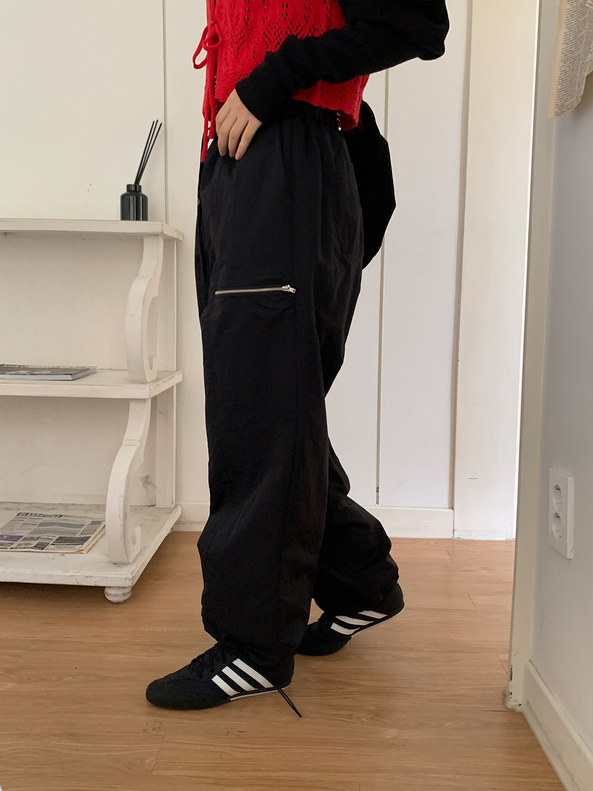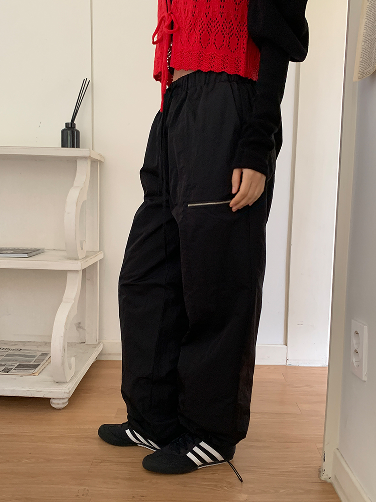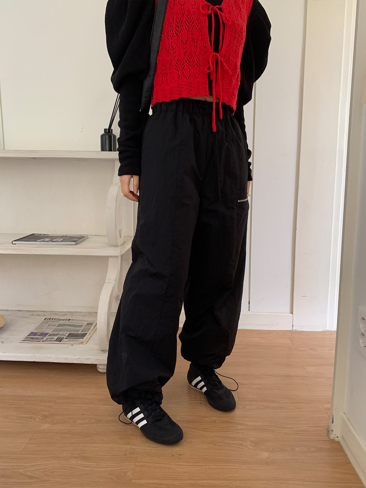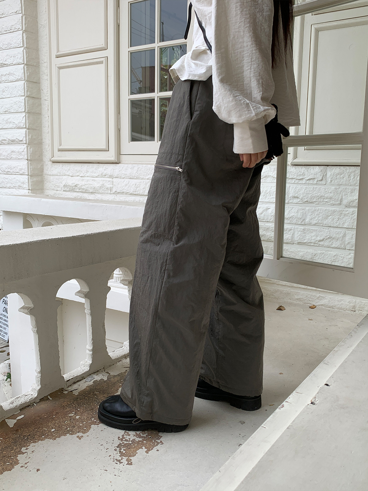 지퍼 디테일이 포인트가 되는 패딩 와이드 밴딩 팬츠