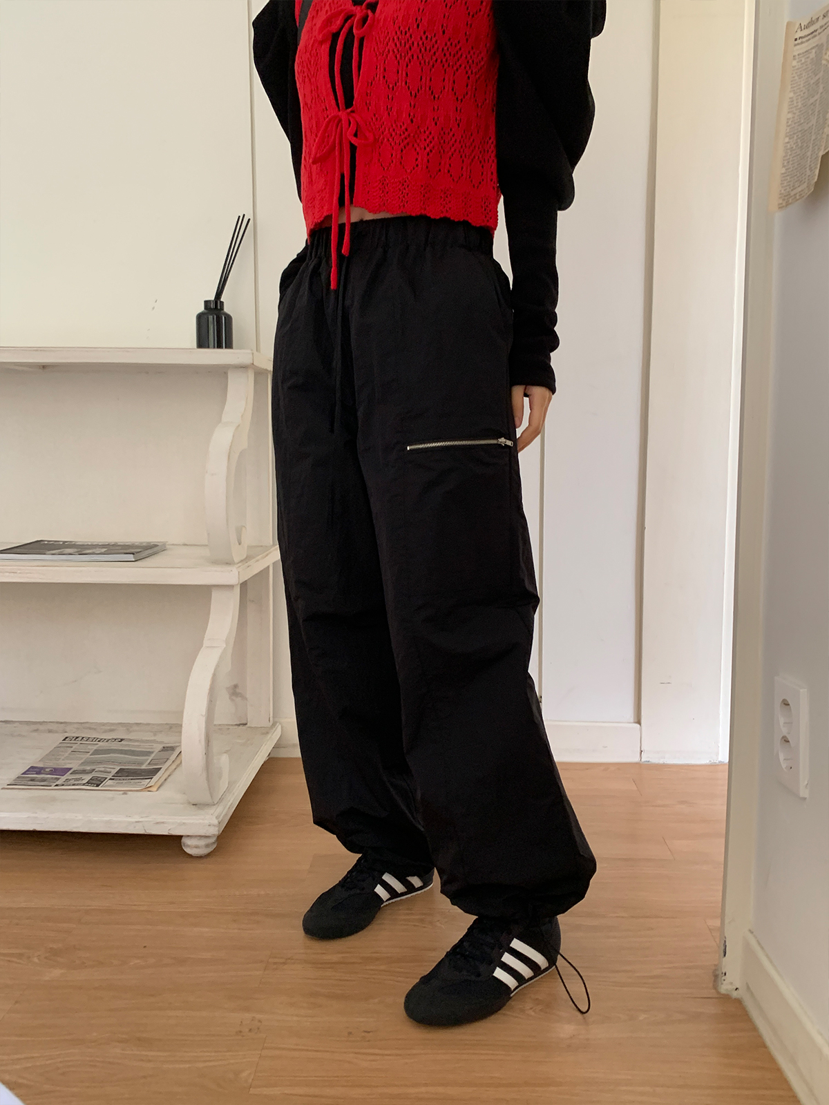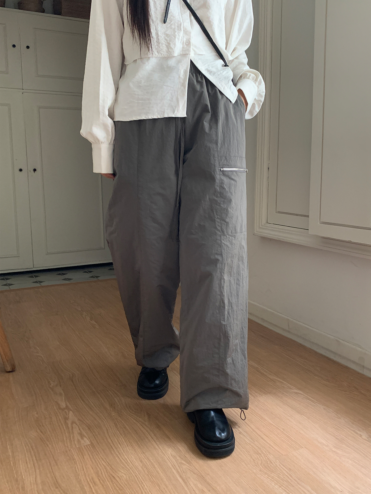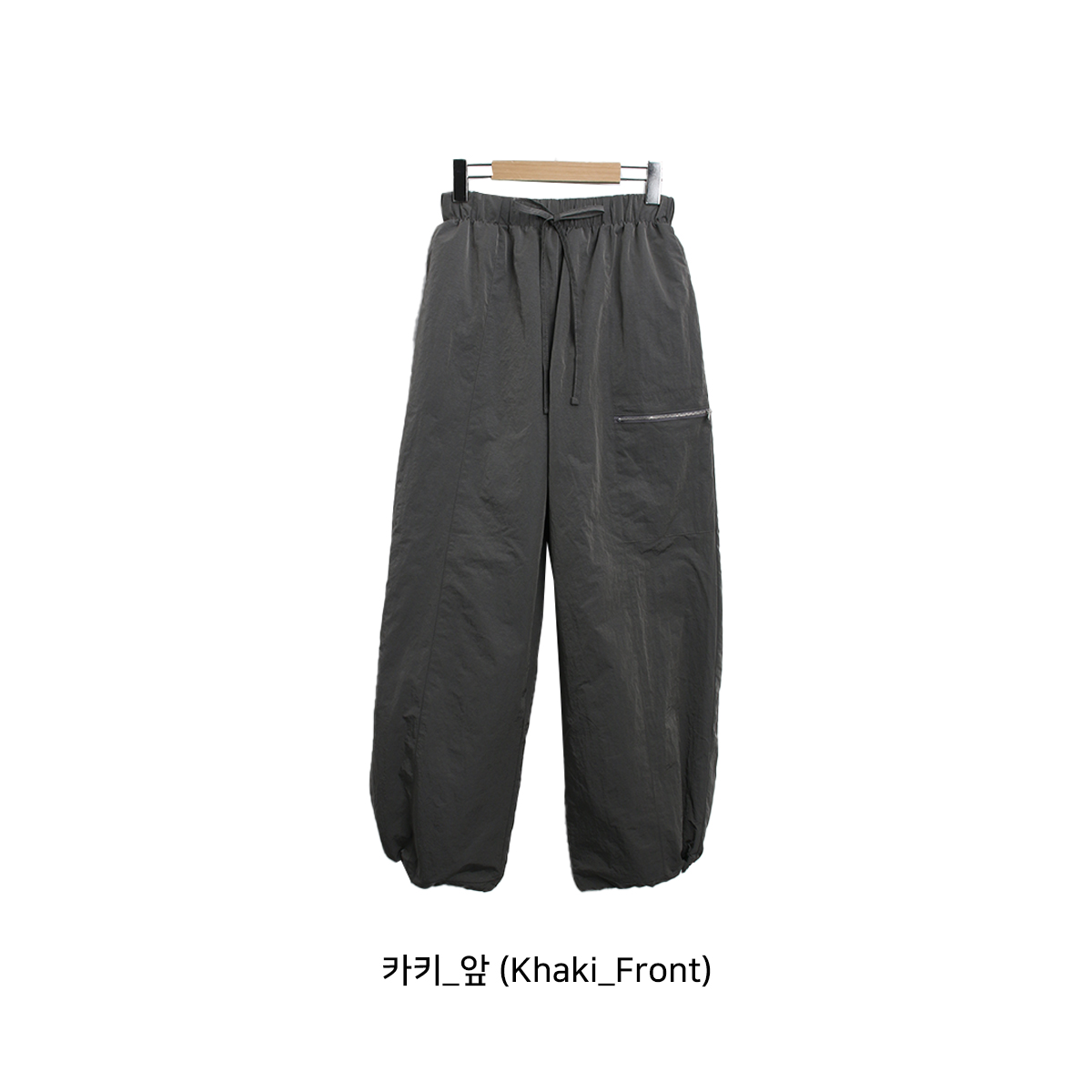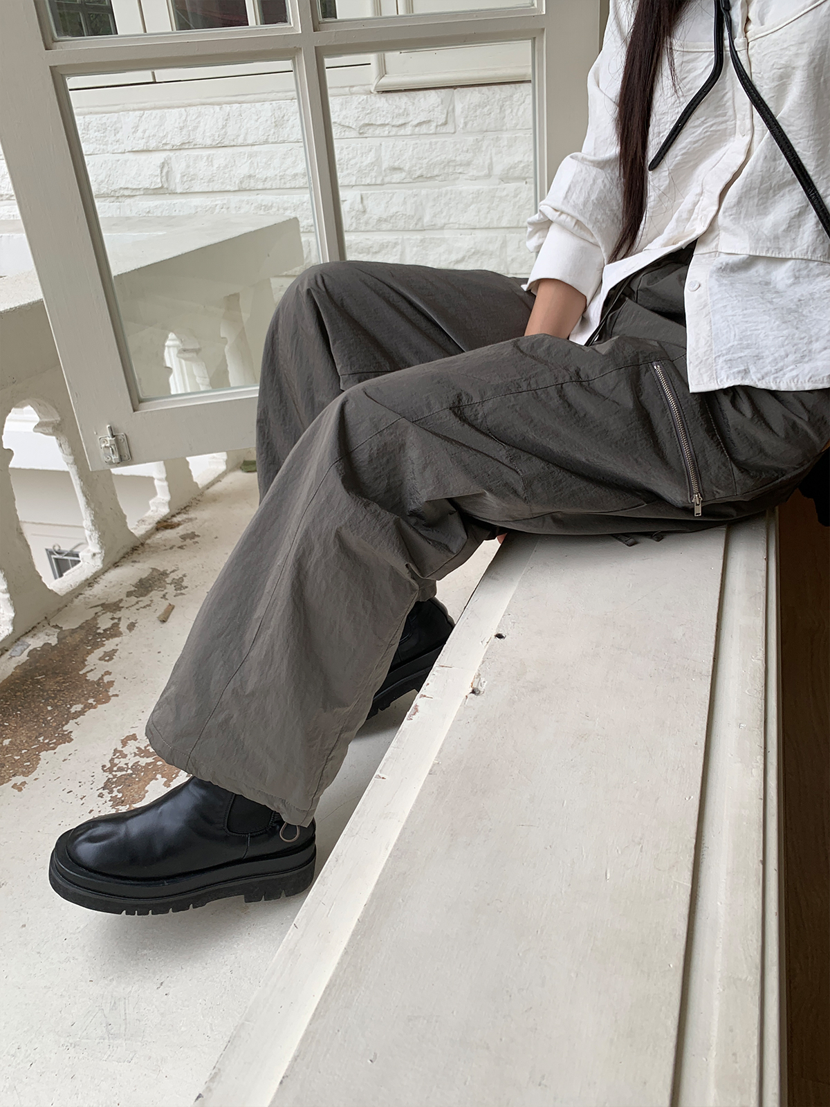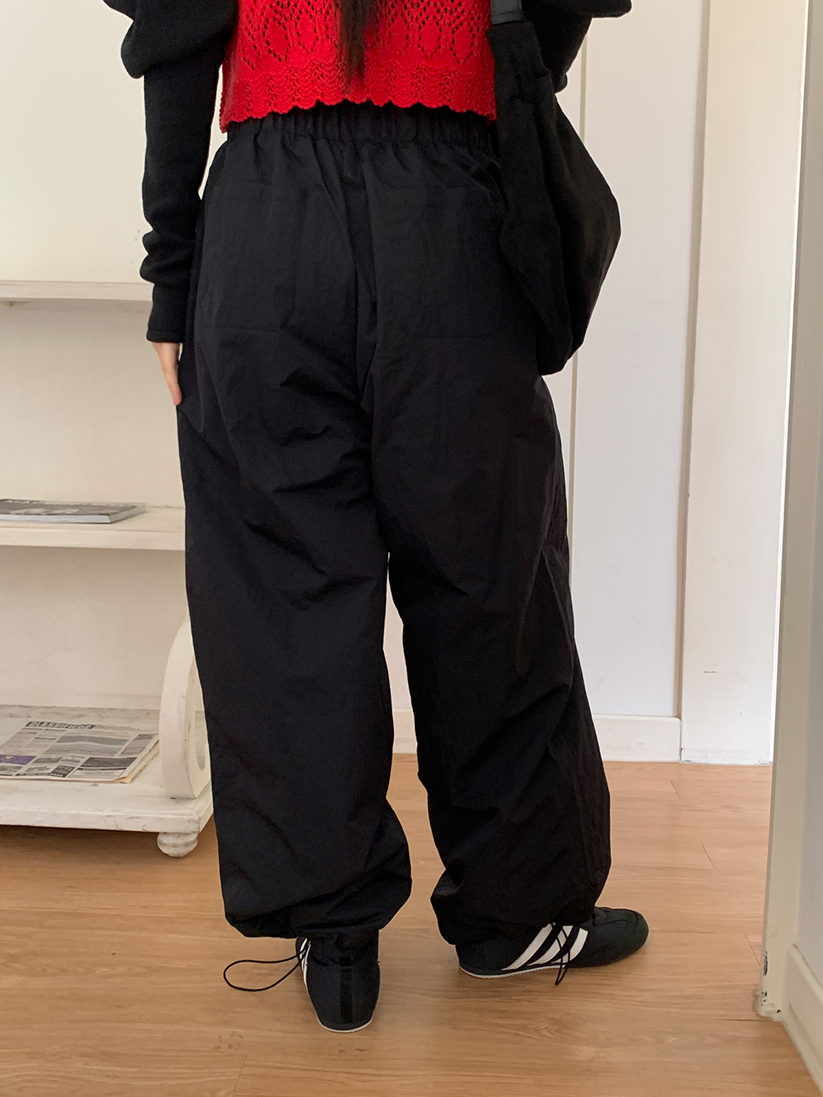 지퍼 디테일이 포인트가 되는 패딩 와이드 밴딩 팬츠