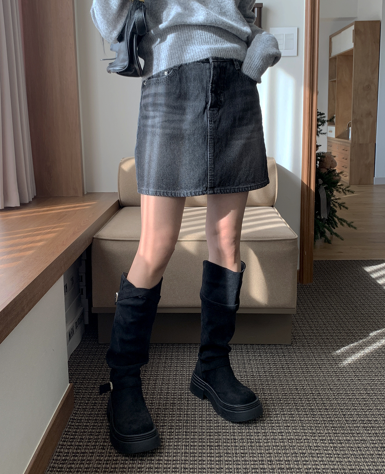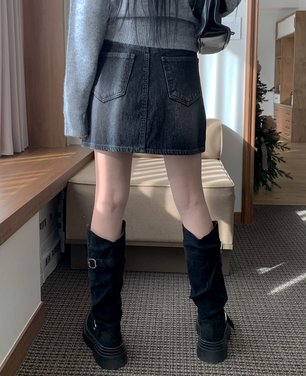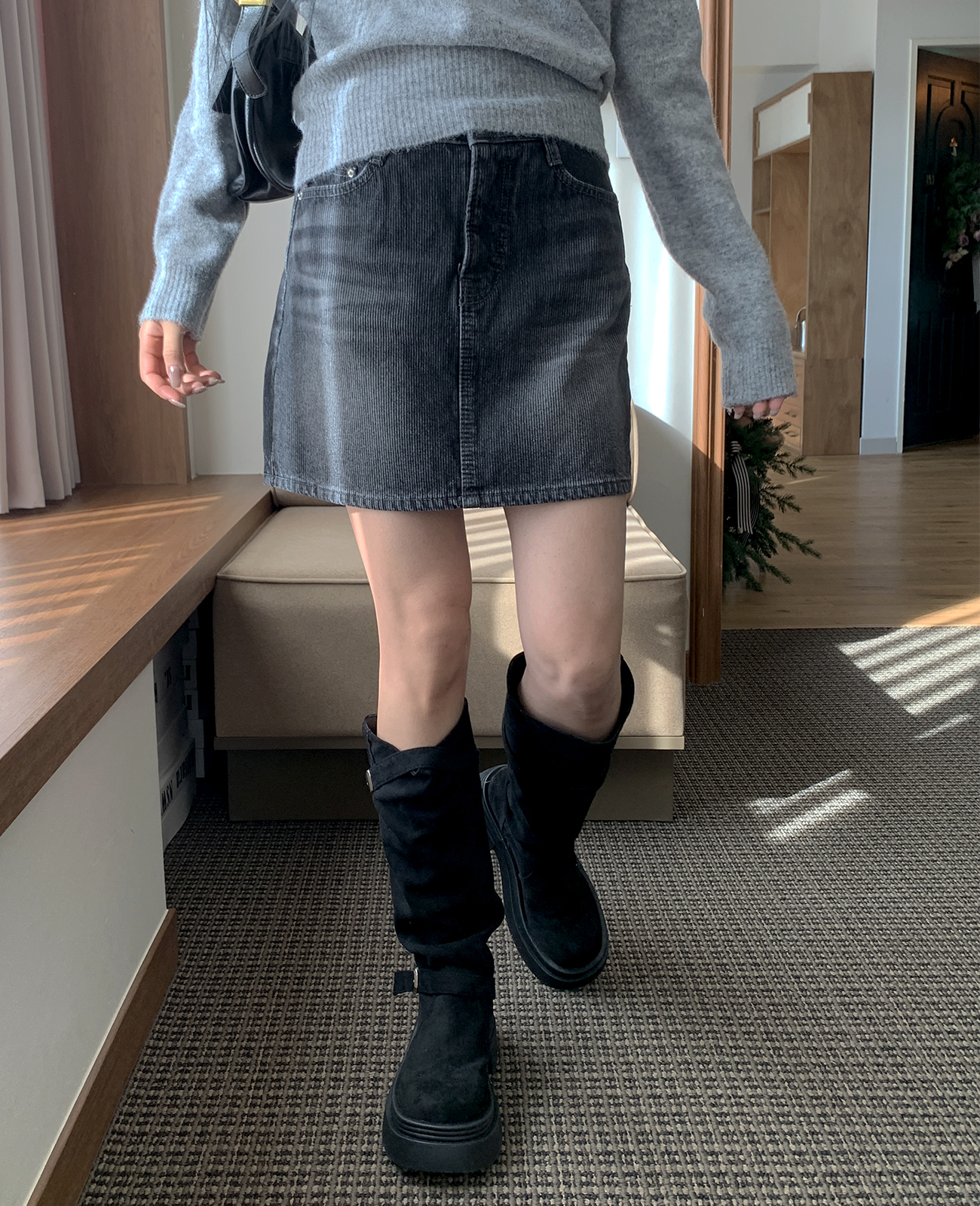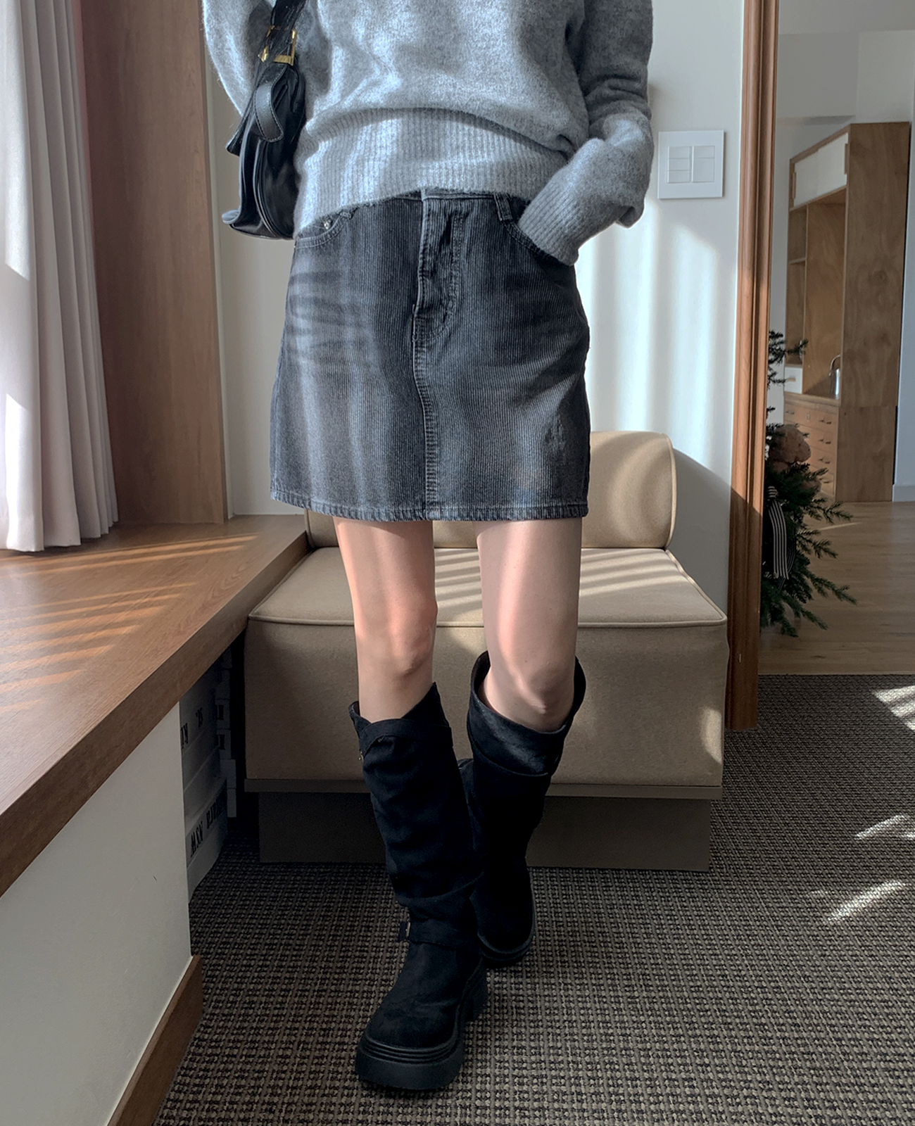 골덴 느낌의 데님 소재로 밋밋하지 않게 포인트가 되는 기모 미니 스커트