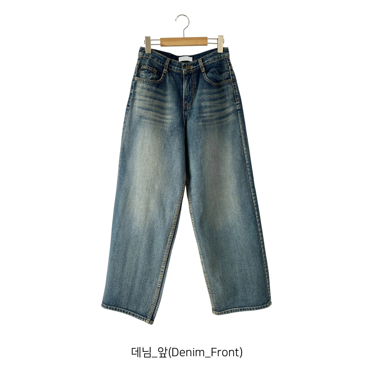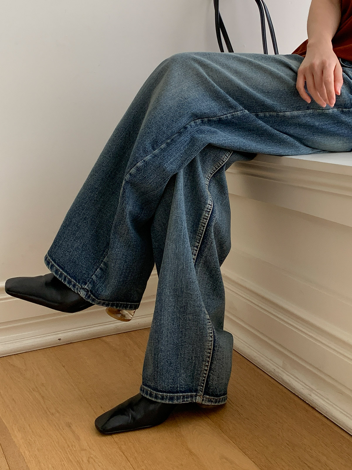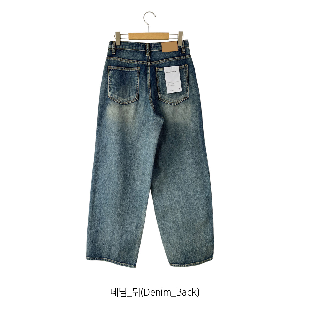 유니크한 커브드 라인으로 떨어지는 빈티지 워싱 와이드 데님 팬츠
