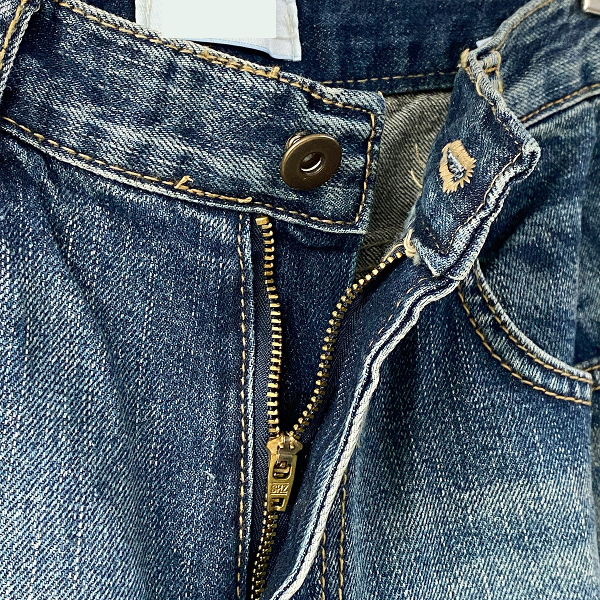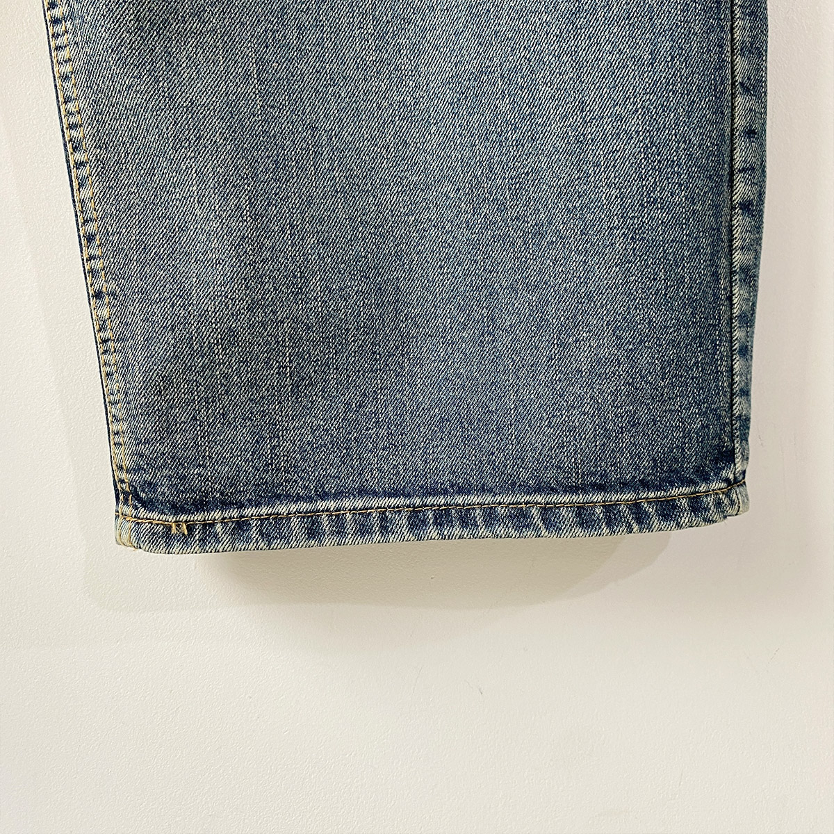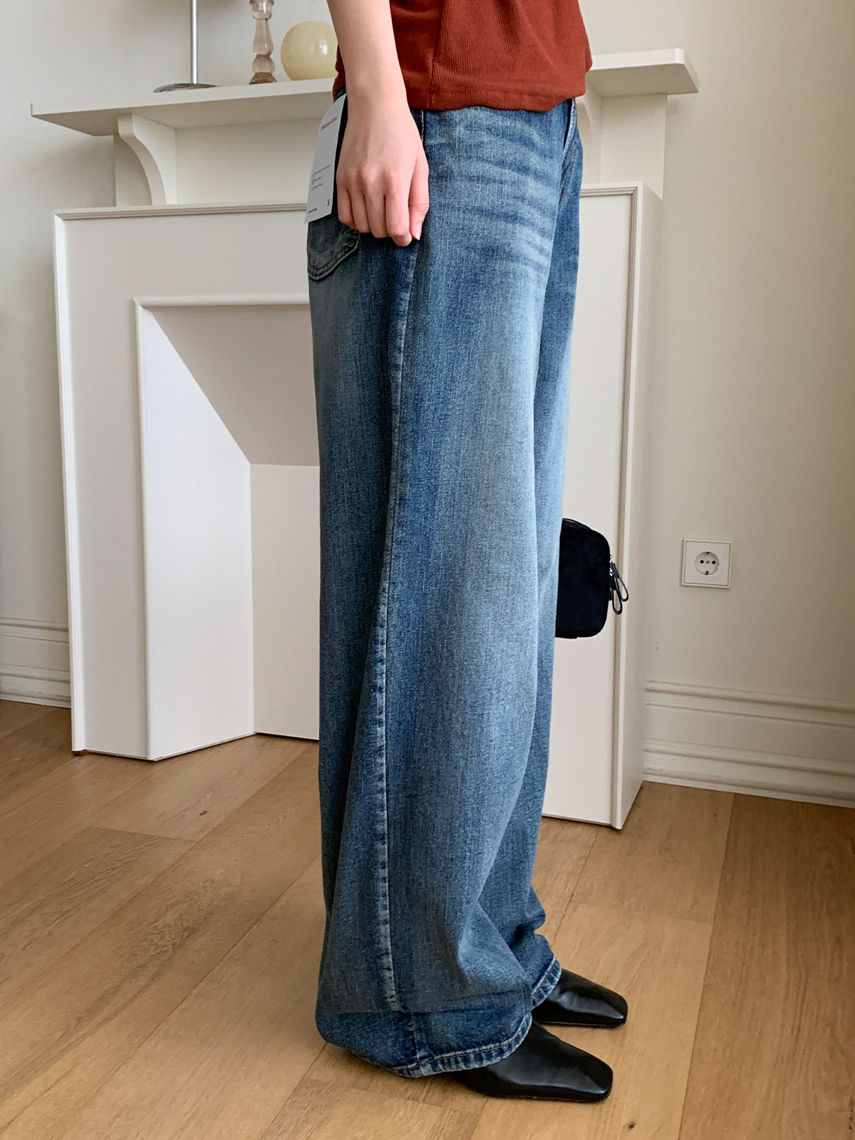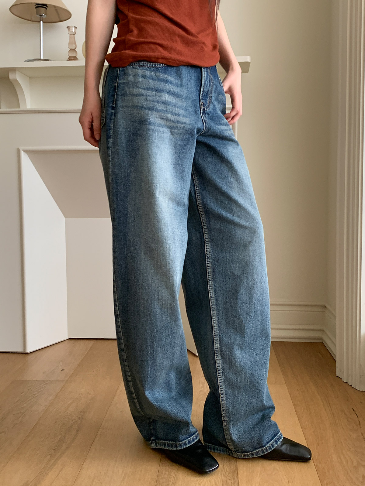 유니크한 커브드 라인으로 떨어지는 빈티지 워싱 와이드 데님 팬츠