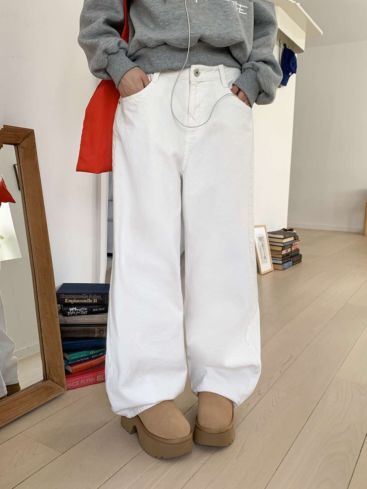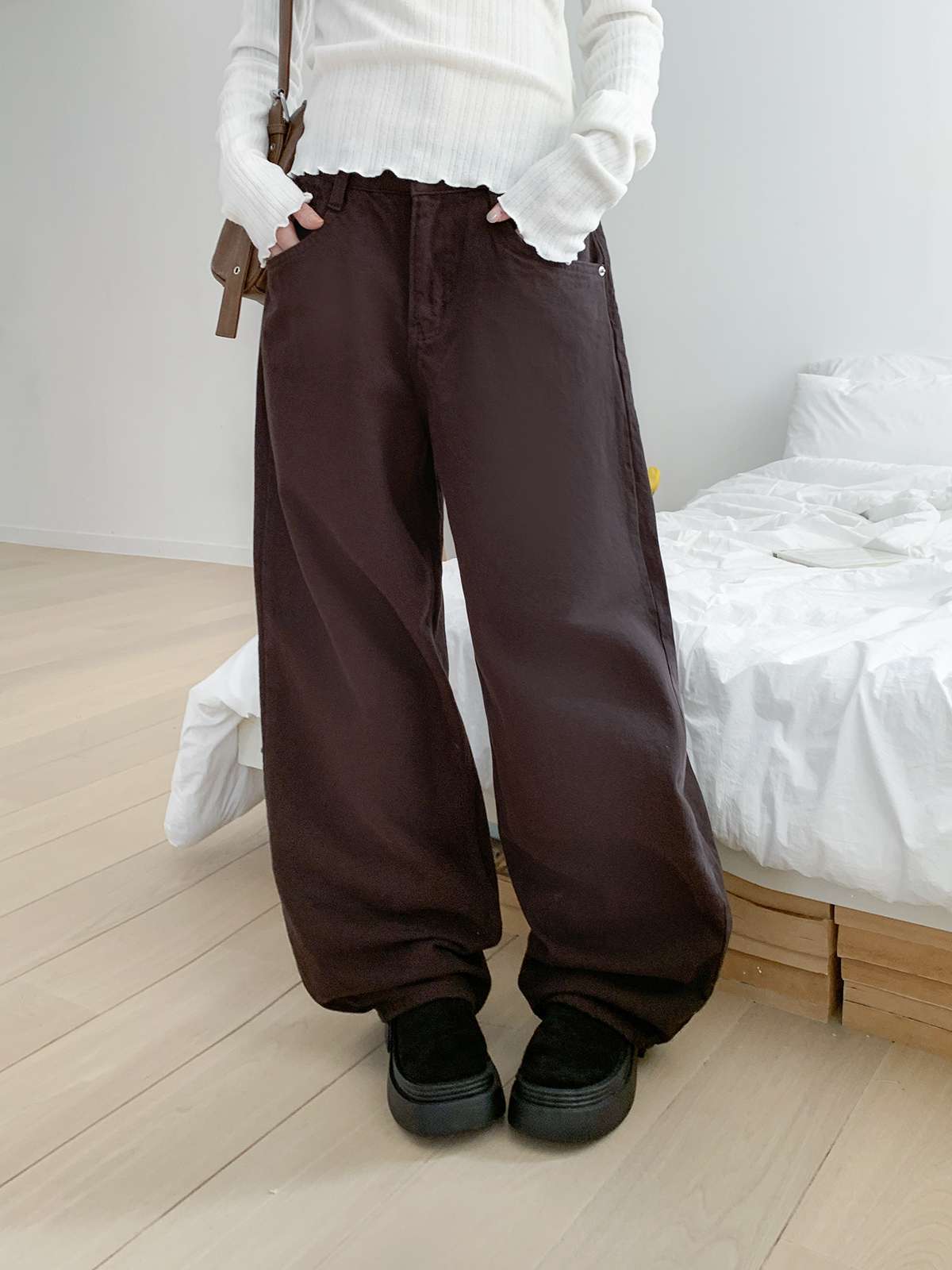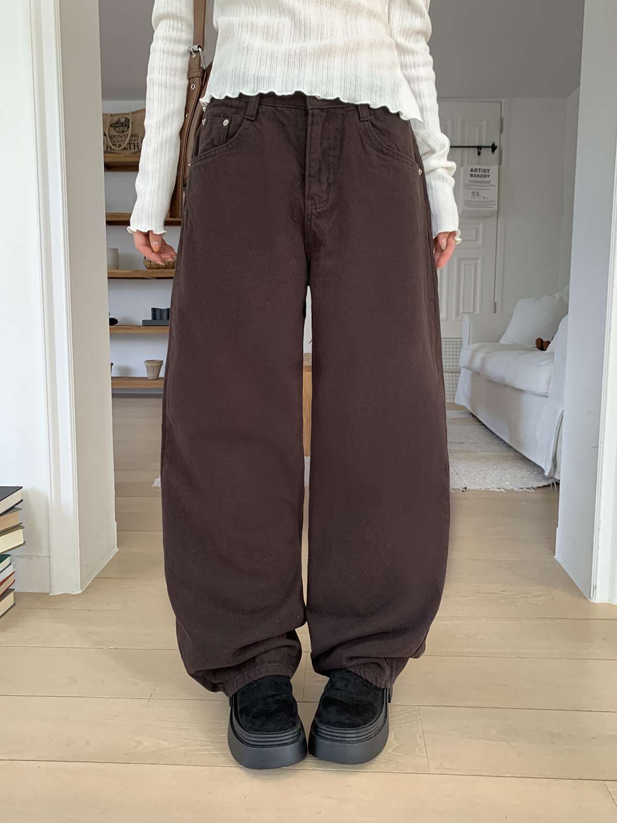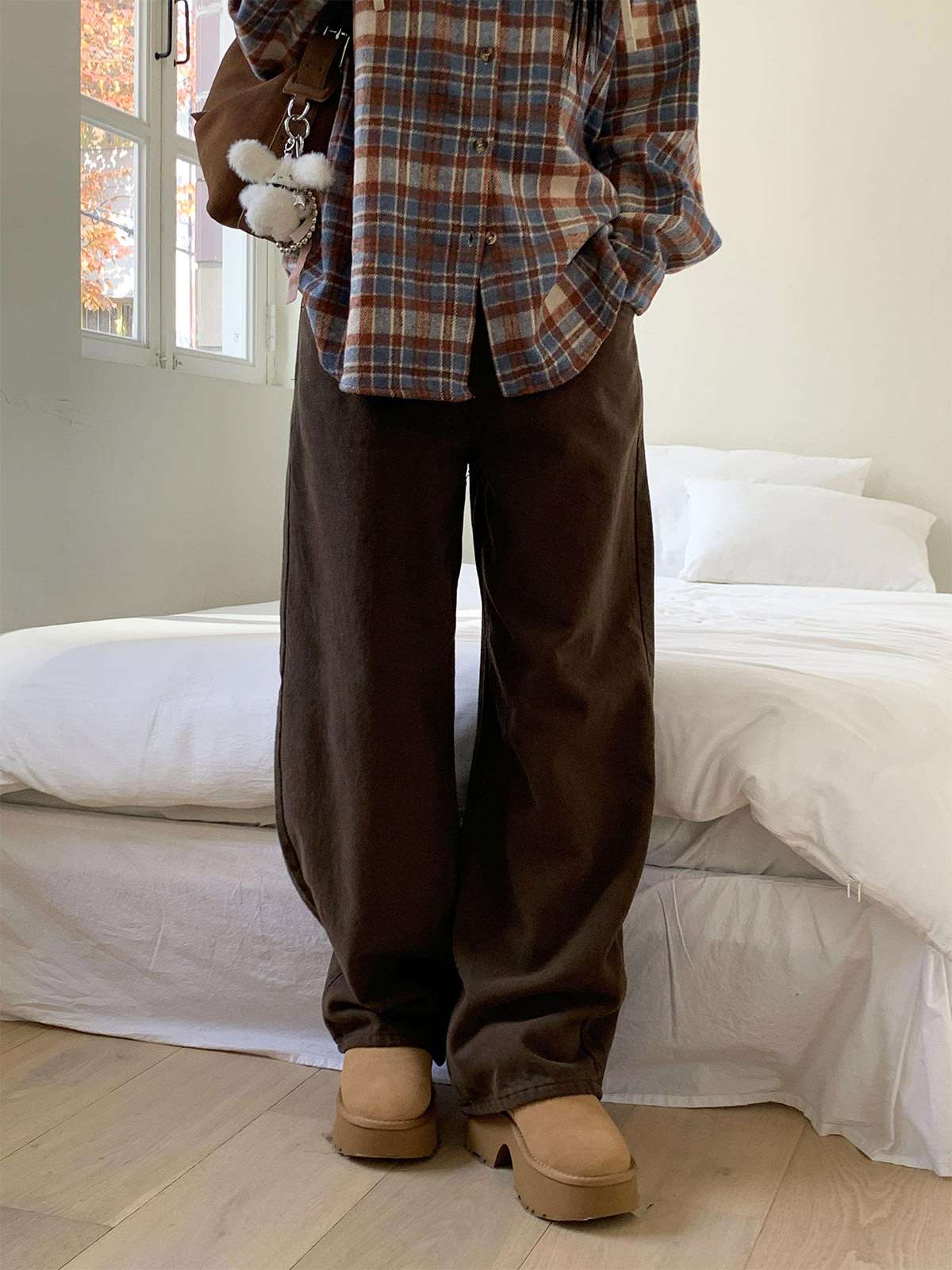 넉넉하게 떨어지는 와이드한 실루엣이 매력적인 피치 기모 코튼 팬츠