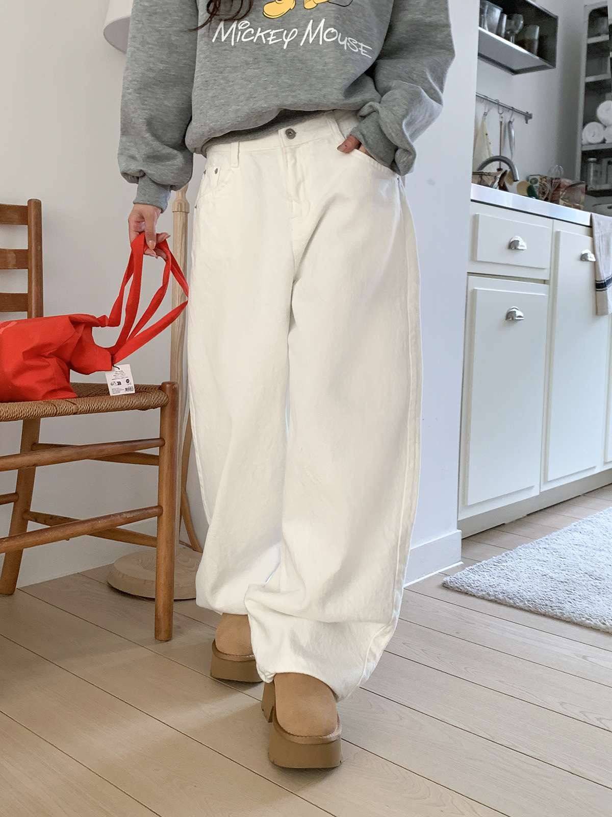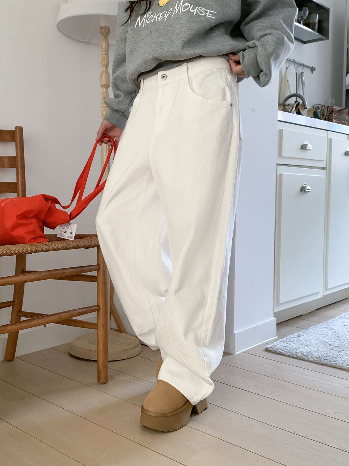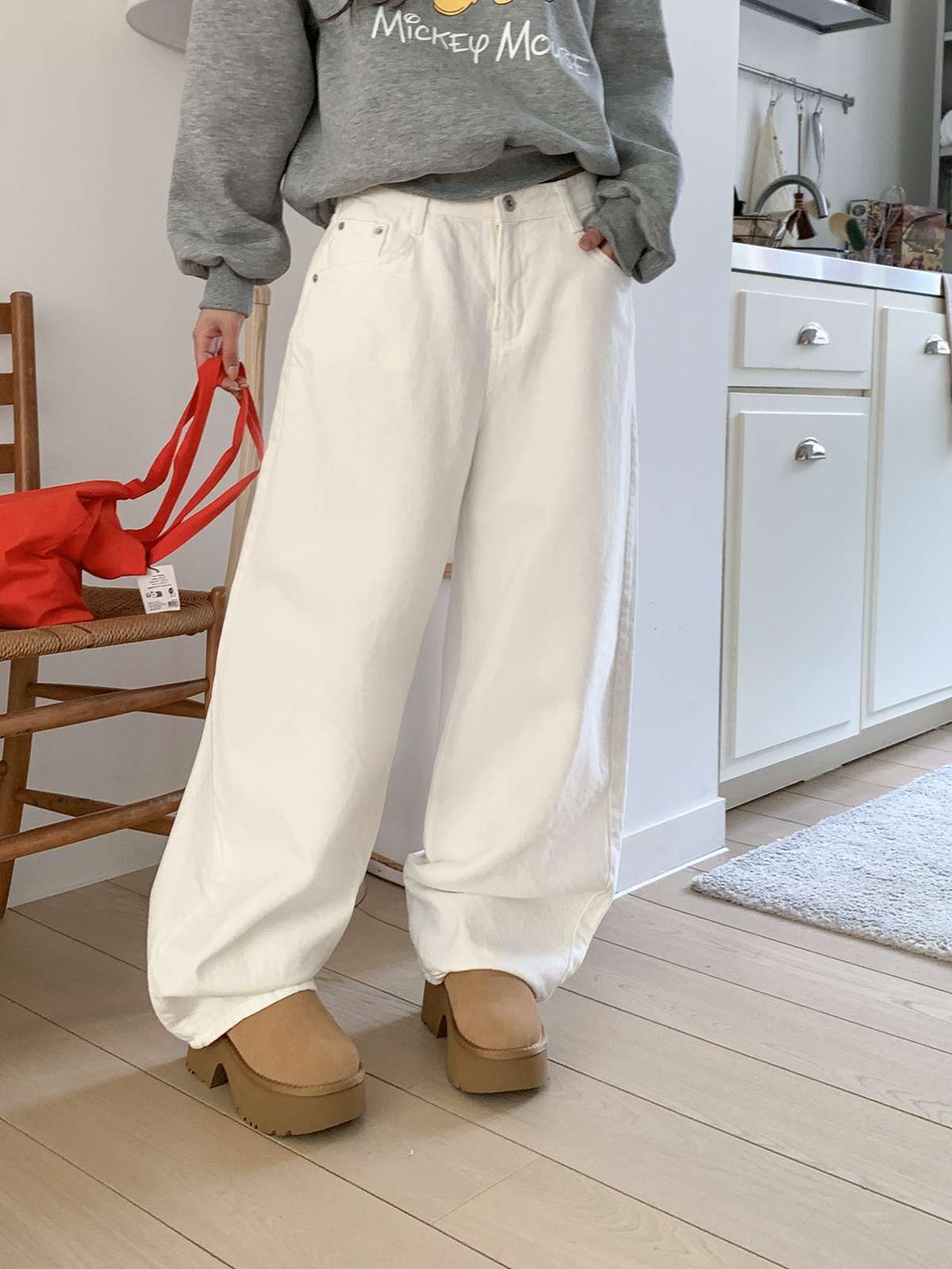 넉넉하게 떨어지는 와이드한 실루엣이 매력적인 피치 기모 코튼 팬츠