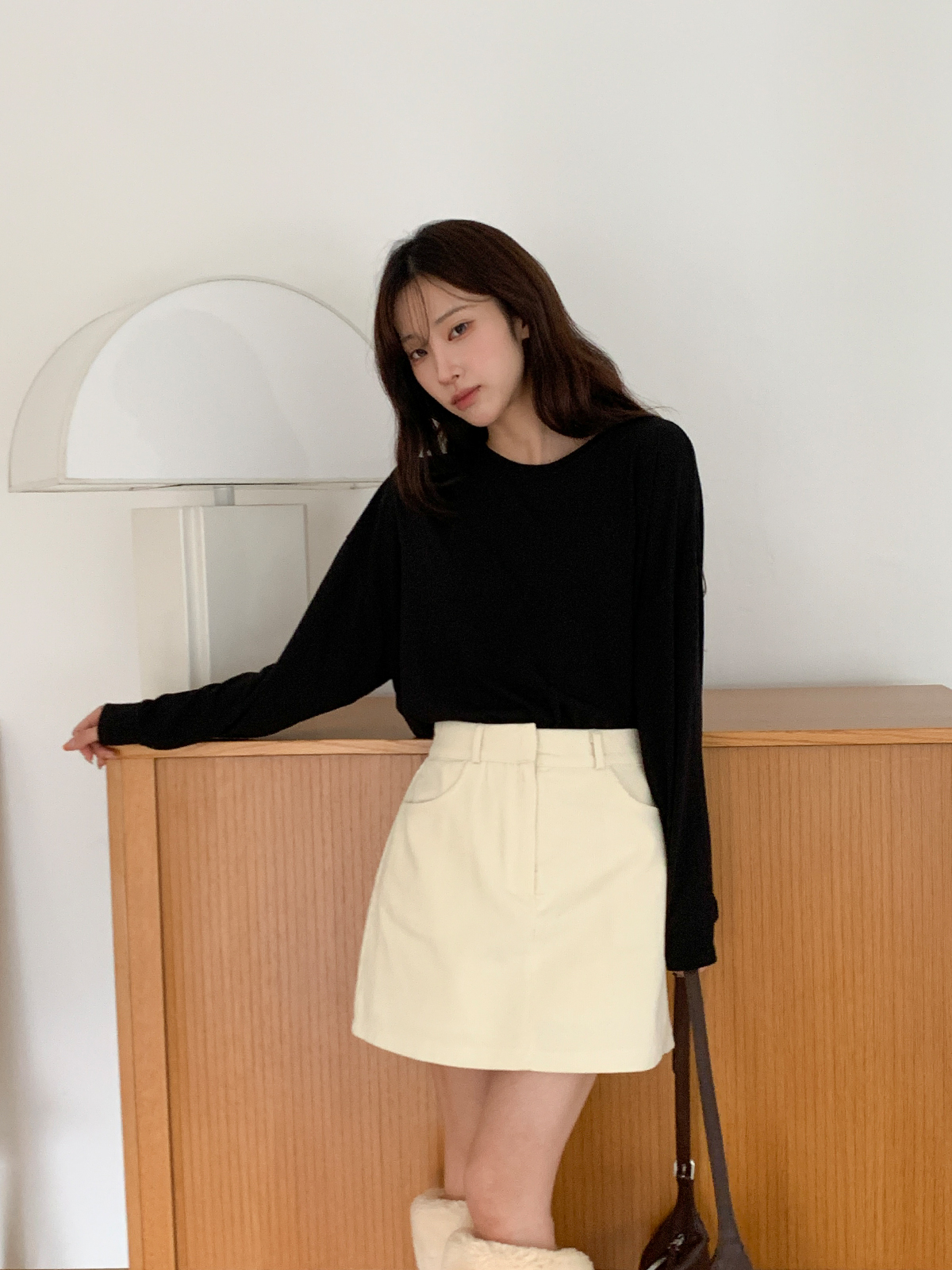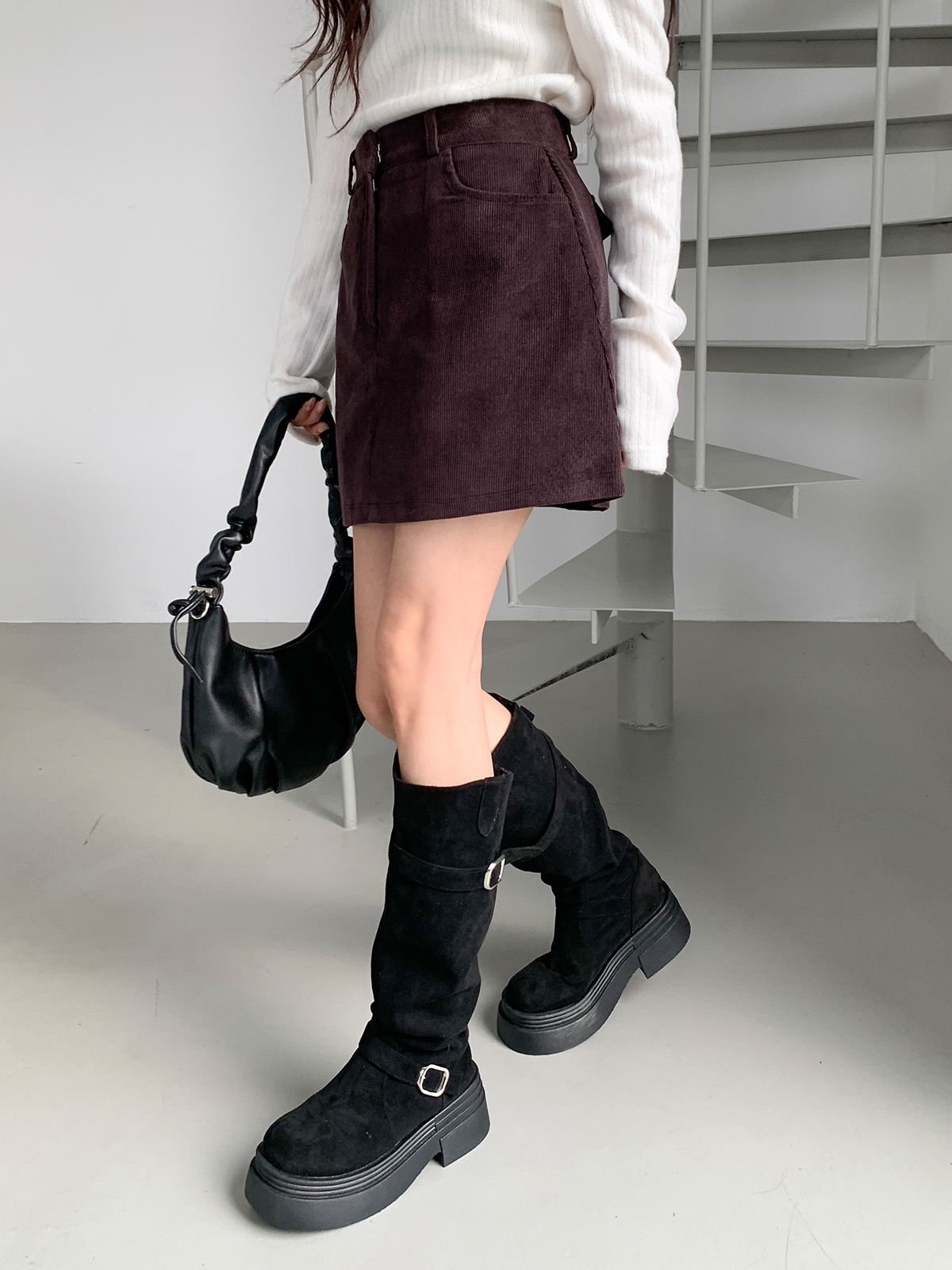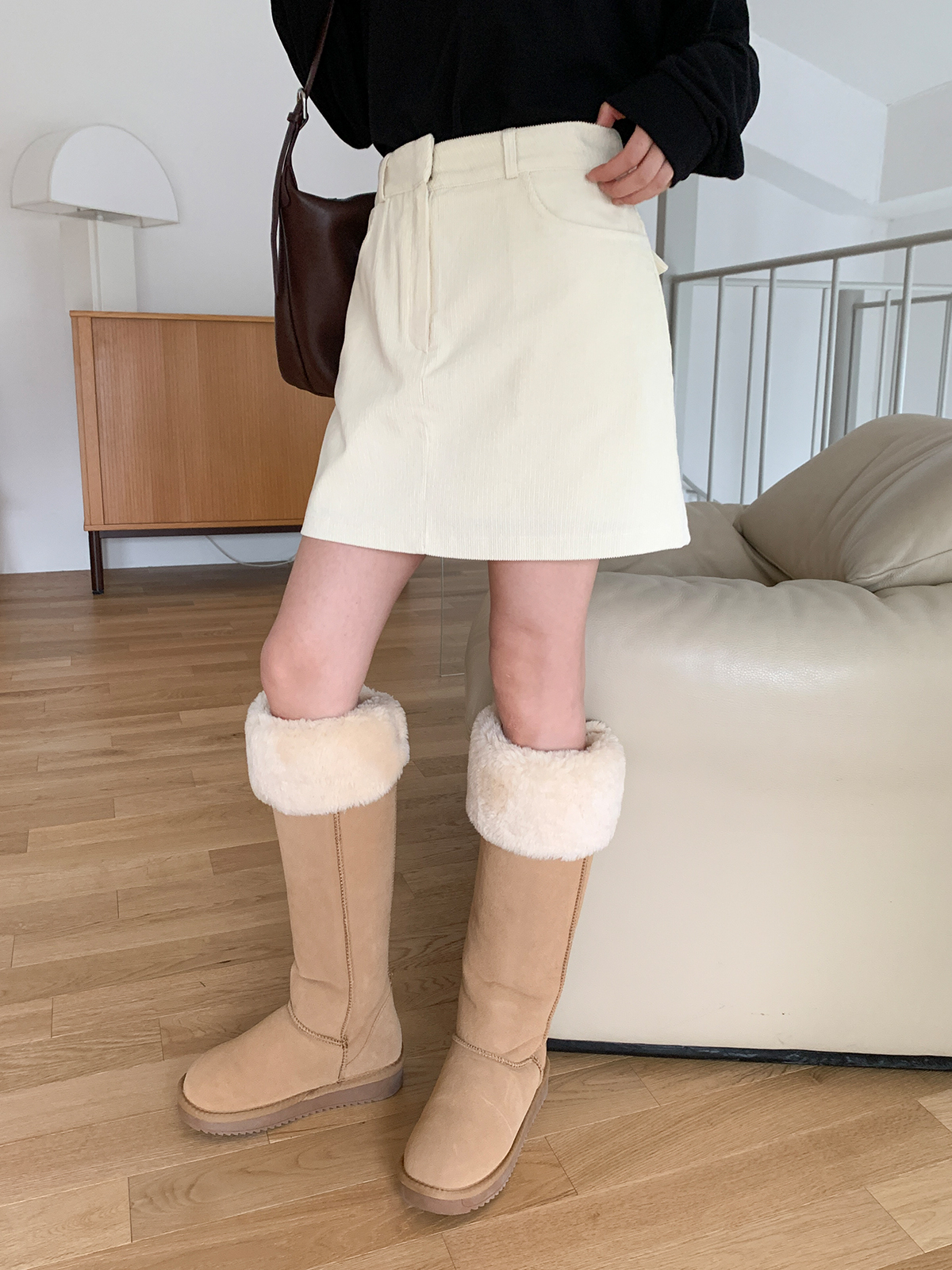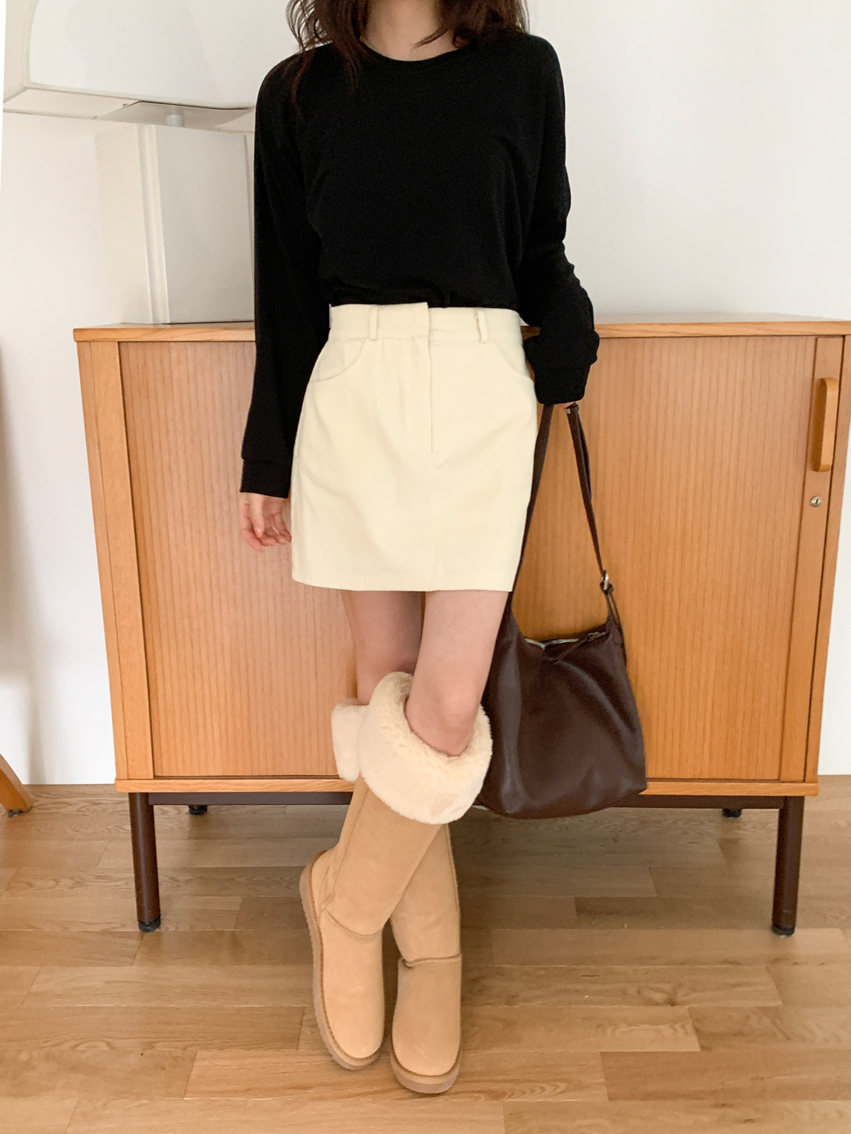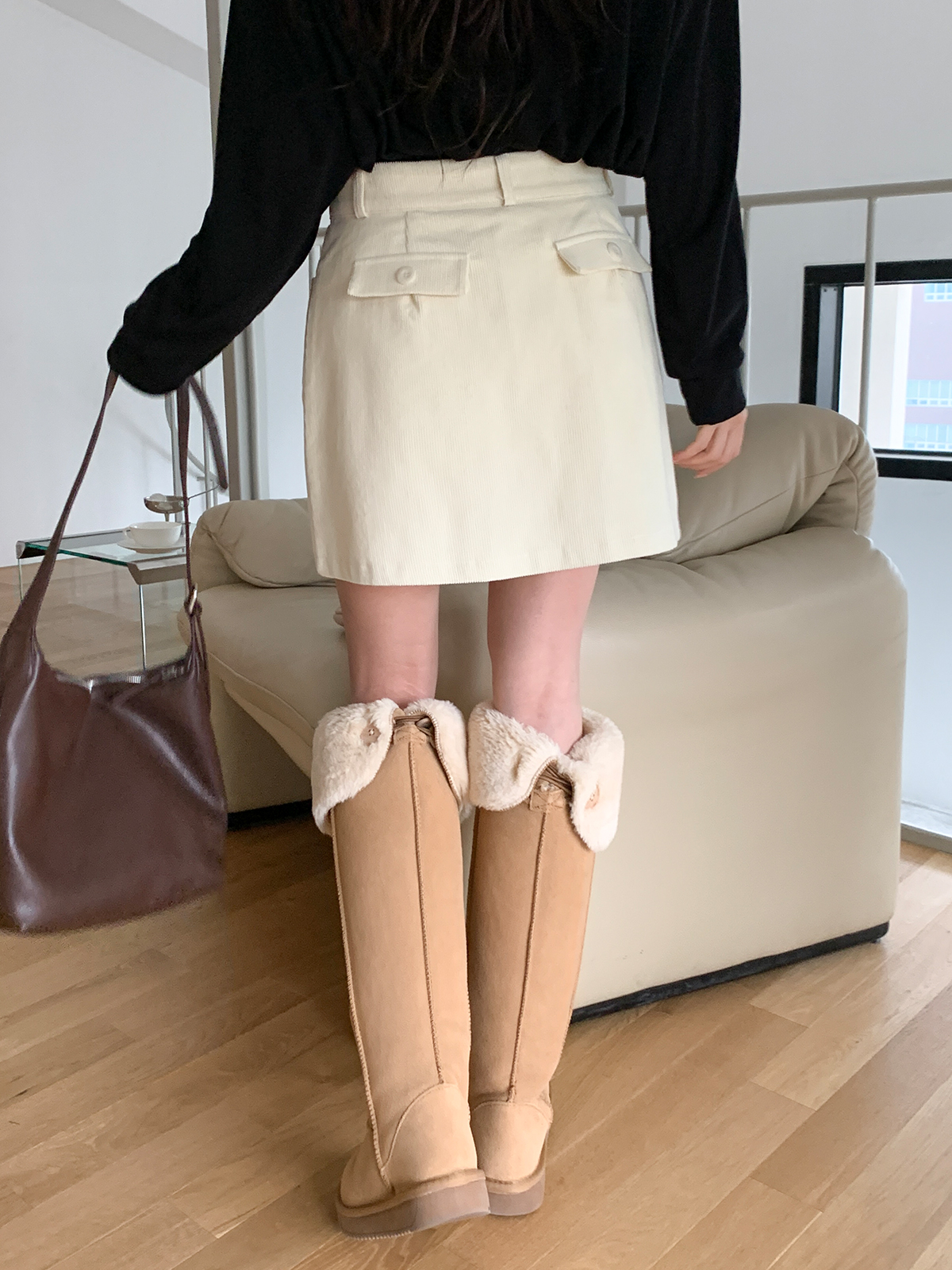 깔끔한 A라인 핏과 앞쪽의 포켓 디테일이 포인트인 코듀로이 치마바지