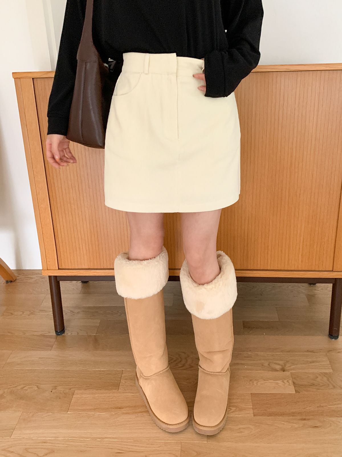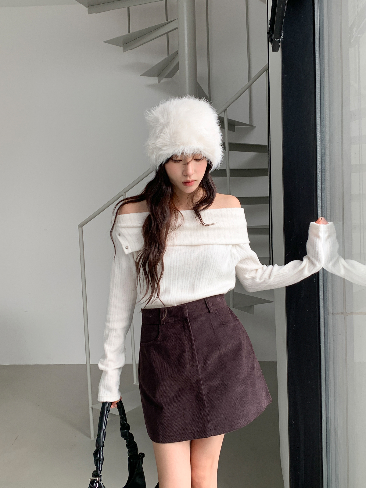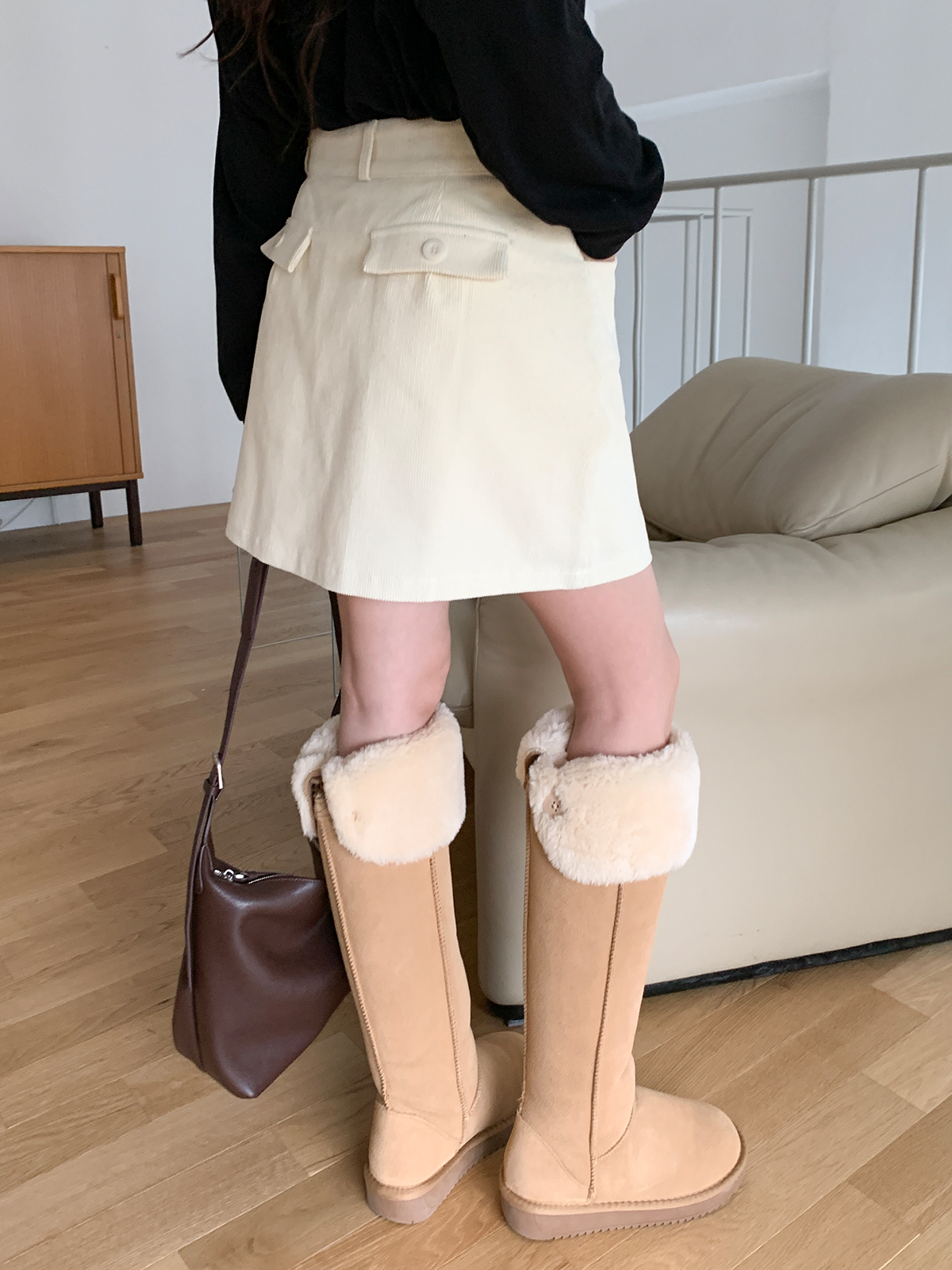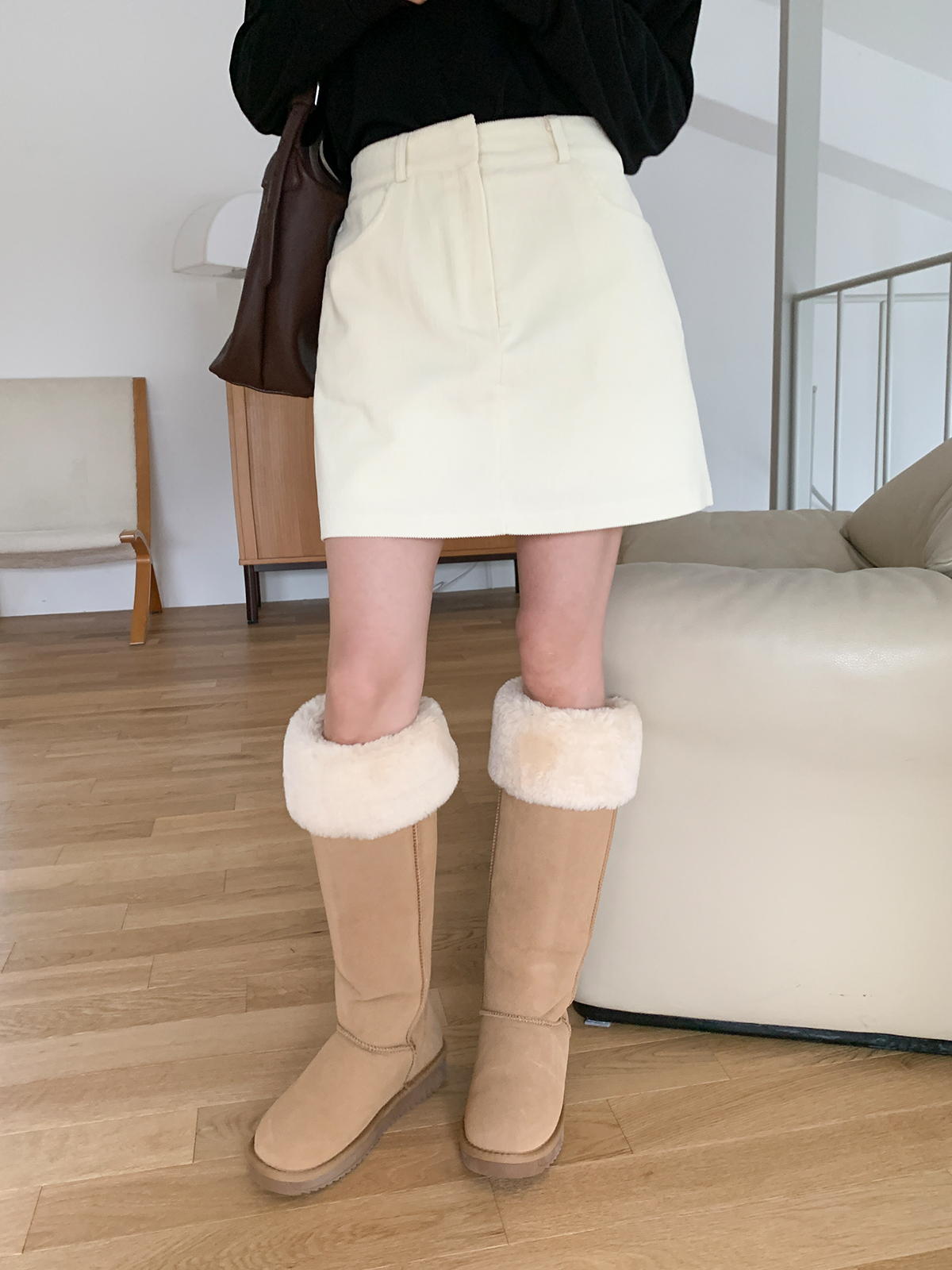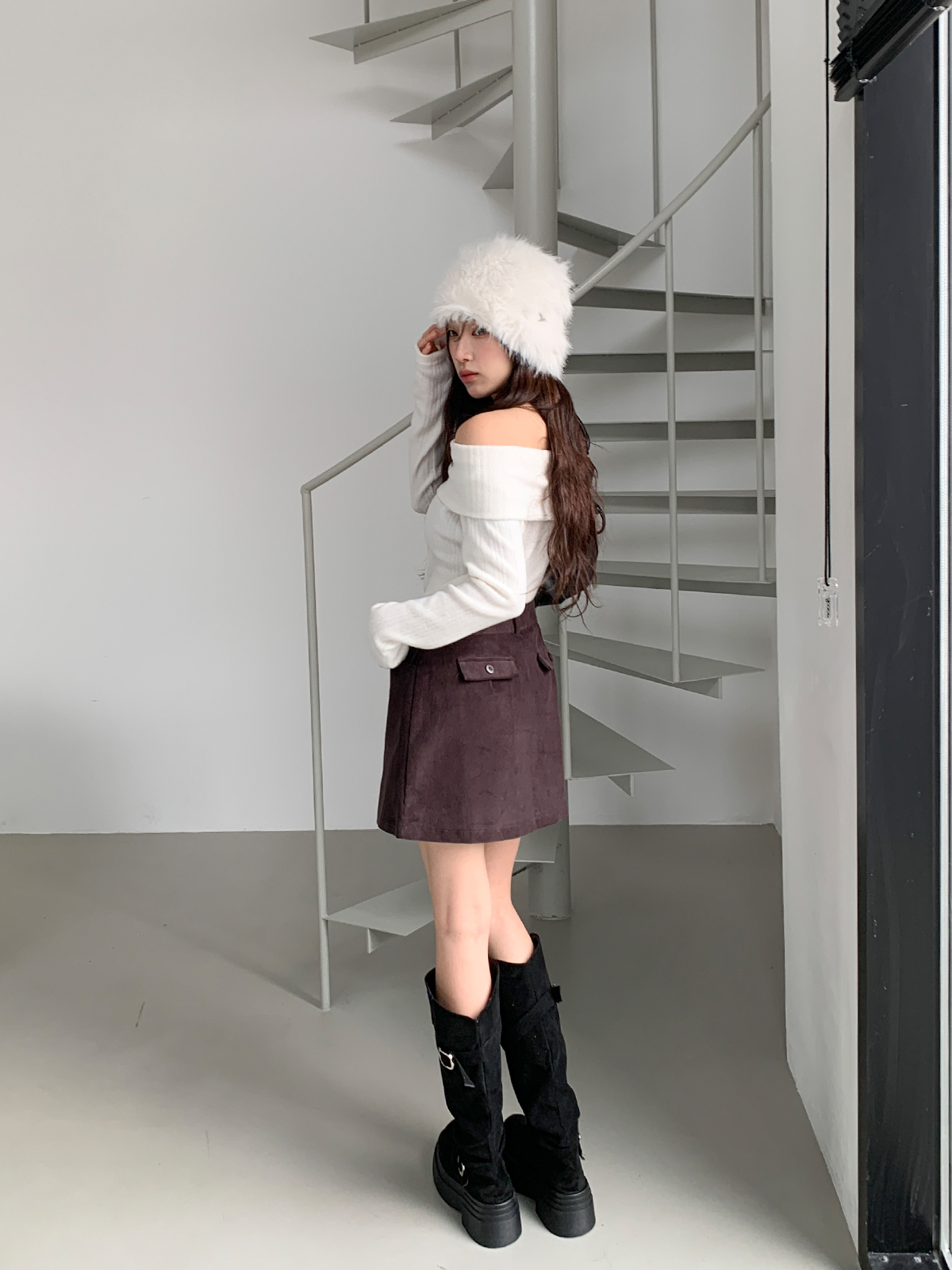 깔끔한 A라인 핏과 앞쪽의 포켓 디테일이 포인트인 코듀로이 치마바지